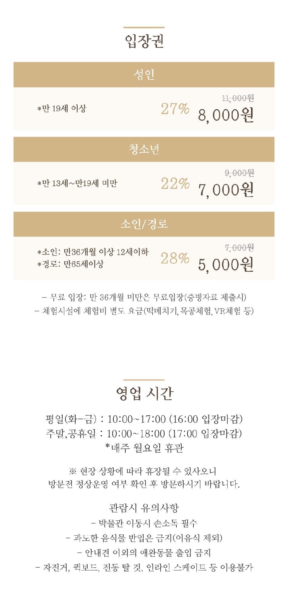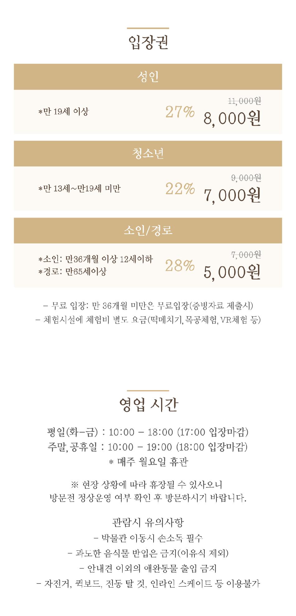 * 주차 : 해당없음 * 운영시간 : 상세이미지 참고 * 입장마감 : 마감 1시간 전 * 주차여부 : 관람객에 한하여 무료 운영 * 무료입장기준 : - 36개월 미만 (증빙서류 지참시) - 중증장애인은 장애인요금으로 결제 입장 (동반 1인 무료) - 임산부는 산모 수첩 또는 임신 확인서 제시 時 할인 적용 - 다자녀 가족 할인은 증명서(다자녀(다둥이) 카드,가족관계증명서등)와 신분증 제출시 할인 적용 - 체험 시설에 체험비 별도 요금 ※ 운영정보는 현장 상황에 따라 변동될 수 있습니다.