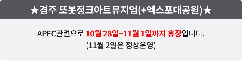 * 행사장 내 음식물 반입금지합니다. * 미취학 아동 반드시 보호자와 동반 입장 필수입니다. * 모든 연령대 입장 가능합니다. * 입장권으로 교환 후 환불 불가, 퇴장후에는 재 입장이 불가합니다. * 본 쿠폰은 현장에서 현금으로의 환불 및 카드 취소가 불가한 상품입니다. * 타 할인 쿠폰 및 카드 제휴 할인 등과 중복사용 불가 합니다. * 경주엑스포대공원 운영시간 : 10:00~18:00(입장마감 17:00) * 티켓 1장으로 또봇정크아트와 경주엑스포대공원 내 무료컨텐츠를 이용 가능한 티켓입니다.(유료콘텐츠 제외) * 방문시 경주엑스포대공원 매표소에 티켓 확인후 입장하며 또봇정크아트부터 이용 후 경주엑스포대공원 이용 가능합니다.