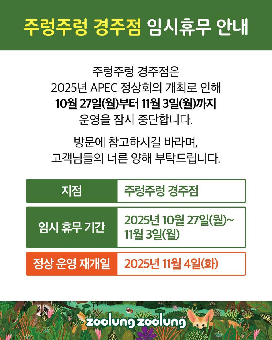 *1. 원하는 상품 구매 *2. 구매 1시간내 LMS 수신 *3. 경주점 주말(1층 매표소), 평일(3층 상품샵)에서 발권 후 3층 입구로 입장 -★발권 시, 문자로 수신 받은 모바일 바코드를 제시해주세요! *4. 주렁주렁 즐기기 *5. 구매 후 당일 사용 가능하며, 원활한 입장을 위해 이용 전 여유 있게 구매 바랍니다. -※2025 APEC 정상회의 개최로 10월27일~11월3일 운영 중단되오니 이용에 참고 바랍니다.