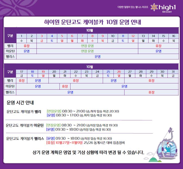 * 위치 : 마운틴 스키하우스 3층 * 운영시간 : 운영시간 09:30 ~ 18:00 (승차 탑승마감 16:30) * 대인 : 중등생 이상 * 소인 : 24개월 ~ 초등학생 이하 / 유아(24개월 미만) 무료 * 코스안내 - 하이원 운탄고도 케이블카 마운틴 : 마운틴 스키하우스 ↔ 하이원탑 (왕복 40분 소요) * ※ 기상 및 영업상황에 따라 운영일정(영업시간)이 변경 될 수 있습니다.