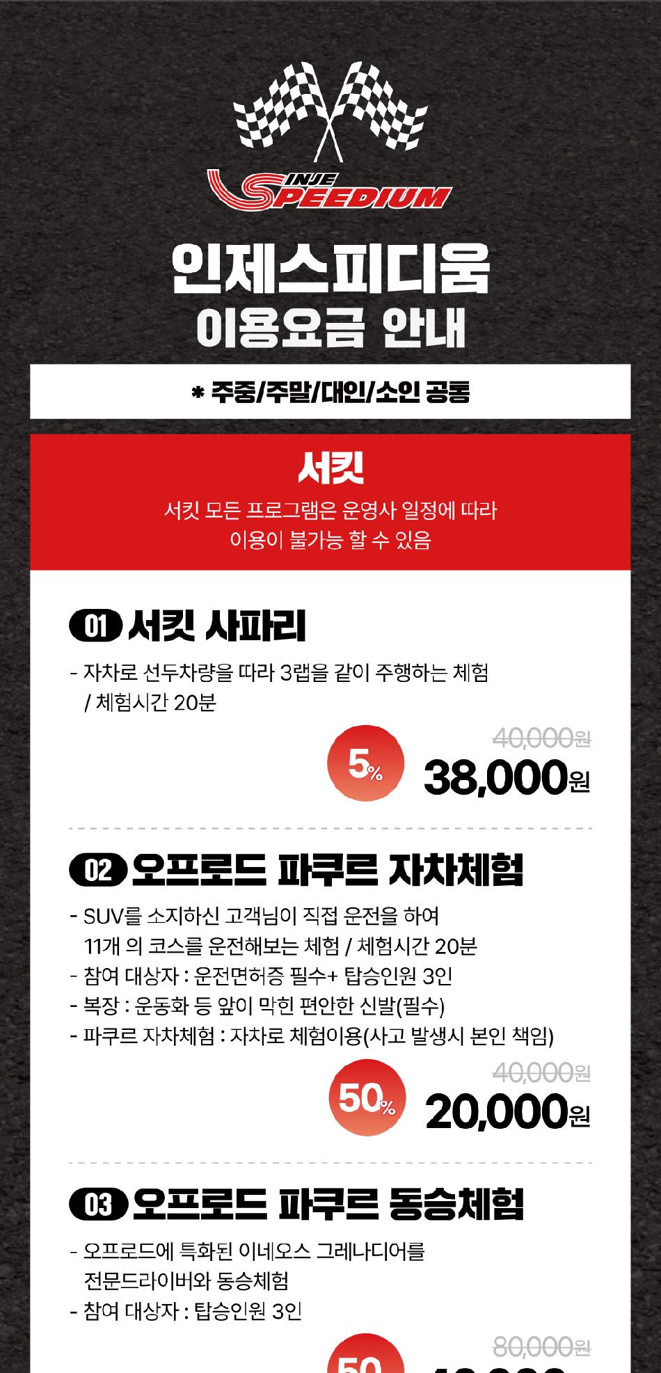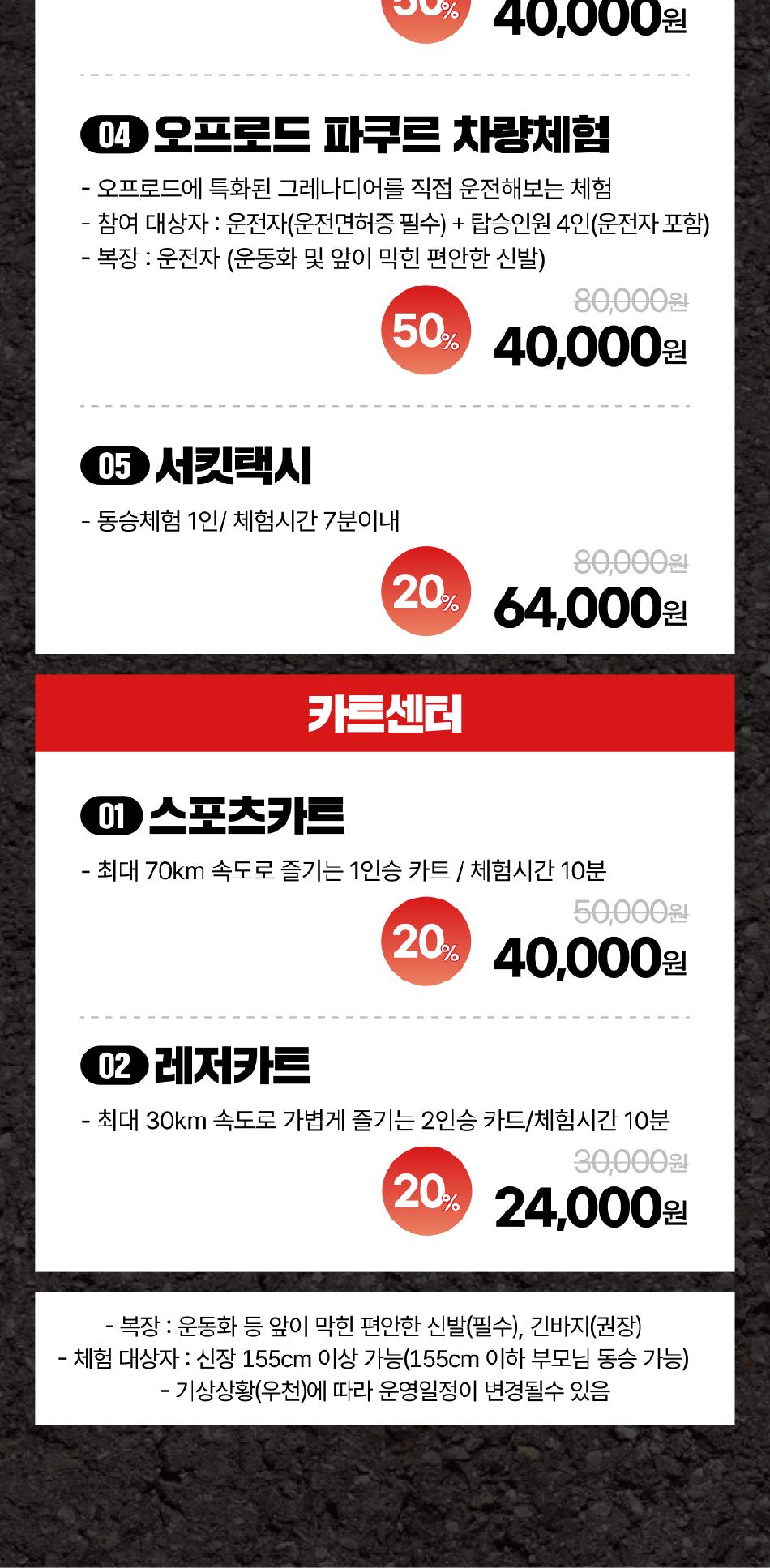 * 기간 중 타임별 1인 1체험권 필수입니다. * 구매 후 체험시작시간 15분 전 도착 부탁드립니다. * 서킷 - 복장 : 운동화(필수), 긴바지(필수), 헬멧(필수) * 카트 - 복장: 운동화 등 앞이 막힌 편안한 신발 (필수), 긴바지 (권장) - 참여대상자: 신장 155cm 이상 가능 (155cm 이하 부모님과 동승가능)