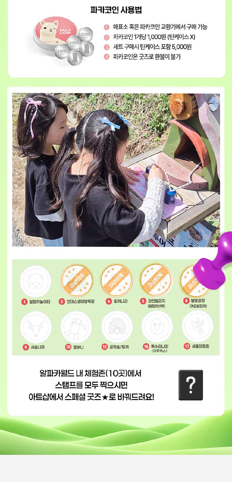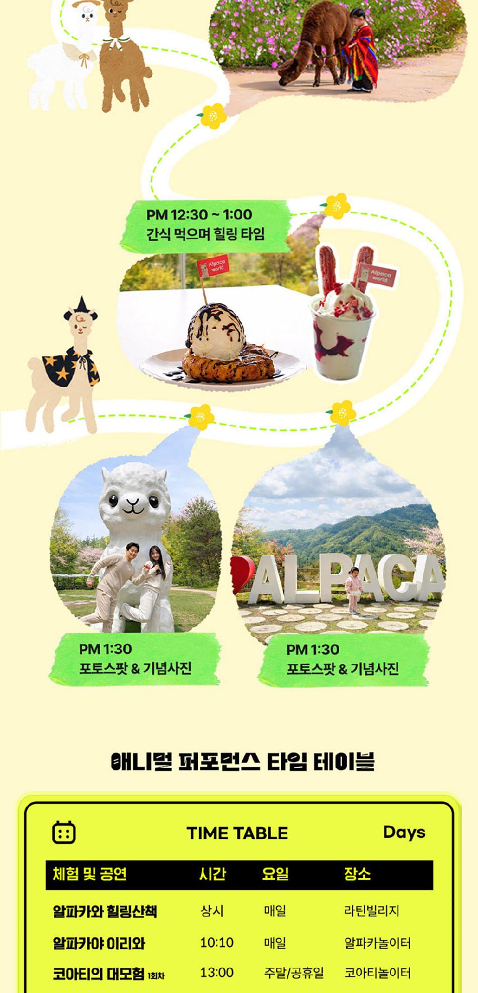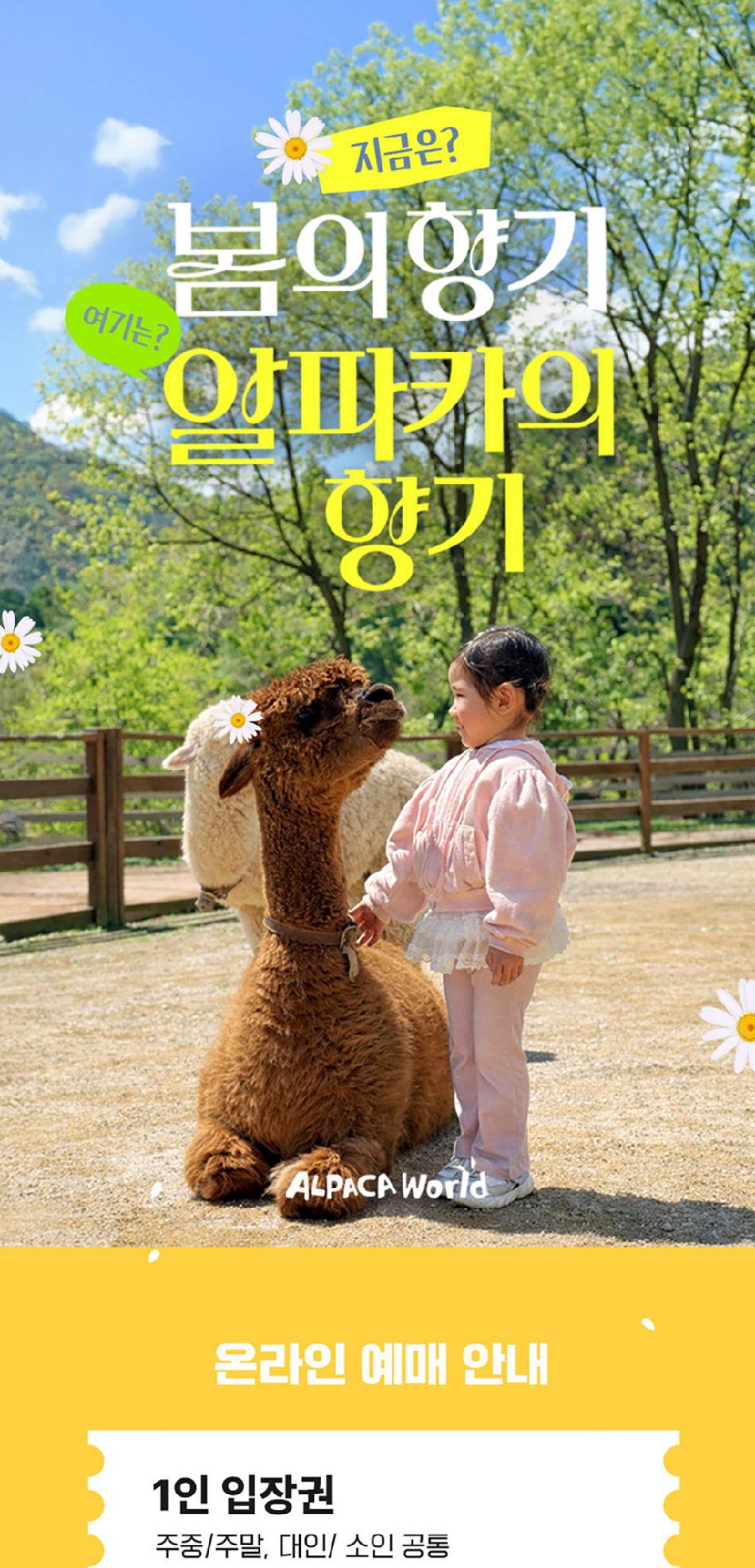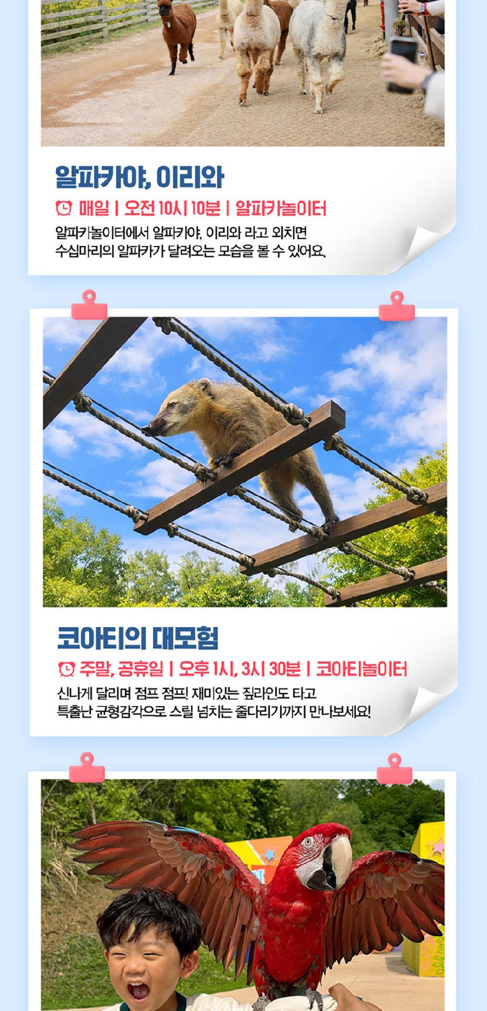 * 알파카야 이리와 이벤트는 매일 오전 10시 10분에 시작이며, 10시까지 입장해주셔야 참여 가능합니다. * 동물들의 안전을 위해 음식물 및 반려동물의 출입이 제한됩니다(맹인 안내견 제외) * 분실물 문의는 으로 연락 주시면 신속하게 처리해 드리겠습니다. * 동물 알레르기가 있으신 분들은 체험 보다는 관람 하시는 것을 권유드립니다. * 주차공간이 충분히 마련되어 있으며 주차비는 무료입니다. * 알파카와 힐링산책은 현장에서 별도 구매가 필요합니다. * 먹이체험시, 필요한 먹이는 파카코인 구매 후 코인을 이용해 구매부탁드립니다.(파카코인 1개당 먹이주기 체험 1회분) * 파카코인은 매표소(카드 및 현금 가능)/체험존파카코인교환기(현금만가능)를 통해 구매 가능합니다.(1,000원당 파카코인1개 지급) * 경로우대 및 복지카드 소지자는 현장에서 입장권을 구매해주시기 바랍니다.
