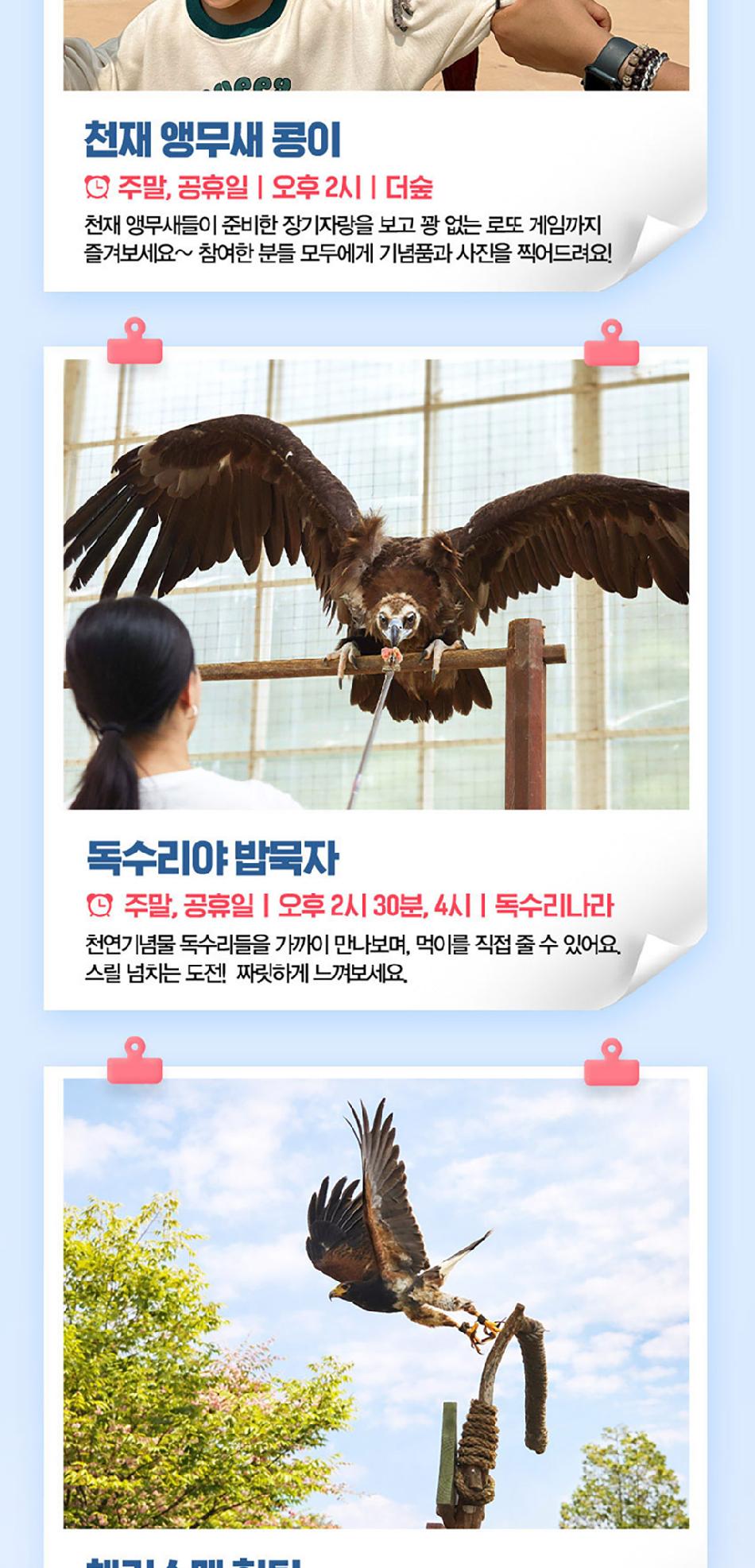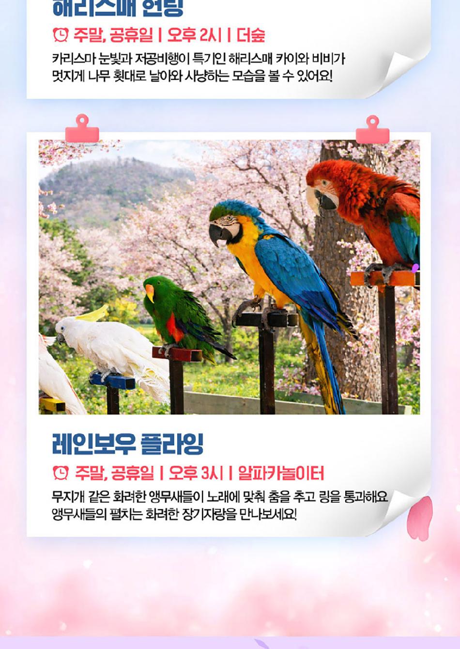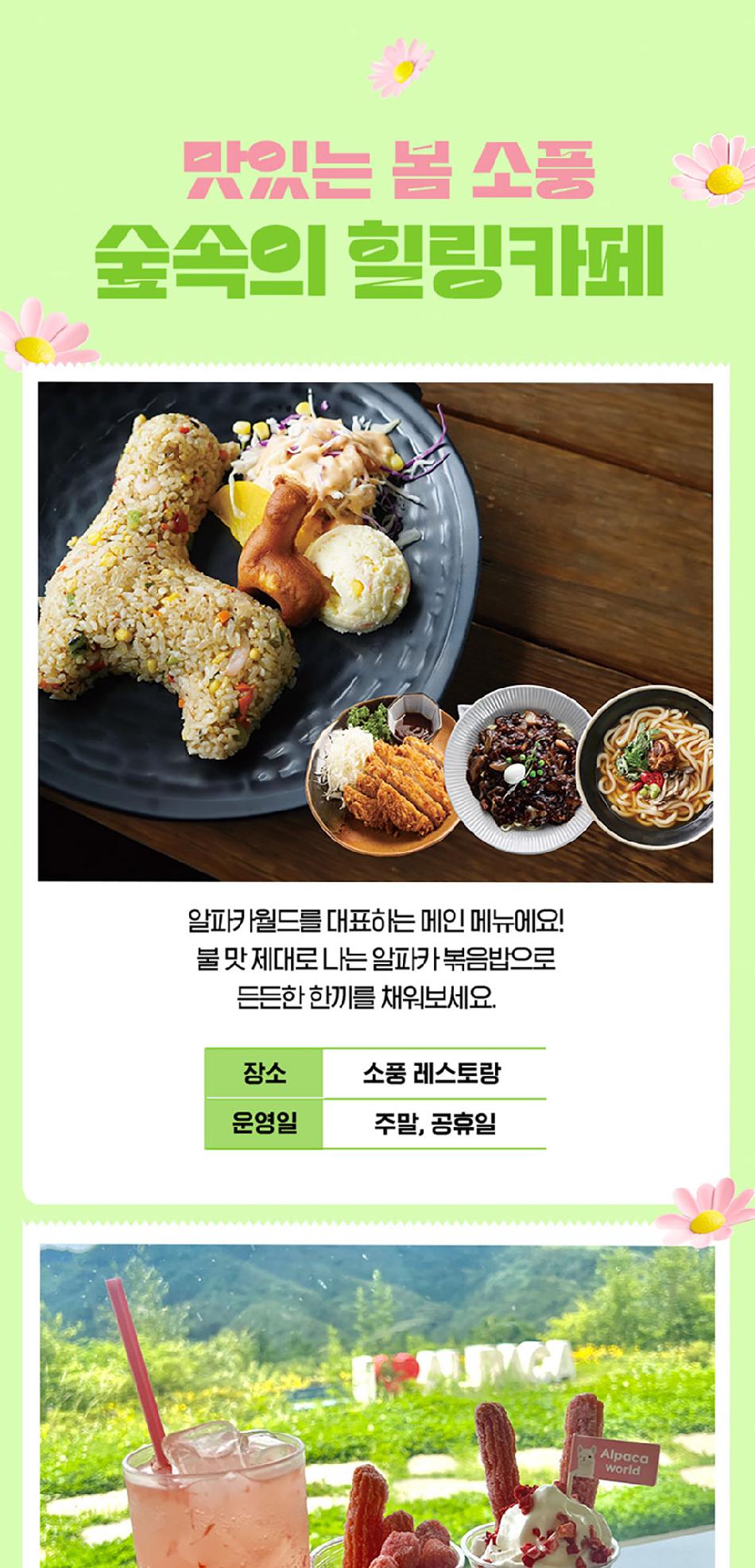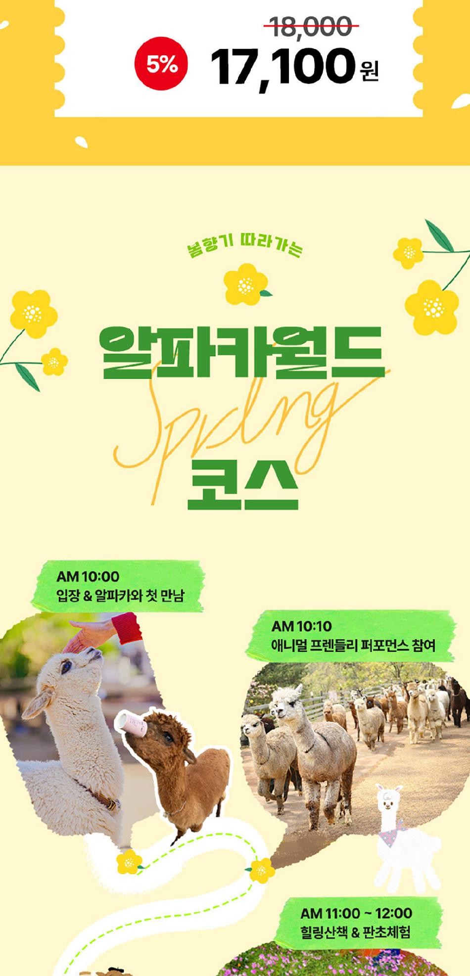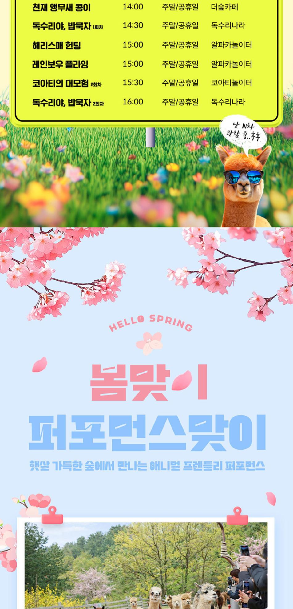 * 알파카야 이리와 이벤트는 매일 오전 10시 10분에 시작이며, 10시까지 입장해주셔야 참여 가능합니다. * 동물들의 안전을 위해 음식물 및 반려동물의 출입이 제한됩니다(맹인 안내견 제외) * 분실물 문의는 으로 연락 주시면 신속하게 처리해 드리겠습니다. * 동물 알레르기가 있으신 분들은 체험 보다는 관람 하시는 것을 권유드립니다. * 주차공간이 충분히 마련되어 있으며 주차비는 무료입니다. * 알파카와 힐링산책은 현장에서 별도 구매가 필요합니다. * 먹이체험시, 필요한 먹이는 파카코인 구매 후 코인을 이용해 구매부탁드립니다.(파카코인 1개당 먹이주기 체험 1회분) * 파카코인은 매표소(카드 및 현금 가능)/체험존파카코인교환기(현금만가능)를 통해 구매 가능합니다.(1,000원당 파카코인1개 지급) * 경로우대 및 복지카드 소지자는 현장에서 입장권을 구매해주시기 바랍니다.