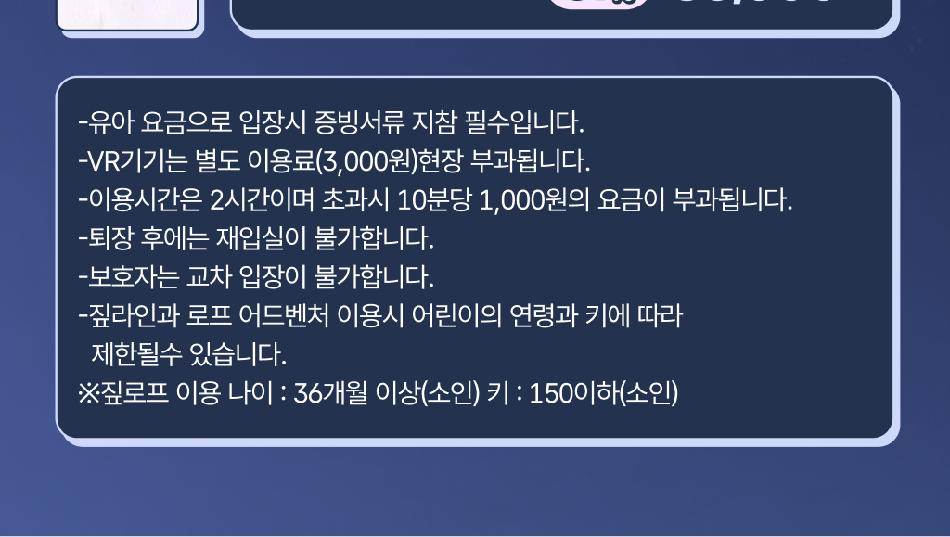 * 운영시간 - 매일 : 10:00~19:00 * 휴무일 : 롯데아울렛구리점 정기 휴점일과 동일 * 주차 : 무료 * 주차여부 : - 롯데아울렛 구리점 지하 주차장 이용 시 3시간 무료 - (카운터에서 차량번호 등록 필요) - 시간 초과 시 10분당 500원, 1일 20,000원 - 단, 롯데마트에 주차하시면 유료입니다. * 무료입장기준 : 12개월 미만 (증빙서류 지참 필수) * ※ 운영정보는 현장 상황에 따라 변동될 수 있습니다.