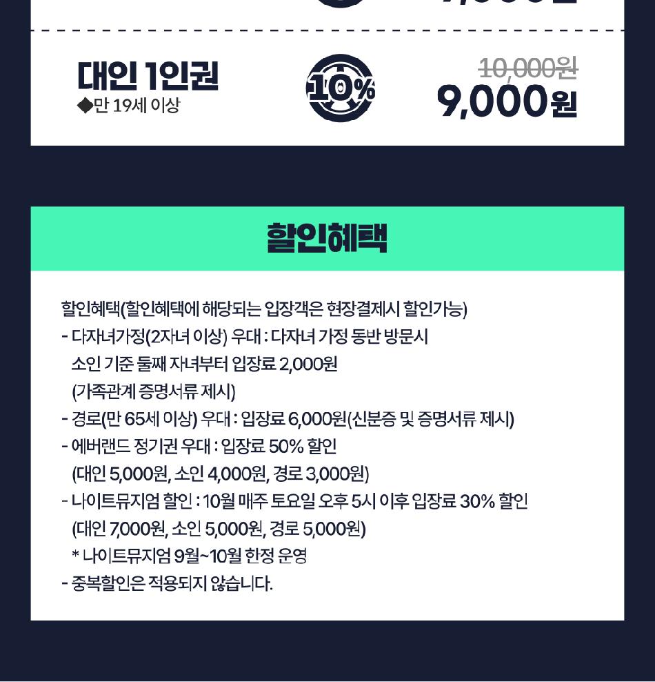 * ※ 다자녀가정(2자녀 이상) 우대 : 다자녀 가정 동반 방문시 소인 기준 둘째 자녀부터 입장료 2,000원(가족관계 증명서류 제시)