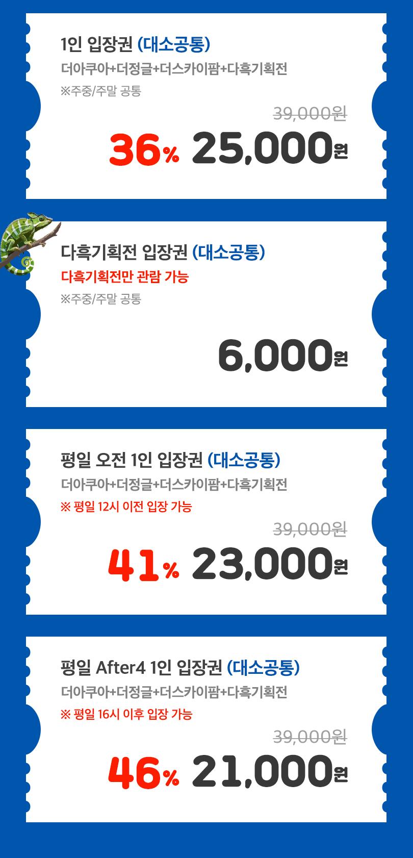 [이용안내] * 모든 권종 재입장 불가능 * 36개월 미만 유아는 무료 입장 가능(증빙서류 필수 지참) * 관람장 내 웨건(유아용 포함) 반입이 불가하니 양해 부탁드립니다.