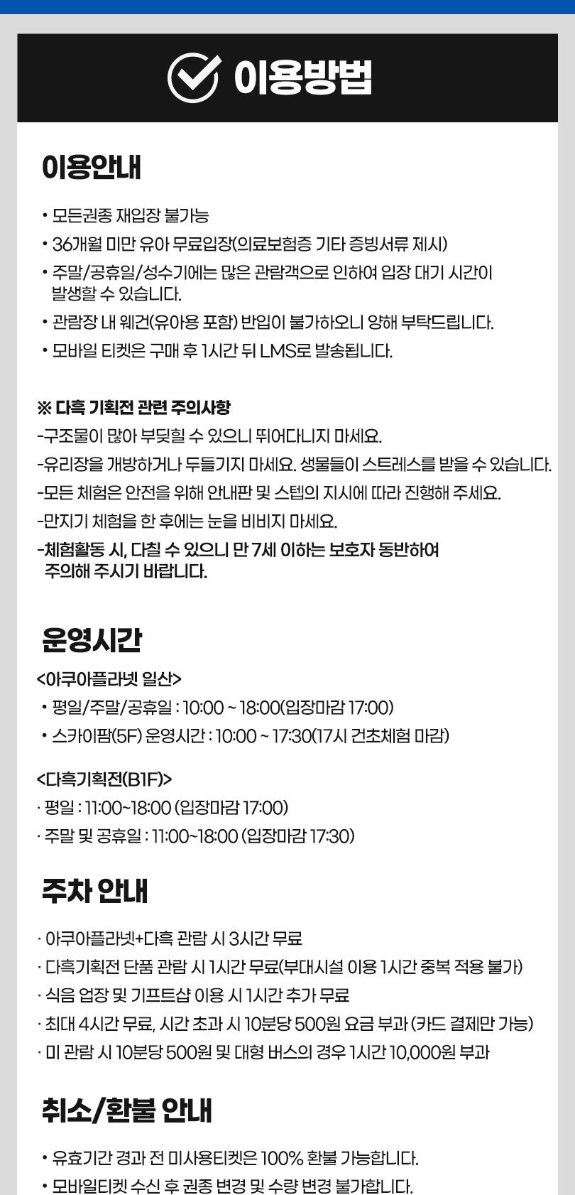 [주차안내] * 아쿠아플라넷+다흑 관람 시 3시간 무료 (인증 요청) * ‘다흑기획전 단품 관람 시 1시간 무료(부대시설 이용 1시간 중복 적용 불가) * 식음업장 및 기프트샵 이용 시 1시간 추가 무료 * 최대 4시간 무료, 시간 초과 시 10분당 500원 요금 부과 (카드 결제만 가능) * 미 관람 시 10분당 500원 및 대형 버스의 경우 1시간 10,000원 부과 * 사전 정산 방법 : 1층 로비 사전 정산기 이용 (카드 전용)