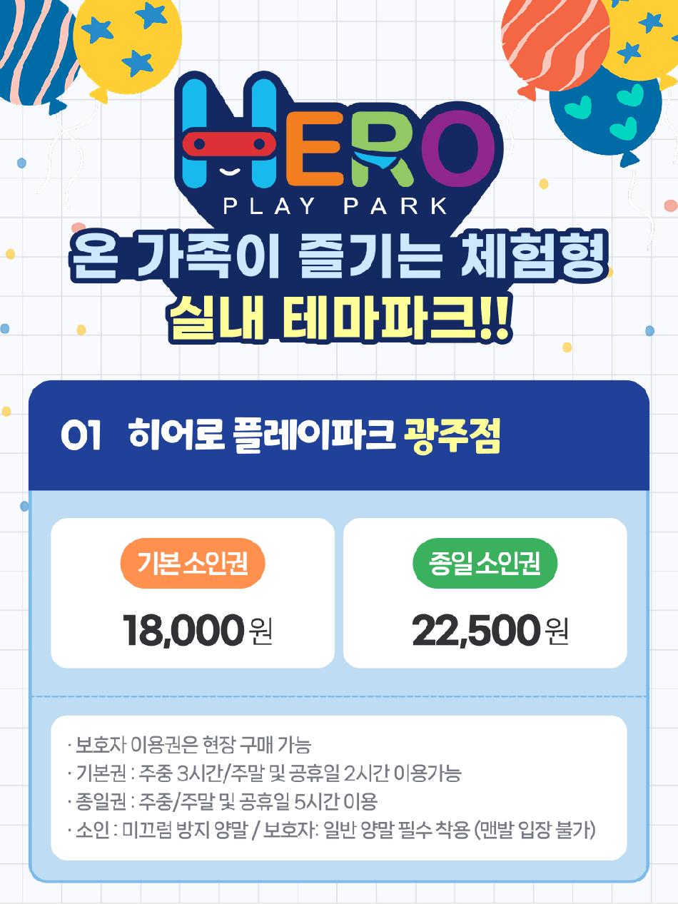* 종일권은 주중 / 주말 및 공휴일 5시간 이용 가능합니다. * 소인 미끄럼방지 양말, 보호자 일반 양말 및 미끄럼방지 양말 필수착용 (맨발입장 불가) * 11세 미만 보호자 동반 필수 * 11세 이상 (만 10세) 부터는 보호자 미동반 동의서 작성 후 단독 입장 가능 * 만 19세 이상부터 보호자 입장권 구매 및 입장 가능 (만 18세 이하는 보호자 역할 불가) * 만 19세 미만까지 소인 요금 적용됩니다. * 보호자 이용권은 현장에서 구매 후 이용 가능합니다. * 일부 시설물의 키/나이 제한 있습니다. * 애완동물 출입이 불가합니다. * 바퀴 달린 탑승기구와 유모차 반입 불가합니다. * 시설물 이용 시 외부 음식 반입과 취식이 불가합니다. * 상기 사항 적발 시 퇴장 처리됩니다. * 수용인원 초과 시 입장 대기가 있을 수 있습니다. * 일부 시설의 경우 추가 요금이 발생할 수 있습니다.