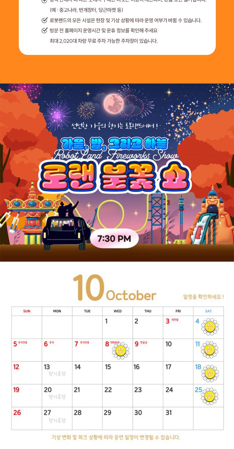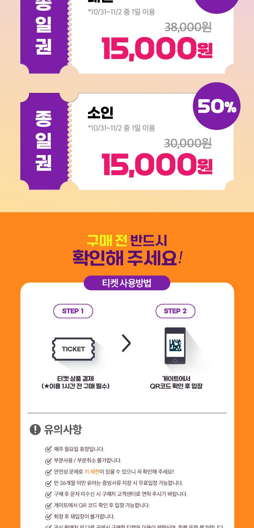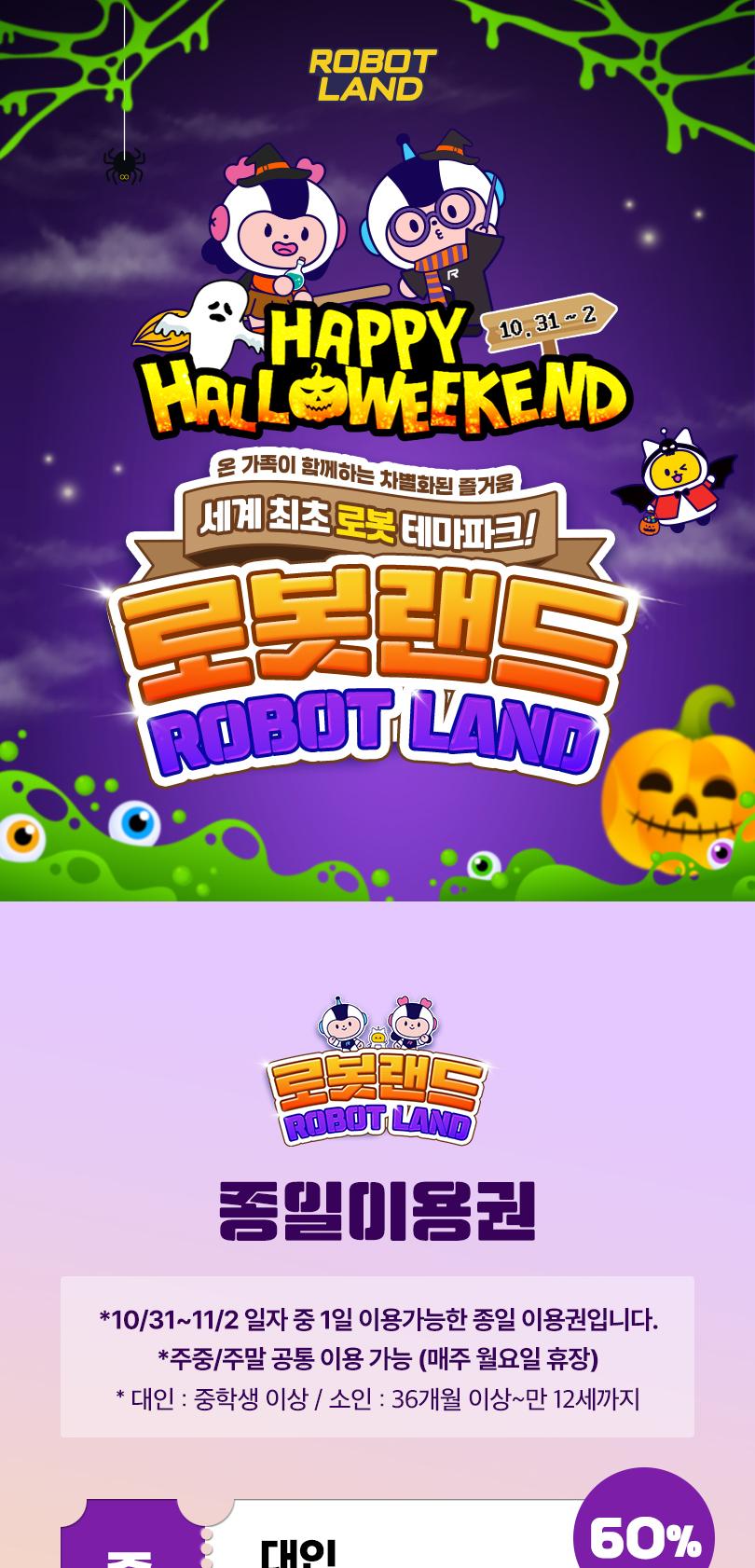 * 해당 티켓은 10/31~11/2 일자 중 1일 이용가능한 종일 이용권 입니다. * 로봇랜드 내 유료시설(공룡월드)은 별도 입장권 구매 후 이용 가능합니다. * 매주 월요일 휴장으로 이용에 불편이 없도록 참고 부탁드립니다. * 만 36개월 미만 유아는 증빙서류 지참시 무료입장 가능합니다. * 구매 후 문자 미수신 시 구매처 고객센터로 연락 주시기 바랍니다. * 수신하신 문자 내 QR코드를 통해 게이트 바로 입장 가능합니다. * 퇴장 후 재입장이 불가합니다. * 공식 판매처 외 다른곳에서 구매한 티켓은 이용이 제한되며, 환불 또한 불가합니다. - (예 : 중고나라, 번개장터, 당근마켓 등) * 로봇랜드의 모든 시설은 현장 및 기상 상황에 따라 운영 여부가 바뀔 수 있습니다. * 방문 전 홈페이지 운영시간 및 운휴 정보를 확인해주세요. * 최대 2020대 차량 무료주차 가능한 주차장이 있습니다.