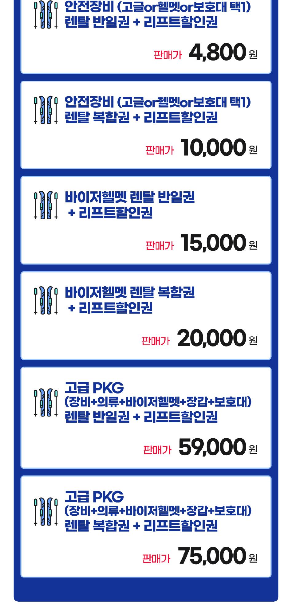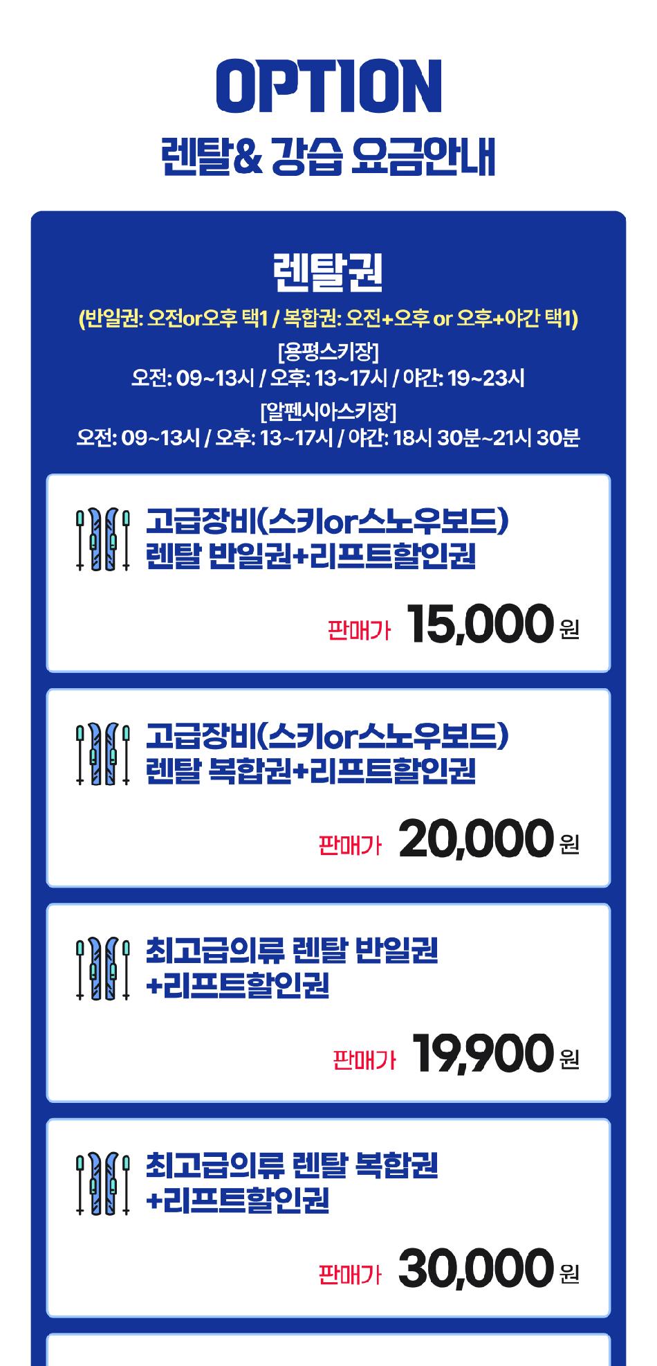렌탈권정보 * 반일권 : 오전or오후or야간 택1 * 복합권 : 오전+오후or오후+야간 택1 * 모나용평스키장 : 오전 09~13시 / 오후 13~17시 / 야간 19~22시 * 알펜시아스키장 : 오전 09~13시 / 오후 13~17시 / 야간 18시30분~21시30분