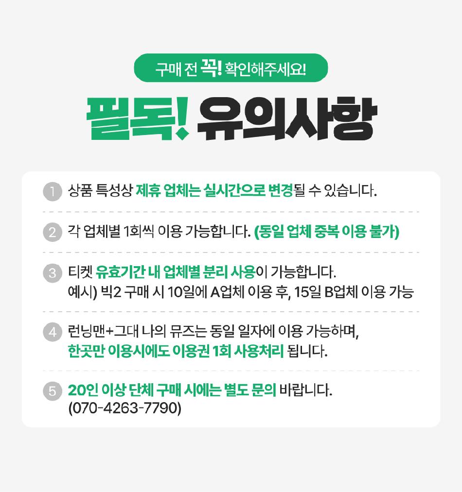 * 상품 특성상 제휴 업체는 실시간으로 변경될 수 있습니다. * 동일 업체 중복 이용 불가합니다. * 티켓 유효기간 내 업체별 분리 사용 가능합니다. * 티켓 부분 환불/부분 사용은 불가하며 일부 티켓 환불 필요 시 반드시 사용 전 티켓 전체 환불 후 재구매 바랍니다. * 단체 구매 시 별도 문의 바랍니다.