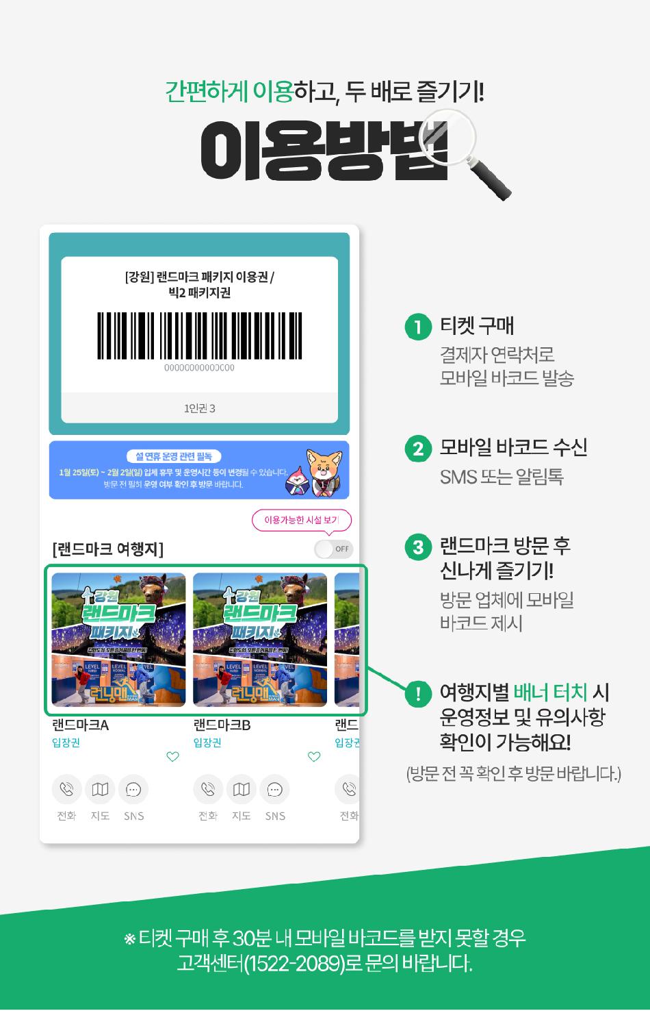 * 1. 상품구매 (당일구매/당일사용 가능 *원활한 알림톡 수신 위해 연락처 확인 필수!) * 2. 모바일 바코드URL 수신 * 3. 방문 업체에 모바일 바코드 제시 * ※ 제휴 시설, 운영정보 등이 실시간으로 변경될 수 있으므로, 바코드 내 여행지별 정보 확인 후 이용 바랍니다.