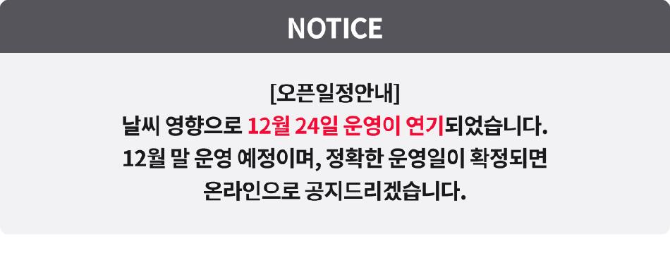 * 종료일은 정해진 날짜 없이 2월 중 날씨 상황에 따라 폐장될 수 있습니다. * 티켓은 운영 기간 중 1일 사용권에 해당 * 입장권 해당 시설은 컨텐츠 참고 바랍니다. * 일부 유료체험은 현장에서 별도요금 발생 * 축제 종료 후 취소 및 환불 불가 * 양주시민, 장애할인, 무료입장은 증명서 제시 필수 (신분증/등본/기타증명서)