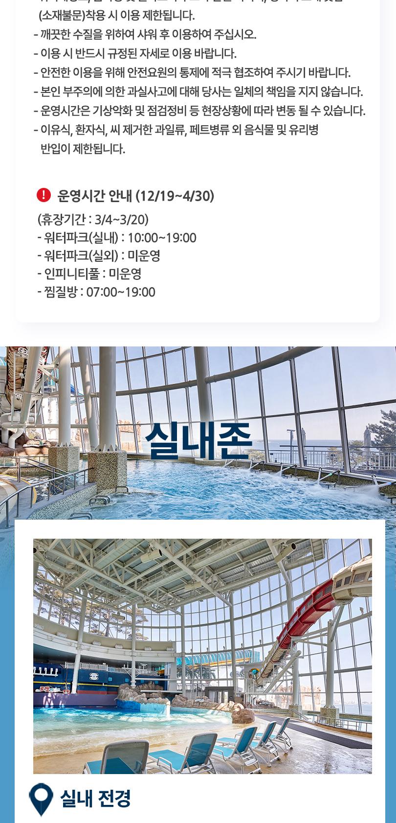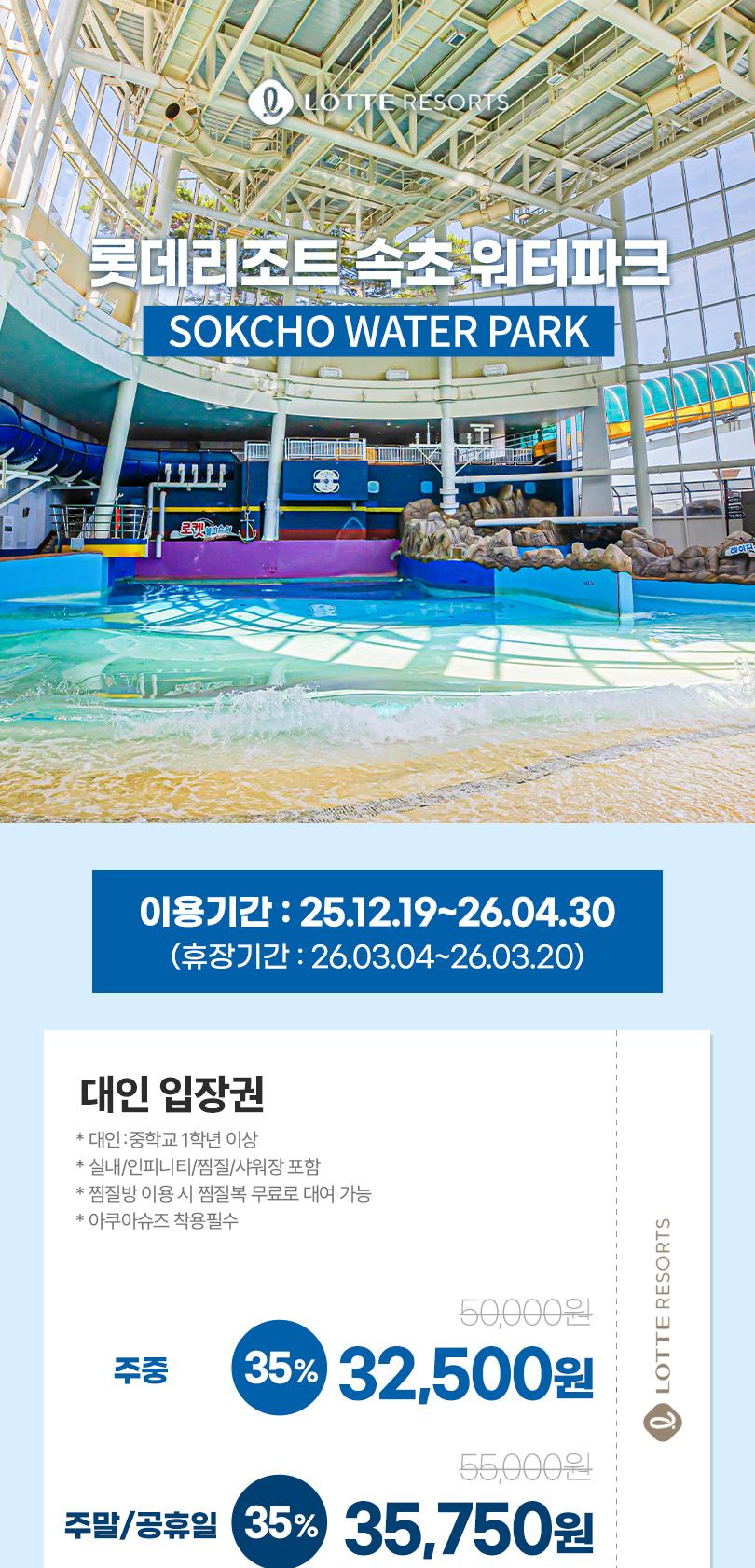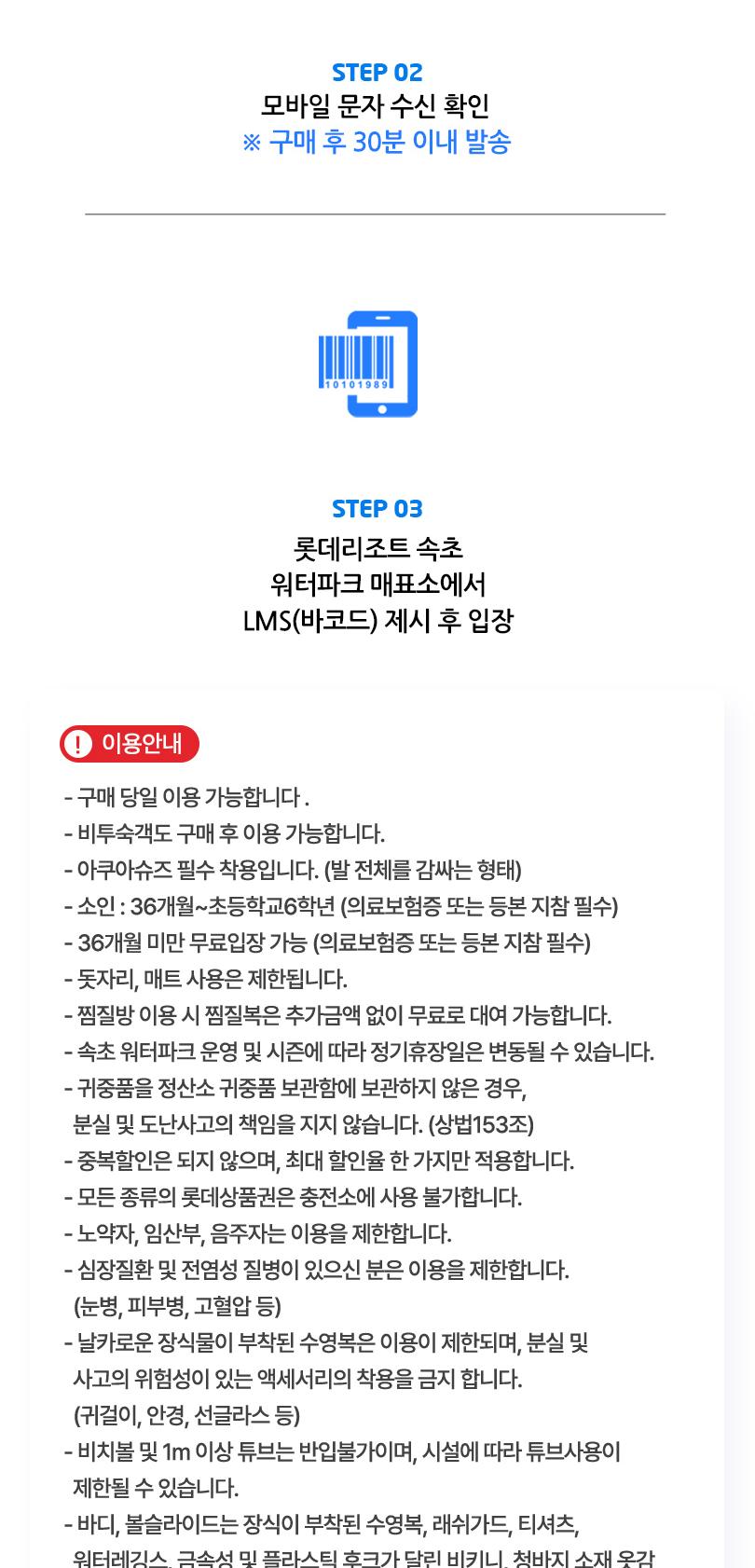 * 구매 당일부터 사용가능합니다. * 소인 : 36개월~초등학교6학년 (의료보험증 또는 등본 지참 필수) * 36개월 미만 무료입장 가능 (의료보험증 또는 등본 지참 필수) * 아쿠아슈즈 필수 착용입니다. (발 전체를 감싸는 형태) * 돗자리, 매트 사용은 제한됩니다. * 찜질방 이용 시 찜질복은 추가금액 없이 무료로 대여 가능합니다. * 속초 워터파크 운영 및 시즌에 따라 정기휴장일은 변동될 수 있습니다. * 귀중품을 정산소 귀중품 보관함에 보관하지 않은 경우, 분실 및 도난사고의 책임을 지지 않습니다. (상법153조) * 중복할인은 되지 않으며, 최대 할인율 한 가지만 적용합니다. * 모든 종류의 롯데상품권은 충전소에 사용 불가합니다. * 노약자, 임산부, 음주자는 이용을 제한합니다. * 심장질환 및 전염성 질병이 있으신 분은 이용을 제한합니다. (눈병, 피부병, 고혈압 등) * 날카로운 장식물이 부착된 수영복은 이용이 제한되며, 분실 및 사고의 위험성이 있는 액세서리의 착용을 금지 합니다. (귀걸이, 안경, 선글라스 등) * 비치볼 및 1m 이상 튜브는 반입불가이며, 시설에 따라 튜브사용이 제한될 수 있습니다.? * 바디, 볼슬라이드는 장식이 부착된 수영복, 래쉬가드, 티셔츠, 워터레깅스, 금속성 및 플라스틱 후크가 달린 비키니, 청바지 소재 옷감 (소재불문)착용 시 이용 제한됩니다. * 깨끗한 수질을 위하여 샤워 후 이용하여 주십시오. * 이용 시 반드시 규정된 자세로 이용 바랍니다. * 안전한 이용을 위해 안전요원의 통제에 적극 협조하여 주시기 바랍니다. * 본인 부주의에 의한 과실사고에 대해 당사는 일체의 책임을 지지 않습니다. * 운영시간은 기상악화 및 점검정비 등 현장상황에 따라 변동 될 수 있습니다. * 이유식, 환자식, 씨 제거한 과일류, 페트병류 외 음식물 및 유리병 반입이 제한됩니다.