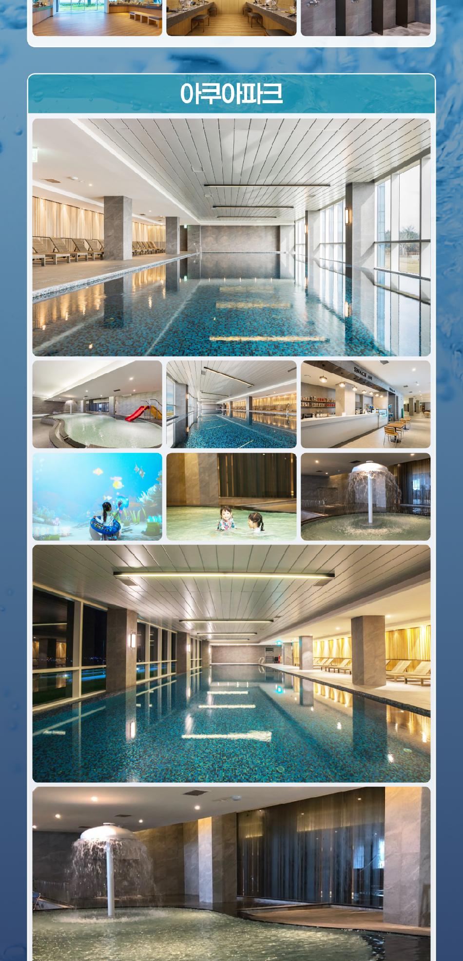 아쿠아파크(수영장/유아풀장) 이용안내 * 수영복 및 모자 착용 필수 (캡 모자, 면티, 면바지 불가) * 오일,화장품 등 사용불가 * 아쿠아 슈즈는 풀 입장 시 반드시 벗어주시길 바랍니다. * 신장 130cm 미만은 보호자 동반 및 구명조끼 착용 시 입장 가능 합니다. * 만 36개월 미만 영 유아는 방수 기저귀를 반드시 착용 하셔야 합니다. * 어린이의 안전을 위하여 반드시 보호자가 동행하며, 부주의로 인한 사고시 당사는 책임을 지지 않습니다. * 만 48개월 이상은 성별을 구분하여 온천사우나(탈의실)를 이용해 주시기 바랍니다. * 수영장(인피니티풀)에서는 고무튜브 및 수영기구(비치볼, 오리발, 스노클, 물총 등)를 사용 하실 수 없습니다.
