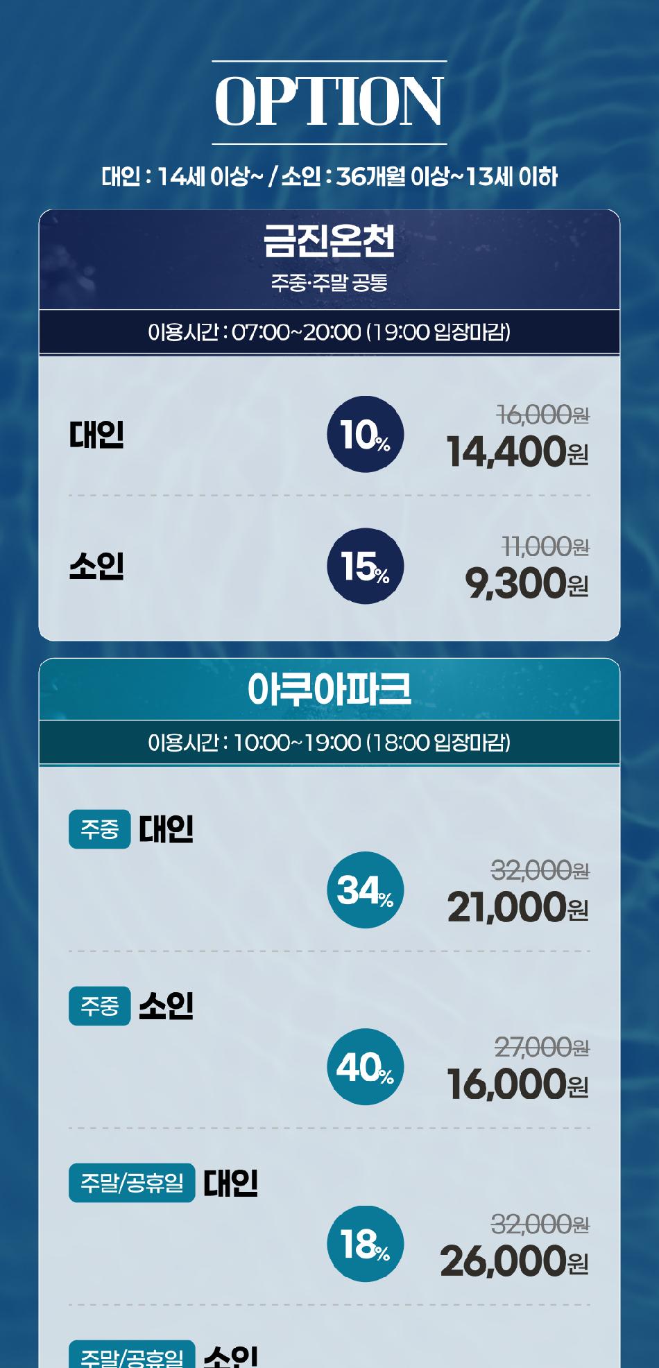 금진온천 이용안내 * 바테탕, 열탕, 온천탕, 냉탕, 습식, 건식사우나가 완비되어 있습니다. * 만 4세 이상은 혼욕을 금지합니다. * 사우나는 만 13세 이상 고객에 한해 입장 가능합니다. (만 13세 미만은 보호자와 동반 시 입장 가능) * 70세 이상 고객은 보호자와 함께 이용하시길 권장합니다. * 건강상 문제나 피부질한. 과도한 문신. 음주자는 입장을 제한합니다.