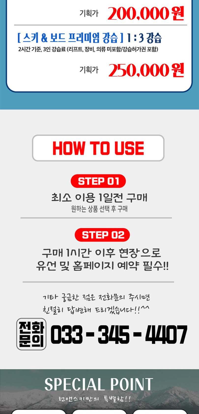 * 구매 1시간 후 현장으로 유선 및 홈페이지 예약 필수 - 유선예약 : 033-345-4407 - 단, 강습상품은 3일 전 전화예약 필수 * 예약과 동시에 사용처리됩니다 * 본 상품은 주중,주말/대인,소인 구분없이 이용 가능합니다. * 강습이용시 강습패스비용 별도 현장결제하셔야 합니다. * 장비 및 의류 추가 렌탈시 별도 현장문의하셔야 합니다. * 1인기준 강습료 입니다