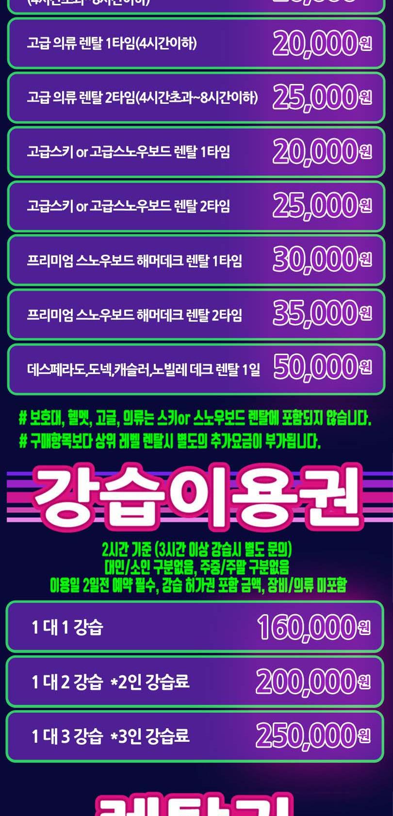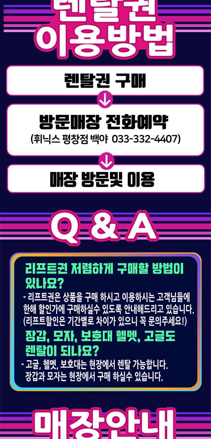 * 구매 1시간 후 현장으로 유선 및 홈페이지 예약 필수 - 유선예약 : 033-342-4407 - 단, 강습상품은 3일 전 전화예약 필수 * 예약과 동시에 사용처리됩니다 * 본 상품은 주중,주말/대인,소인 구분없이 이용 가능합니다. * 강습이용시 조끼착용 별도 현장결제하셔야 합니다. * 타임추가시 별도 현장결제하셔야 합니다. * 상품 금액은 1인기준입니다.