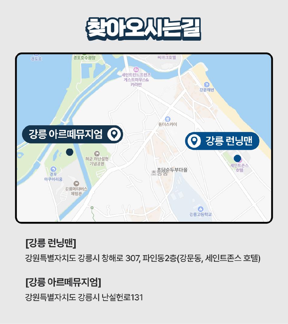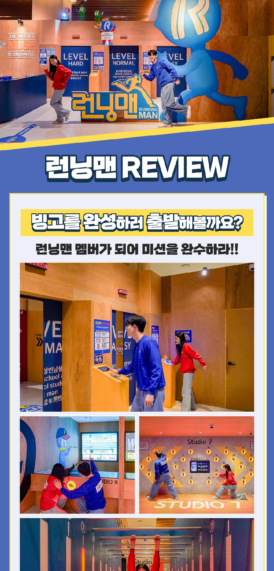 런닝맨 유의사항 * 초등학생 이하 어린이는 성인 보호자의 동반 입장이 필수 입니다. * 중, 고등학생 입장 시 `학생증` 등 증빙서류 필수 지참 * 성인 보호자 1명당 어린이 5명 입장 가능합니다. * 런닝맨의 경우 키 110cm 미만은 일부 체험에 어려움이 있을 수 있습니다. * 노약자, 임산부, 장애인 분들은 체험에 제한이 있어 전시관 사전 문의 바랍니다. * 바지 및 운동화 착용을 권장합니다. * 안전한 체험을 위해 현장 직원의 지침 및 안내를 반드시 숙지하여 주시기 바랍니다. * 체험은 1회이며, 중도포기 및 체험 완료 후 재입장은 불가합니다. * 유모차 반입은 불가합니다. * 역동적인 체험을 하는 공간으로 구조물에 의한 안전사고 발생에 주의해주시길 바라며, 체험자 부주의로 인한 사고는 책임지지 않습니다. * 주말 및 공휴일에는 입장대기 시간이 발생할 수 있으며, 상황에 따라 조기 마감 될 수 있습니다. * 소지품은 분실 및 파손의 우려가 있어, 사물함 사용을 권장합니다. * 음식물 반입금지 / 애완견 출입금지 / 퇴장 후 재입장 불가합니다.