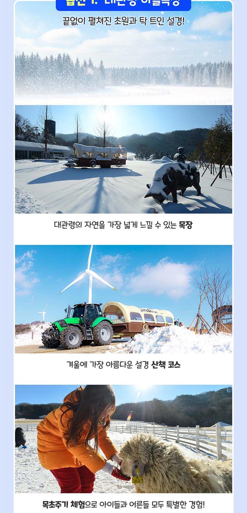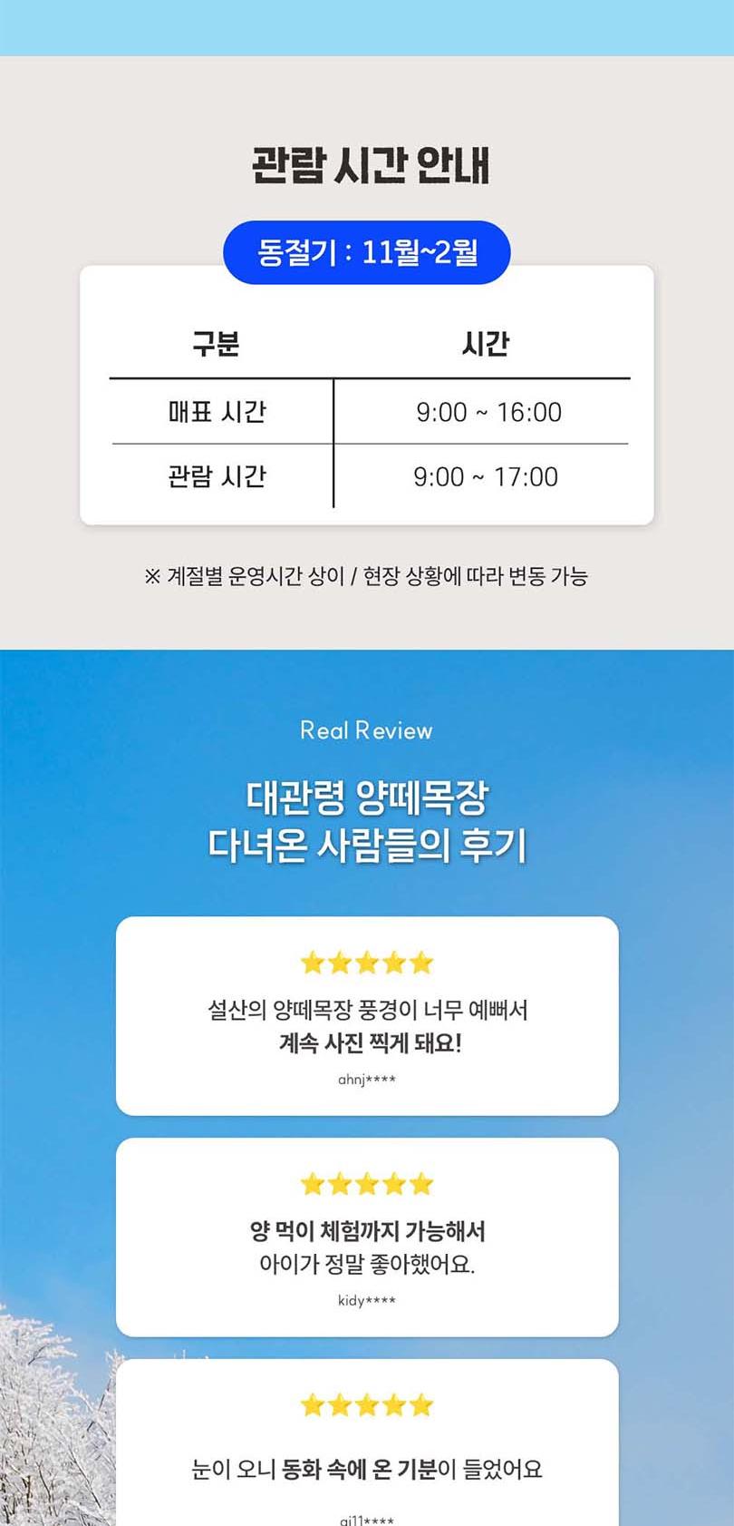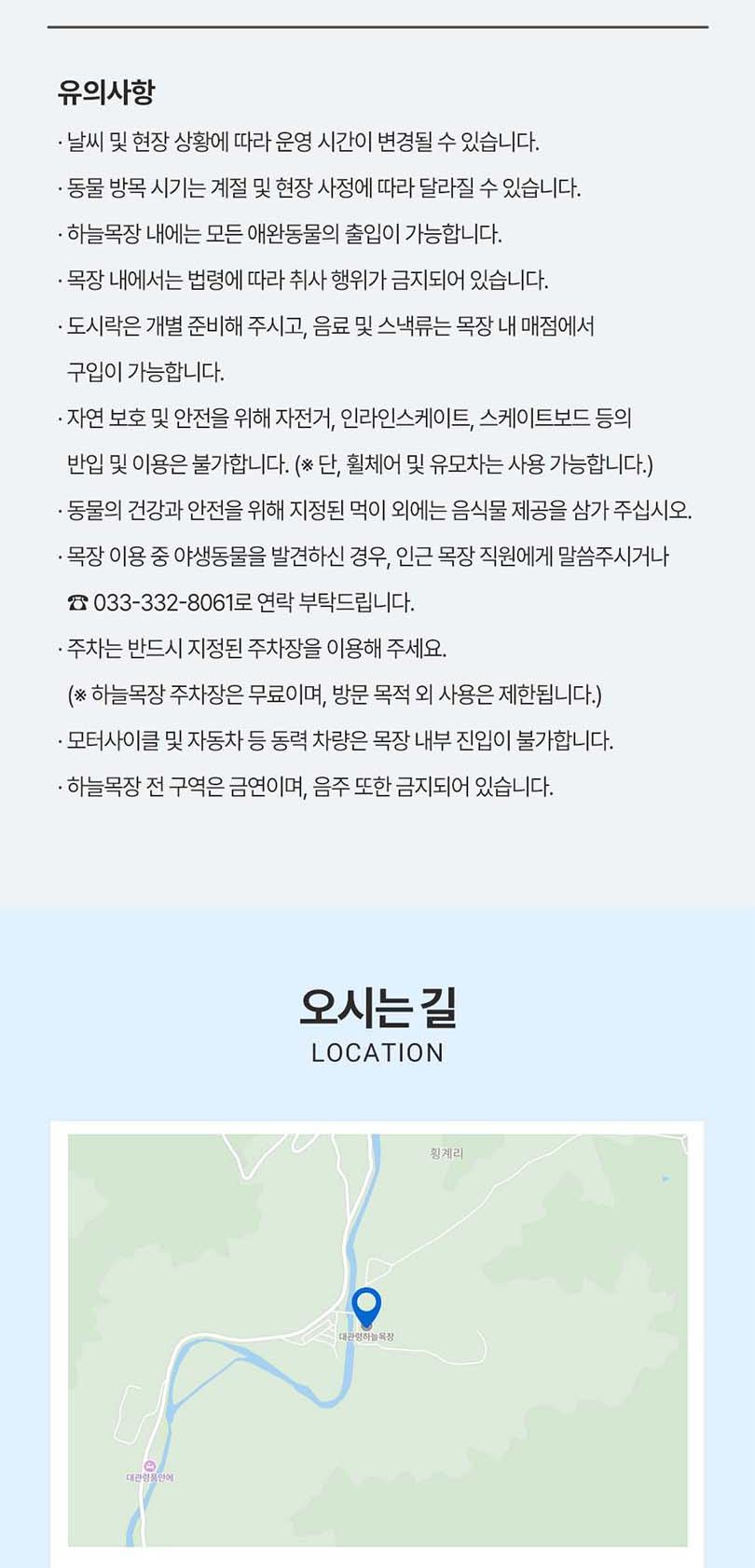 ※대관령 하늘목장※ *[유의사항] *■ 동절기 (1월 ~ 3월 / 10월 ~ 12월) * 하늘목장 관람시간: 오전 9시 ~ 오후 5시 30분 * 매표소: 오전 9시 ~ 오후 4시 30분 * 트랙터마차: 매표소 마차 시간표 참고 * 하늘 카페: 오전 9시 ~ 오후 5시 * 하늘 스토어: 오전 9시 ~ 오후 5시 * 양 건초주기 체험: 오전 9시 ~ 오후 5시 * 트랙터마차 이용 시간은 눈, 비, 강풍이 불시 운행이 중단될 수 있습니다. * 상기 시간표는 날씨 등의 상황에 따라 변동될 수 있습니다. * 날씨 및 현장 상황에 따라 운영 시간이 변경될 수 있습니다. * 동물 방목 시기는 계절 및 현장 사정에 따라 달라질 수 있습니다. * 하늘목장 내에는 모든 애완동물의 출입이 가능합니다. * 목장 내에서는 법령에 따라 취사 행위가 금지되어 있습니다. * 도시락은 개별 준비해 주시고, 음료 및 스낵류는 목장 내 매점에서 구입이 가능합니다. * 자연 보호 및 안전을 위해 자전거, 인라인스케이트, 스케이트보드 등의 반입 및 이용은 불가합니다. (※ 단, 휠체어 및 유모차는 사용 가능합니다.) * 동물의 건강과 안전을 위해 지정된 먹이 외에는 음식물 제공을 삼가 주십시오. * 목장 이용 중 야생동물을 발견하신 경우, 인근 목장 직원에게 말씀주시거나 ☎ 033-332-8061로 연락 부* 탁드립니다. * 주차는 반드시 지정된 주차장을 이용해 주세요. (※ 하늘목장 주차장은 무료이며, 방문 목적 외 사용은 제한됩니다.) * 모터사이클 및 자동차 등 동력 차량은 목장 내부 진입이 불가합니다. * 하늘목장 전 구역은 금연이며, 음주 또한 금지되어 있습니다.
