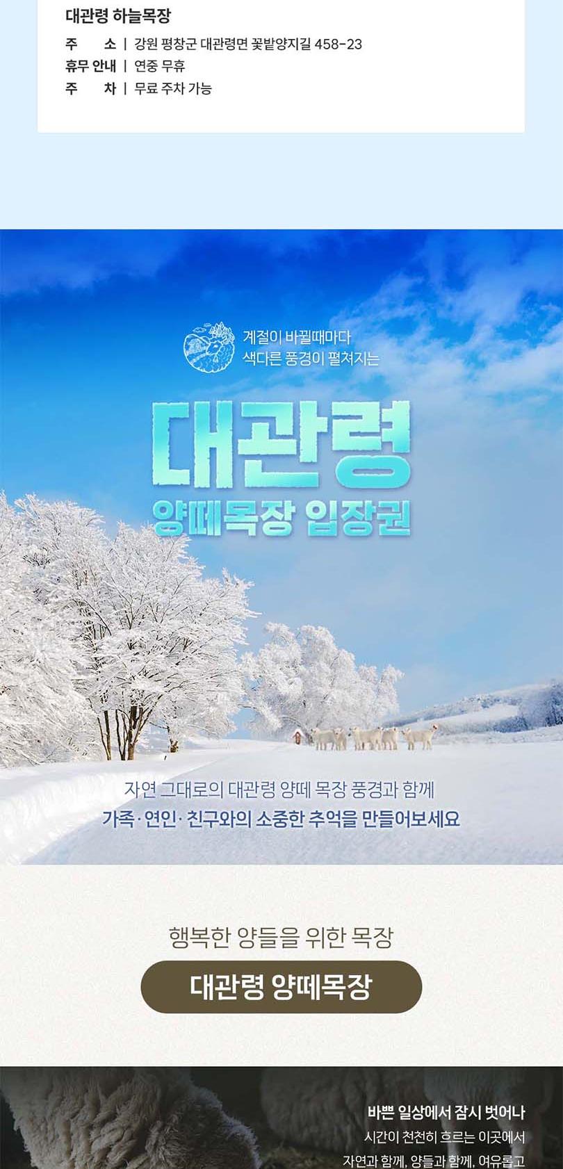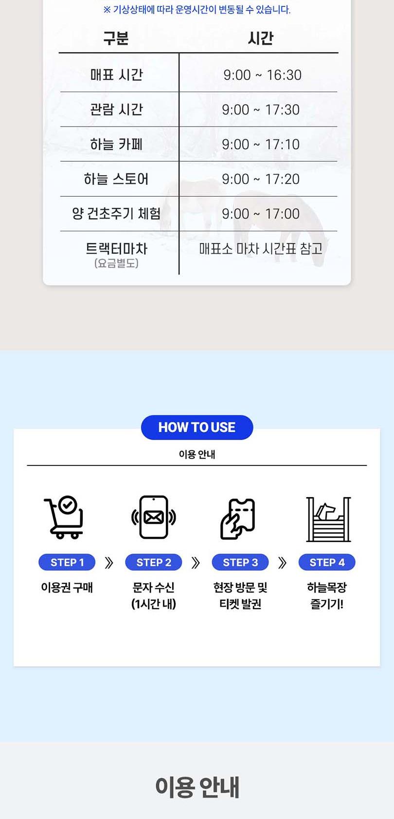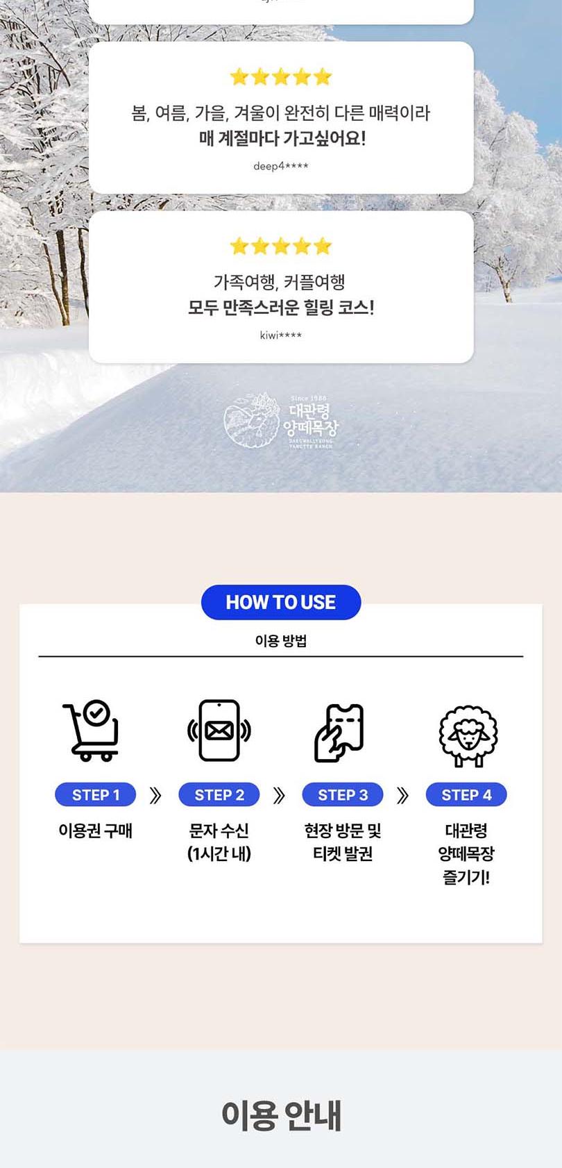 *1. 티켓구매 *2. 구매 후 30~60분 이내 문자 수신 *3. 현장방문하여 티켓 발권. *4. 발권받은 티켓으로 입장. -★ 대관령 눈꽃축제 1번과 목장 중 한 곳 1번 이용 가능합니다. -★ 당일구매 당일사용 불가합니다. 이 점 참고하시어 이용 부탁드리겠습니다. -★ 대관령 눈꽃축제는 필수 이용이며, 대관령 하늘목장과 대관령 양떼목장 중 한 곳 이용 가능합니다. -★ 두 목장 중 한 곳 방문하여 성함 및 연락처 제시 후 이용 가능합니다.