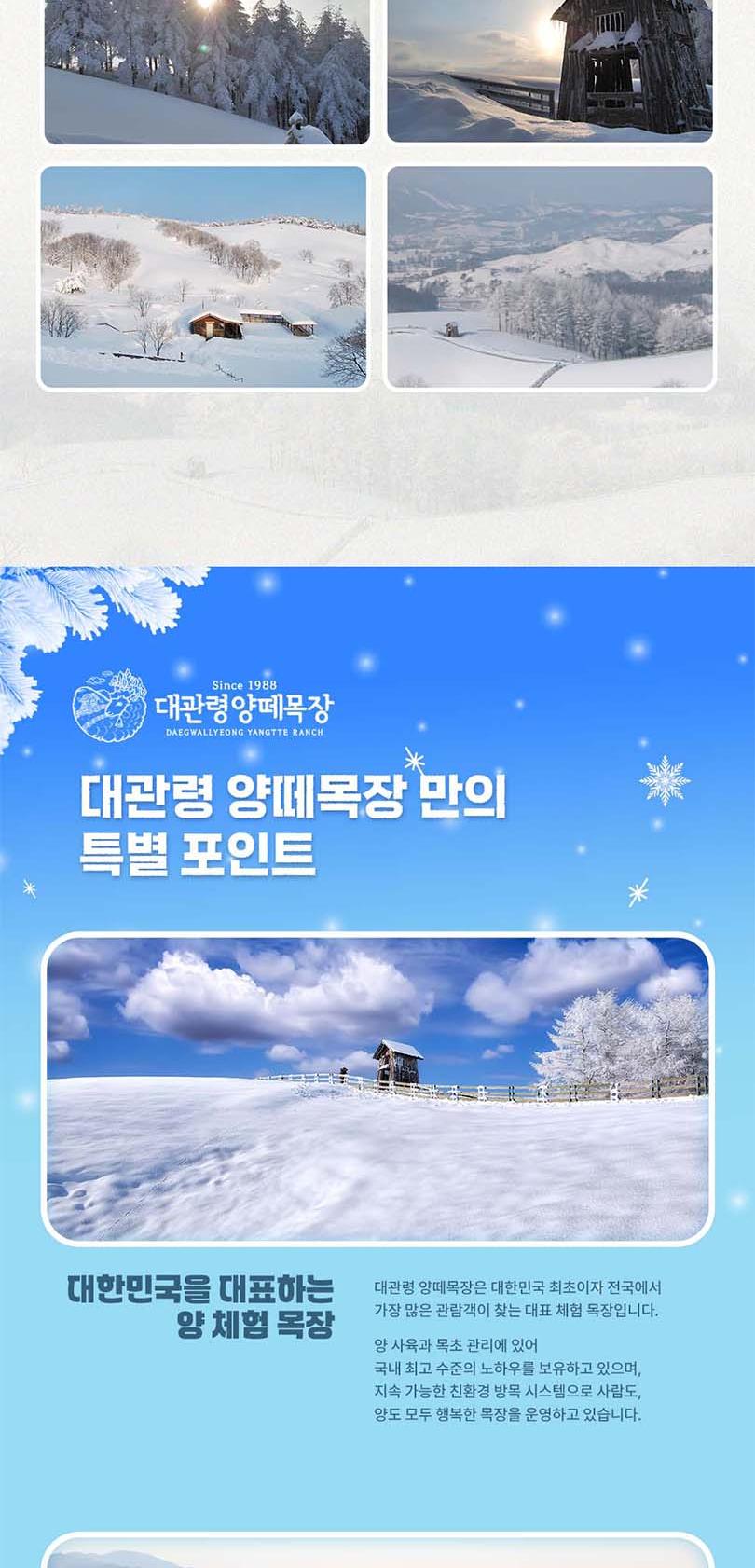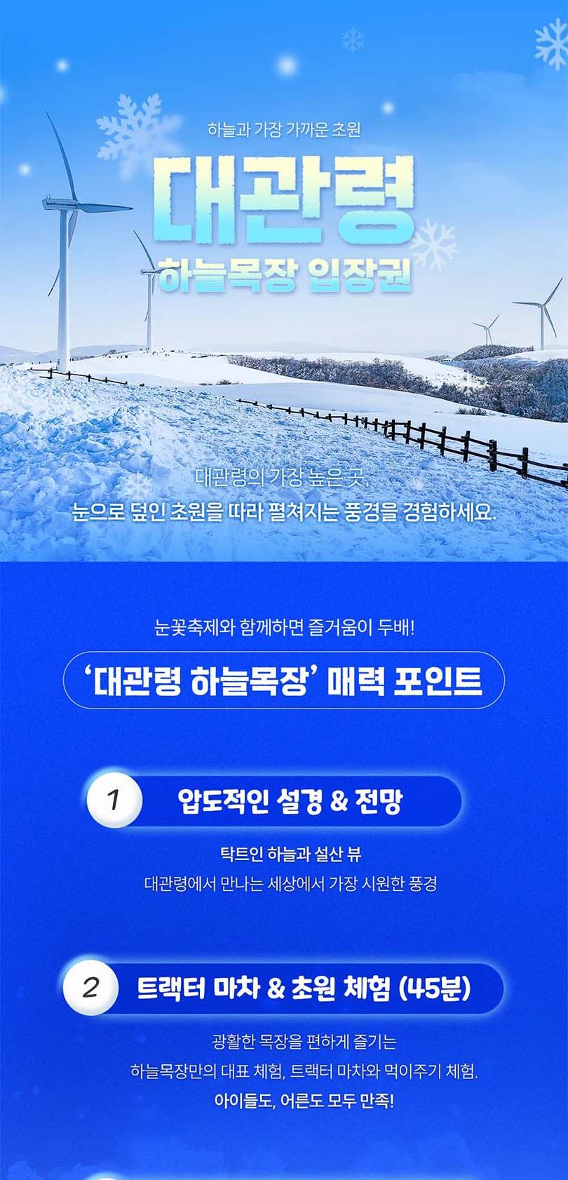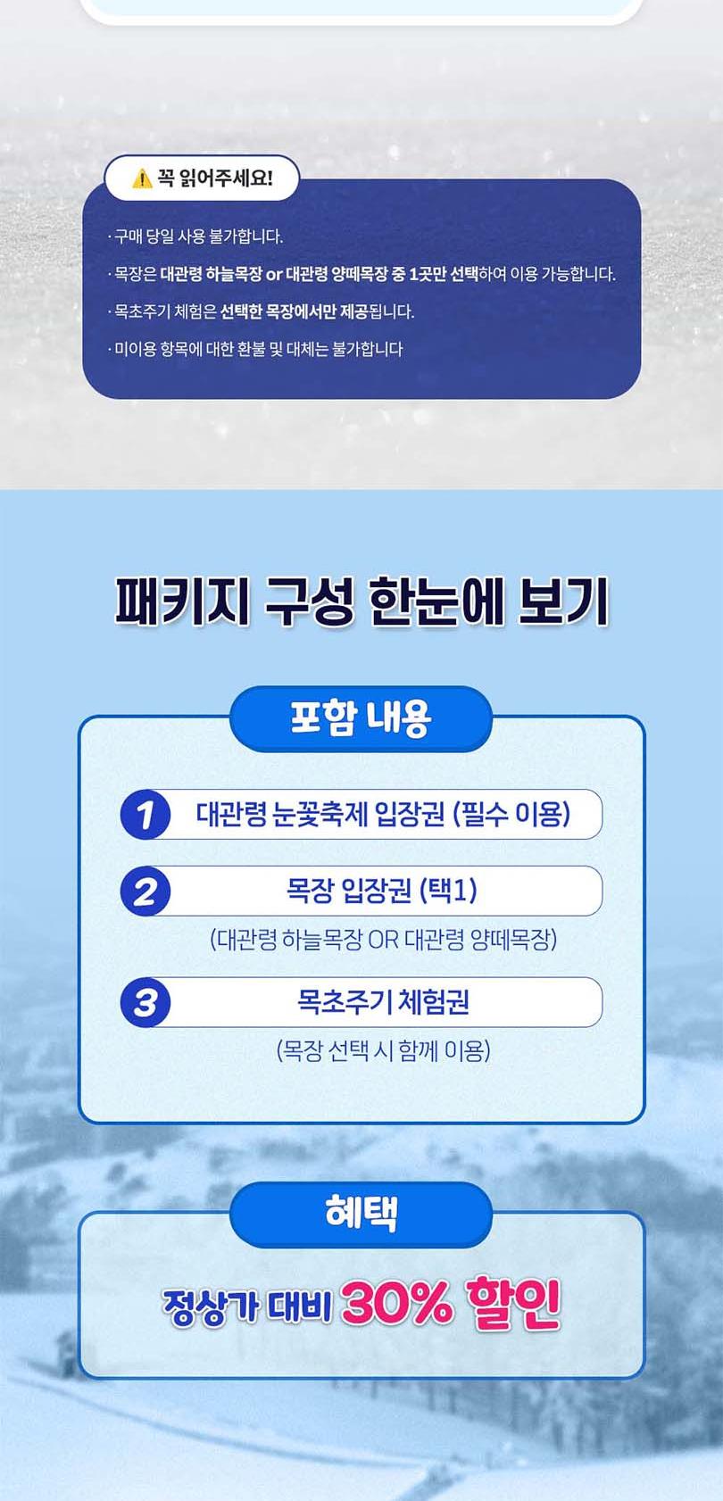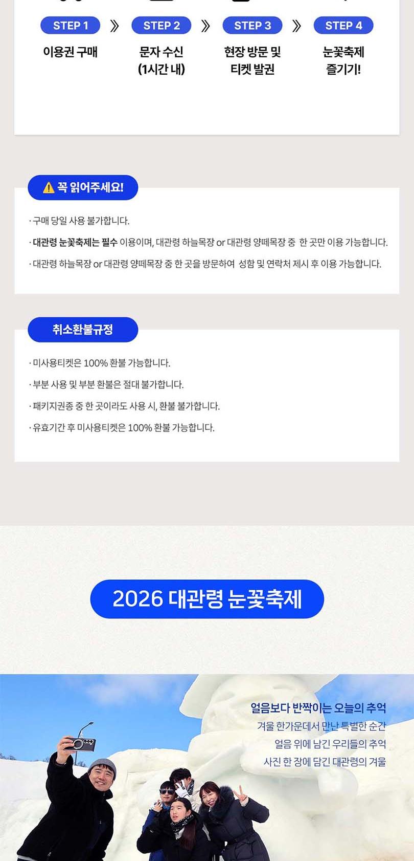 *1. 티켓구매 *2. 구매 후 30~60분 이내 문자 수신 *3. 현장방문하여 티켓 발권. *4. 발권받은 티켓으로 입장. -★ 대관령 눈꽃축제 1번과 목장 중 한 곳 1번 이용 가능합니다. -★ 당일구매 당일사용 불가합니다. 이 점 참고하시어 이용 부탁드리겠습니다. -★ 대관령 눈꽃축제는 필수 이용이며, 대관령 하늘목장과 대관령 양떼목장 중 한 곳 이용 가능합니다. -★ 두 목장 중 한 곳 방문하여 성함 및 연락처 제시 후 이용 가능합니다.