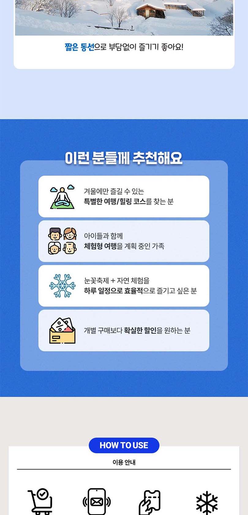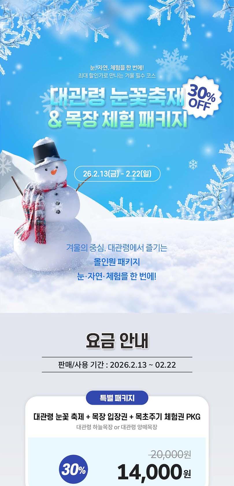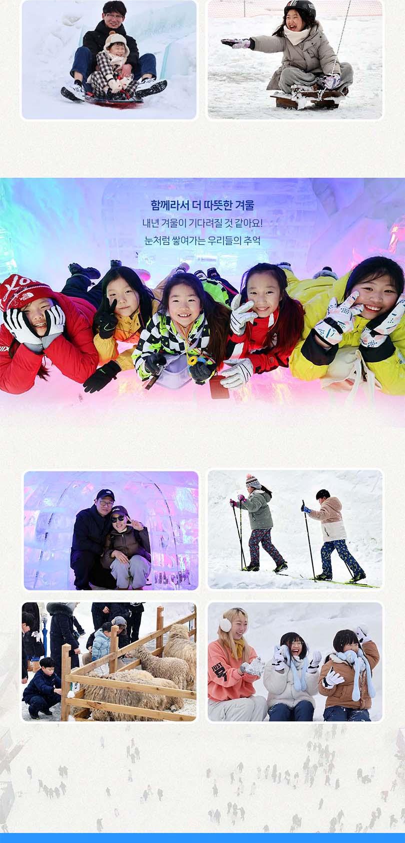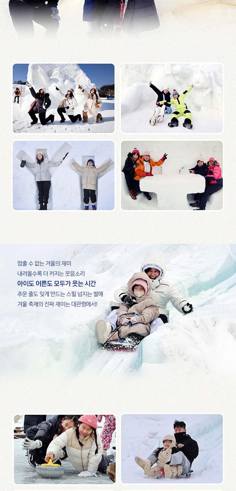 ※대관령 눈꽃축제※ *[유의사항] * 중복 할인 불가 / 24개월 미만 무료입장 * 할인 대상자는 신분증 및 관련자료 제출 필수 * 눈썰매장은 할인 미적용 * 현장에서 판매중인 유료시설 이용권은 포함되어 있지 않으며, 기타시설 이용 시 현장에서 별도 구매하여 사용해 주시기 바랍니다.