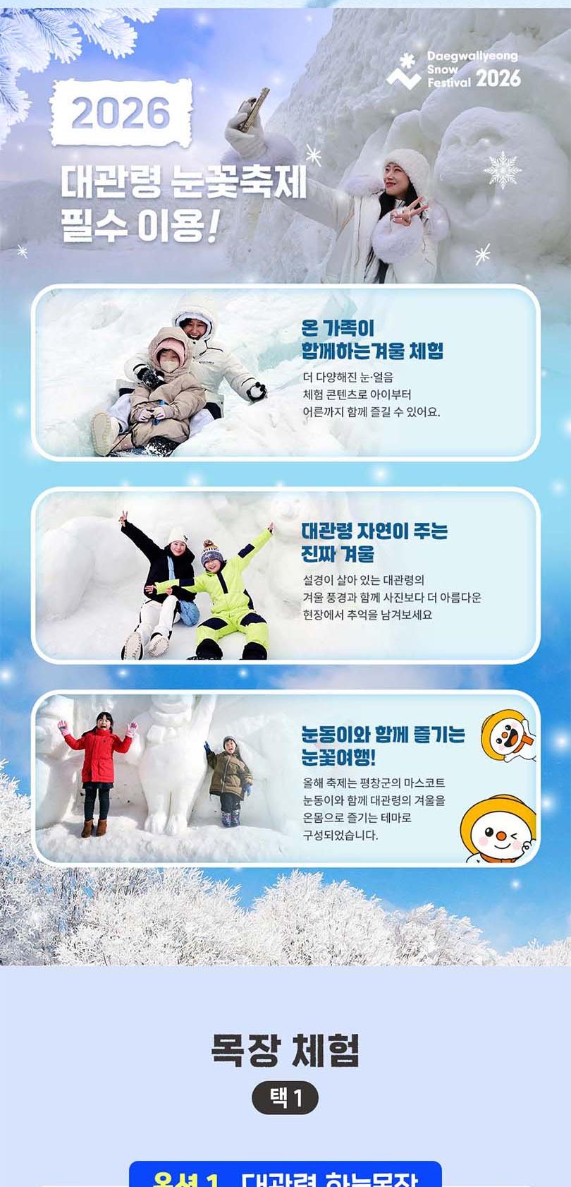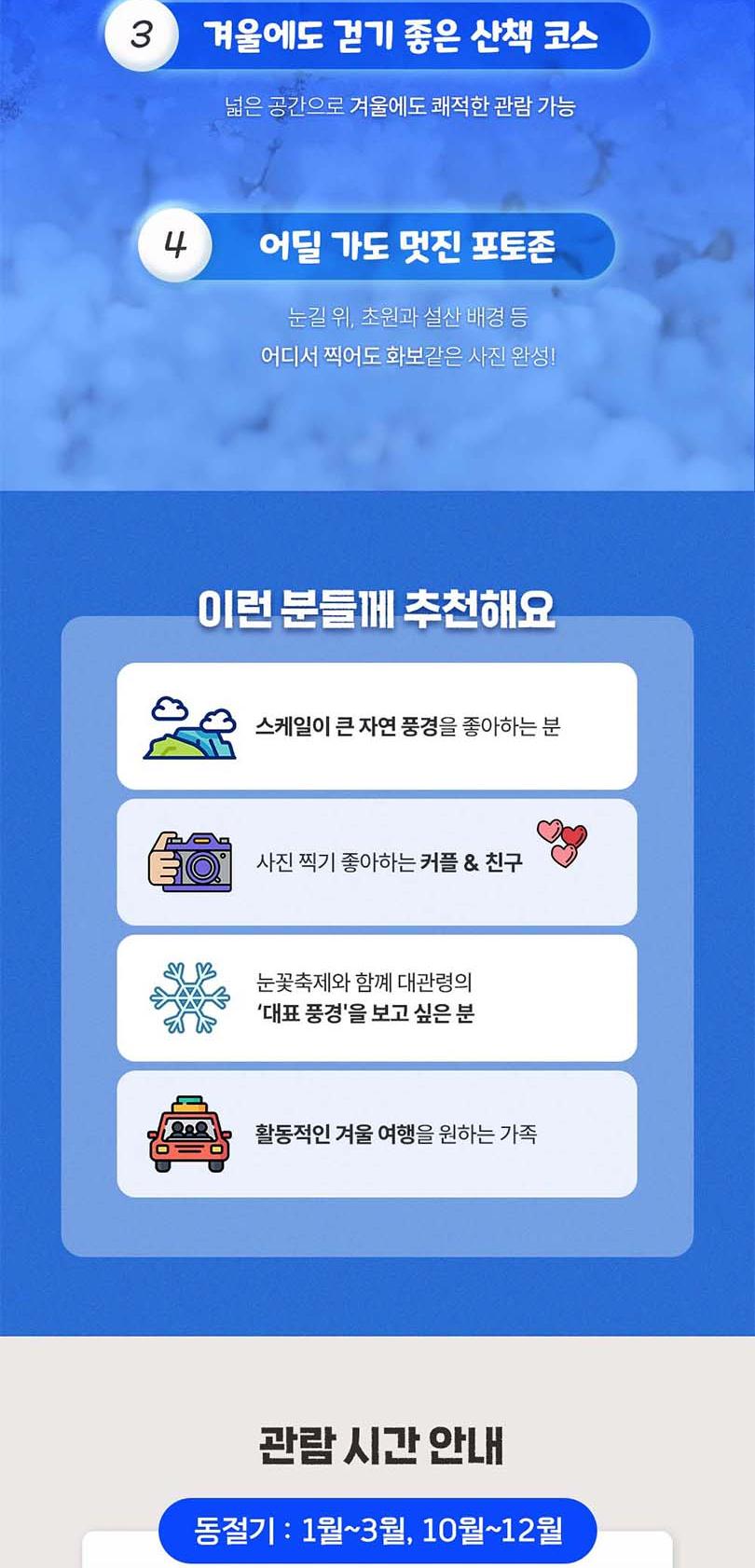 * 홈페이지 : https://www.snowfestival.net/ * 운영시간 - 매일 : 10:00~17:30 * 휴무일 : 연중무휴 * 주차 : 주차가능. 단, 매우 협소합니다. 이 점 참고하시어 방문 부탁드리겠습니다. [주차] *주차장은 ‘대관령눈꽃축제 제 1,2,3 주차장’을 이용 해 주세요. *내비게이션에서 아래 내용을 검색