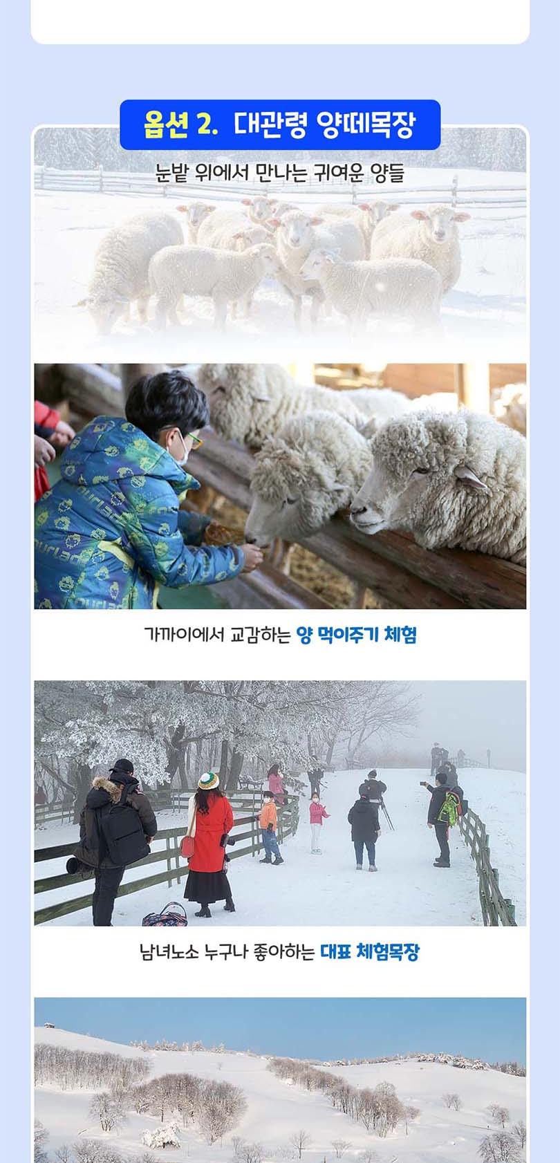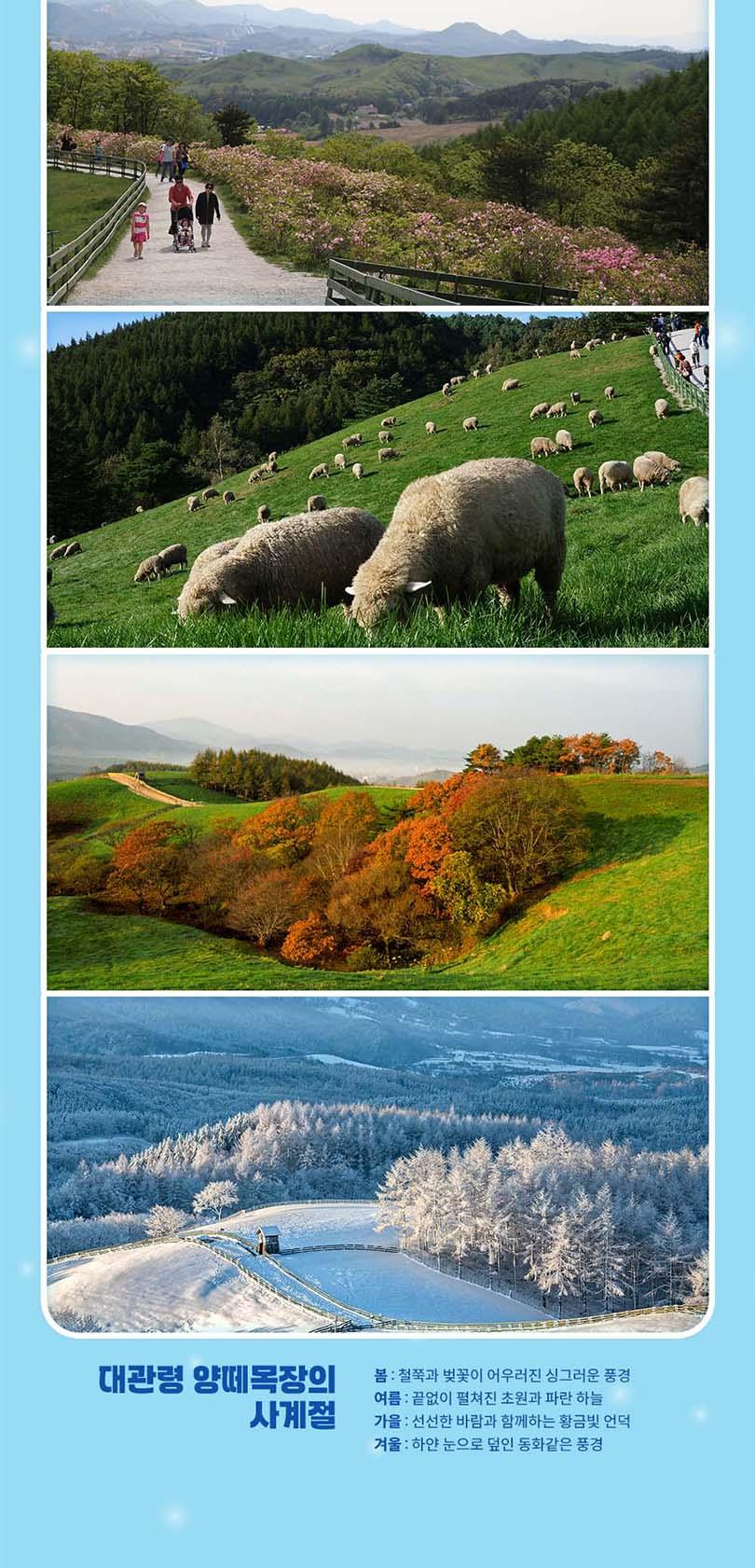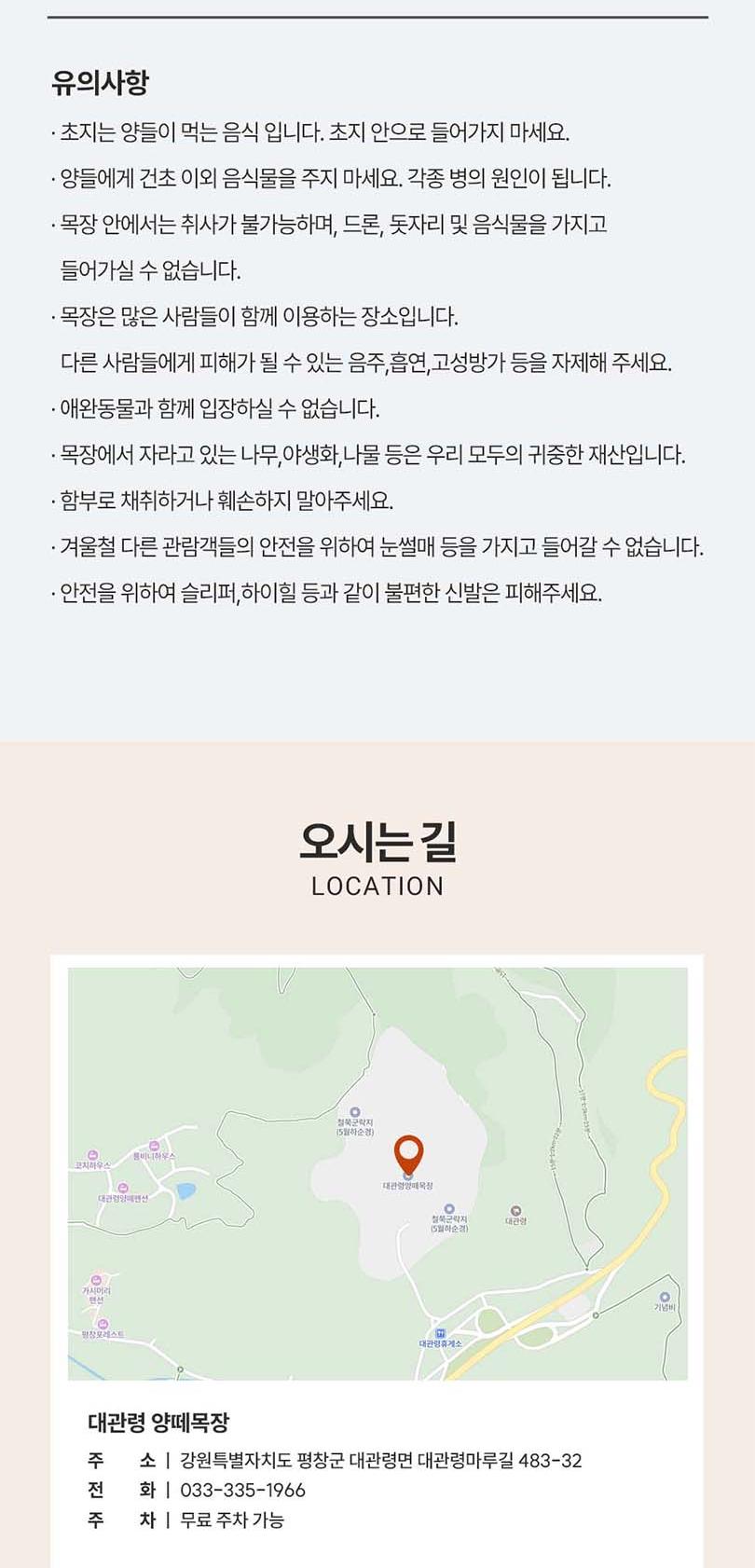 ※대관령 양떼목장※ *[유의사항] *초지는 양들이 먹는 음식 입니다. 초지 안으로 들어가지 마세요. *양들에게 건초 이외 음식물을 주지 마세요. 각종 병의 원인이 됩니다. *목장 안에서는 취사가 불가능하며, 드론, 돗자리 및 음식물을 가지고 들어가실 수 없습니다. *목장은 많은 사람들이 함께 이용하는 장소입니다. 다른 사람들에게 피해가 될 수 있는 음주,흡연,고성방가 등을 자제해 주세요. *애완동물과 함께 입장하실 수 없습니다. *목장에서 자라고 있는 나무,야생화,나물 등은 우리 모두의 귀중한 재산입니다. *함부로 채취하거나 훼손하지 말아주세요. *겨울철 다른 관람객들의 안전을 위하여 눈썰매 등을 가지고 들어갈 수 없습니다. *안전을 위하여 슬리퍼,하이힐 등과 같이 불편한 신발은 피해주세요.