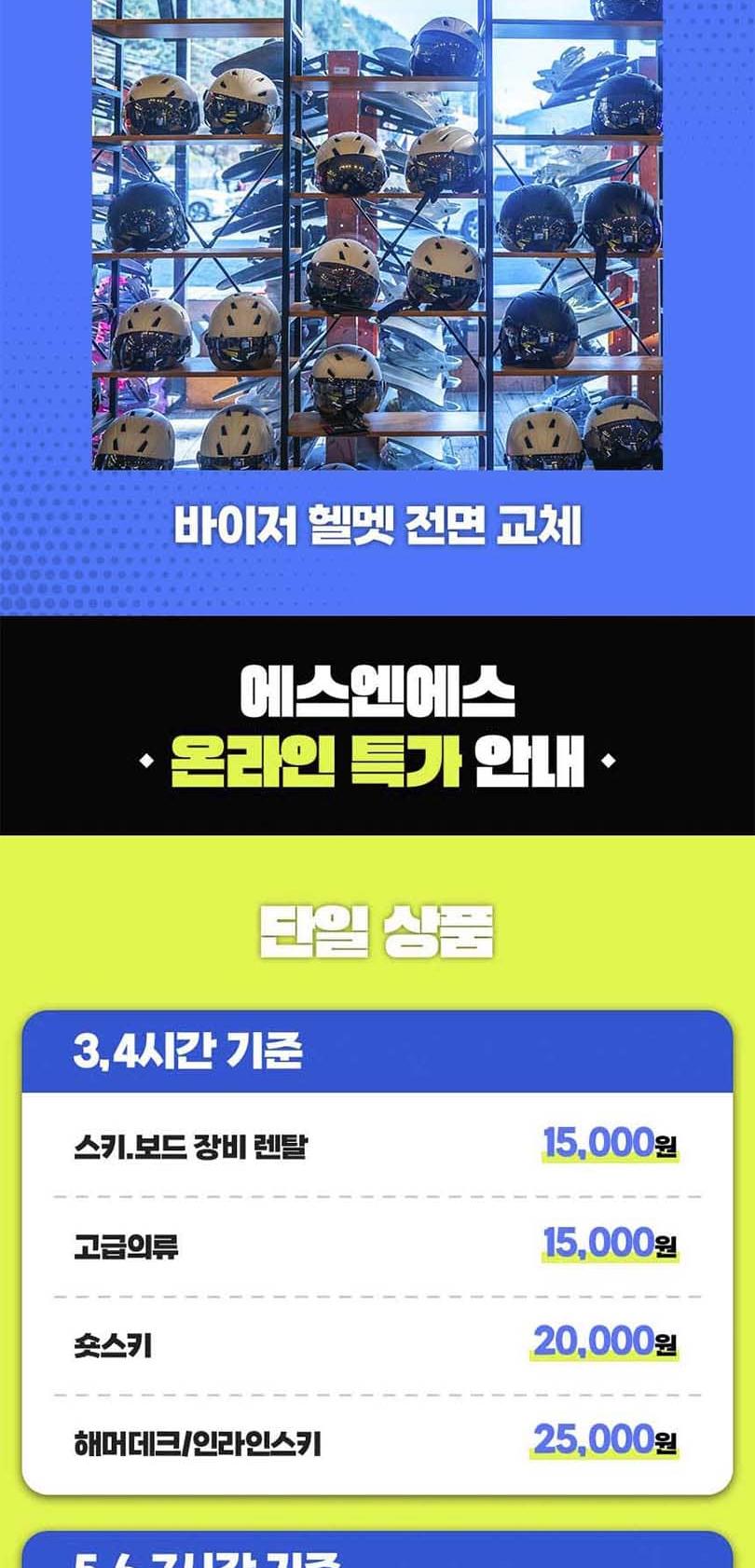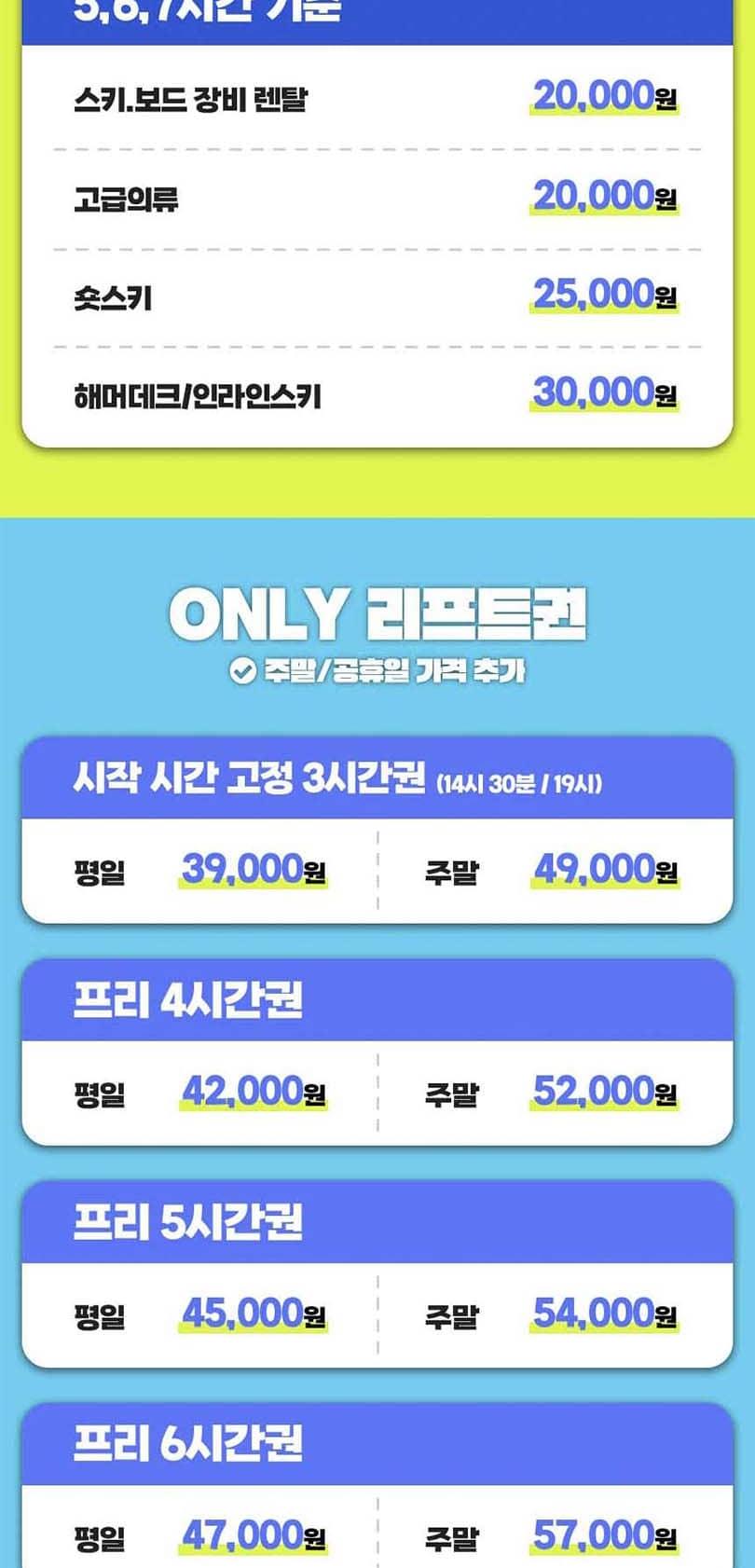 [이용안내] *렌탈 상품은 스키/보드 장비, 의류, 헬멧 등으로 구성되어 있으며 이용 시간 및 상품 구성에 따라 요금이 상이합니다. *렌탈 시간은 장비 수령 시점부터 반납 시점까지를 기준으로 합니다. *상품 선택 후 사이즈 및 장비 변경은 1회 가능하며, 이후 변경은 제한될 수 있습니다. *모든 렌탈 장비는 대여 전·후 철저한 점검 및 관리를 진행합니다.