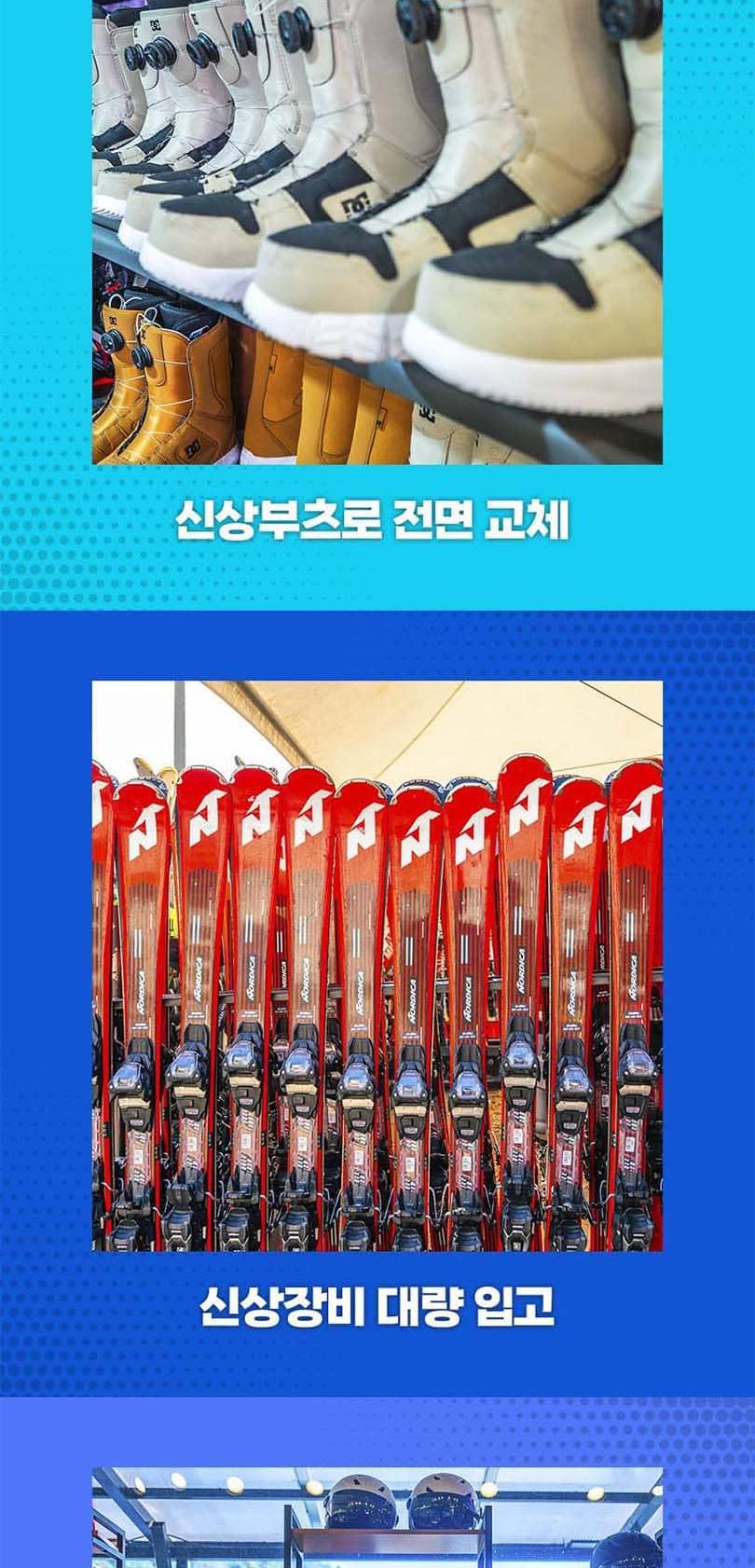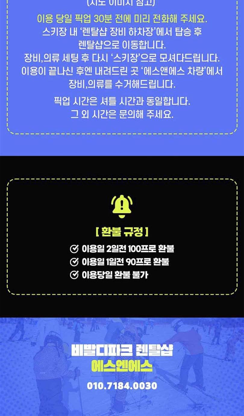 [장비 사용 유의사항] *렌탈 장비는 스키장 내 사용만 가능하며, 외부 이동 또는 타인 대여는 불가합니다. *장비 분실, 파손, 심각한 오염 발생 시 수리비 또는 변상 비용이 청구될 수 있습니다. *정상적인 사용 범위를 벗어난 파손은 고객 부담입니다.