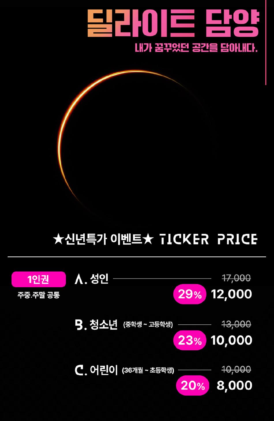 할인안내 * 모든 할인은 증빙서류 지참 필수이며 미지참 시 혜택 적용 불가 및 차액 현장결제 필수) * 36개월 미만 무료 입장 가능 * 장애인 복지카드 소지자 본인 및 동반 1인 50% 할인 - 할인 대상자가 아닌 경우, 동반자 신분으로서 할인 불가 * 죽녹원/담양군민 할인은 반드시 죽녹원 당일티켓 또는 신분증 제시 필수 - 증빙서류 (장애인 복지카드/36개월 미만 확인증/청소년증/학생증/죽녹원 당일티켓/신분증 등)
