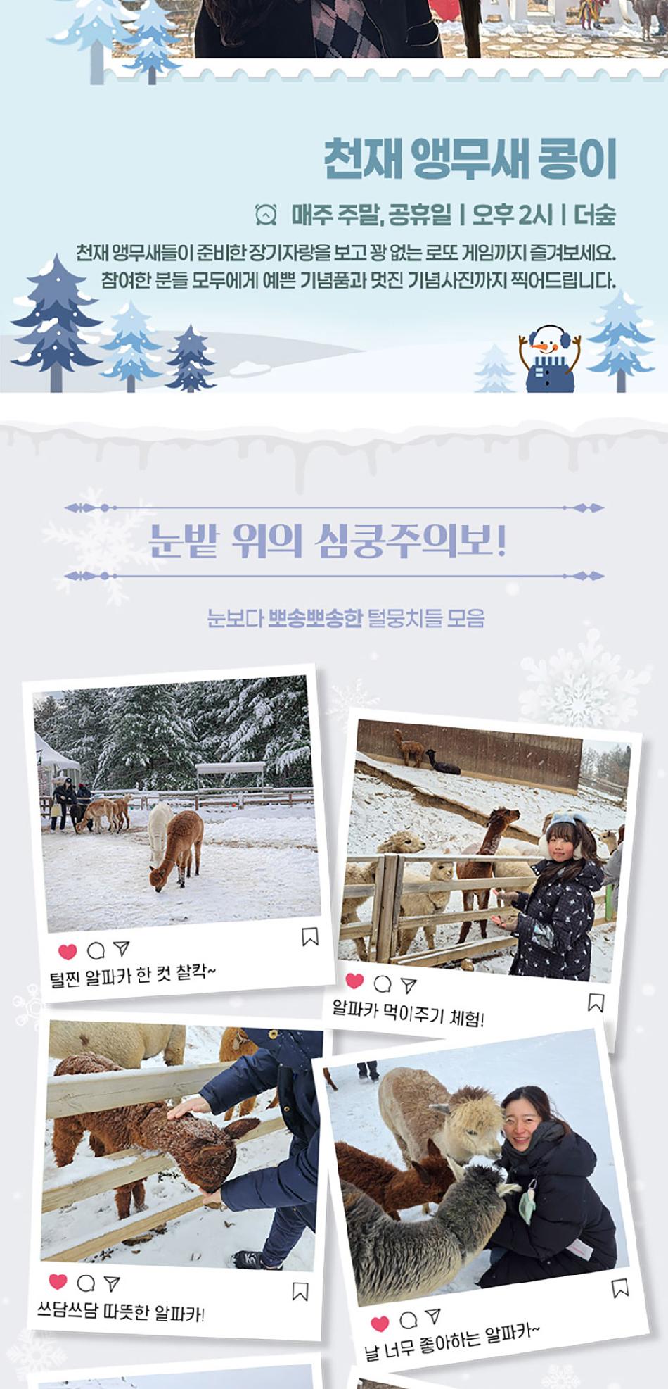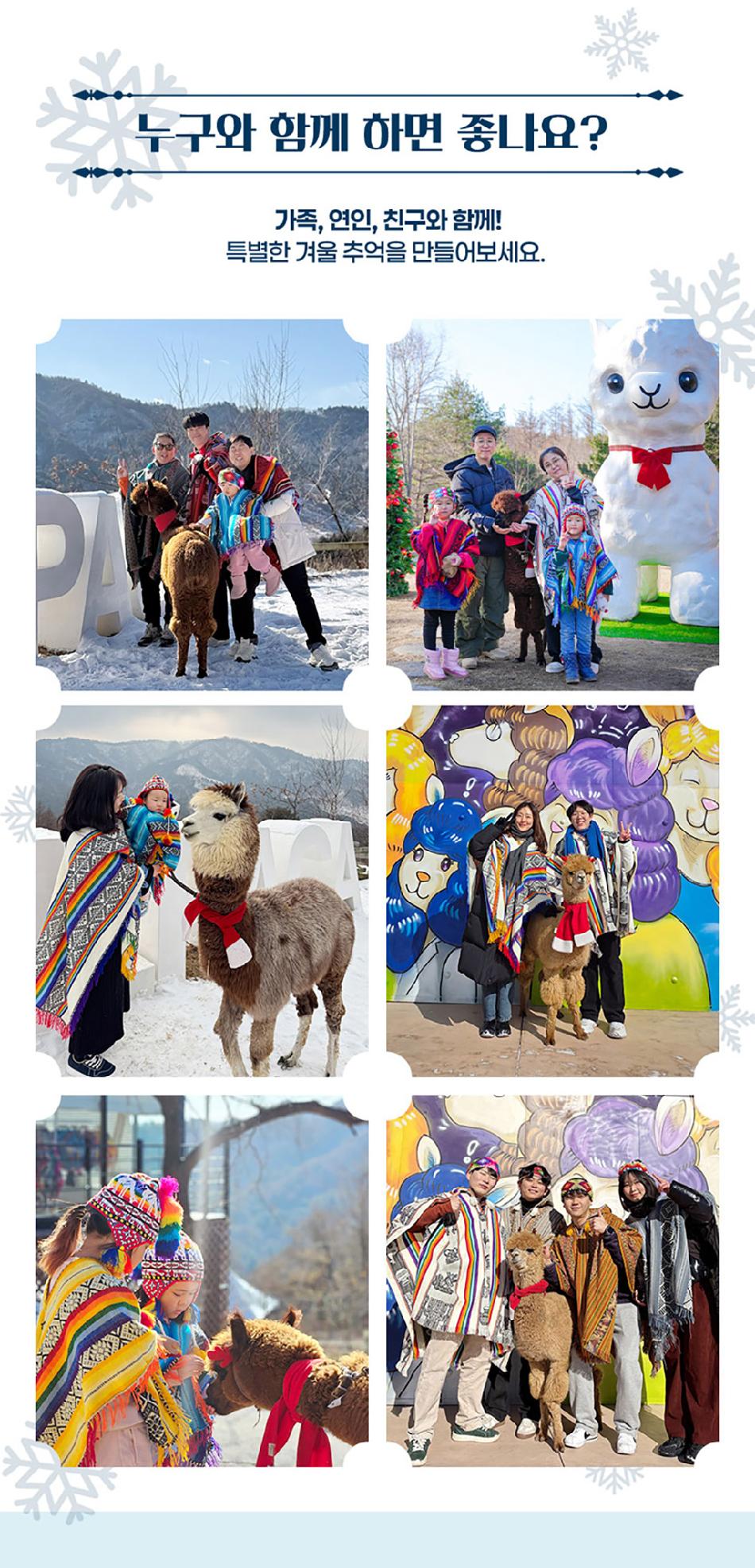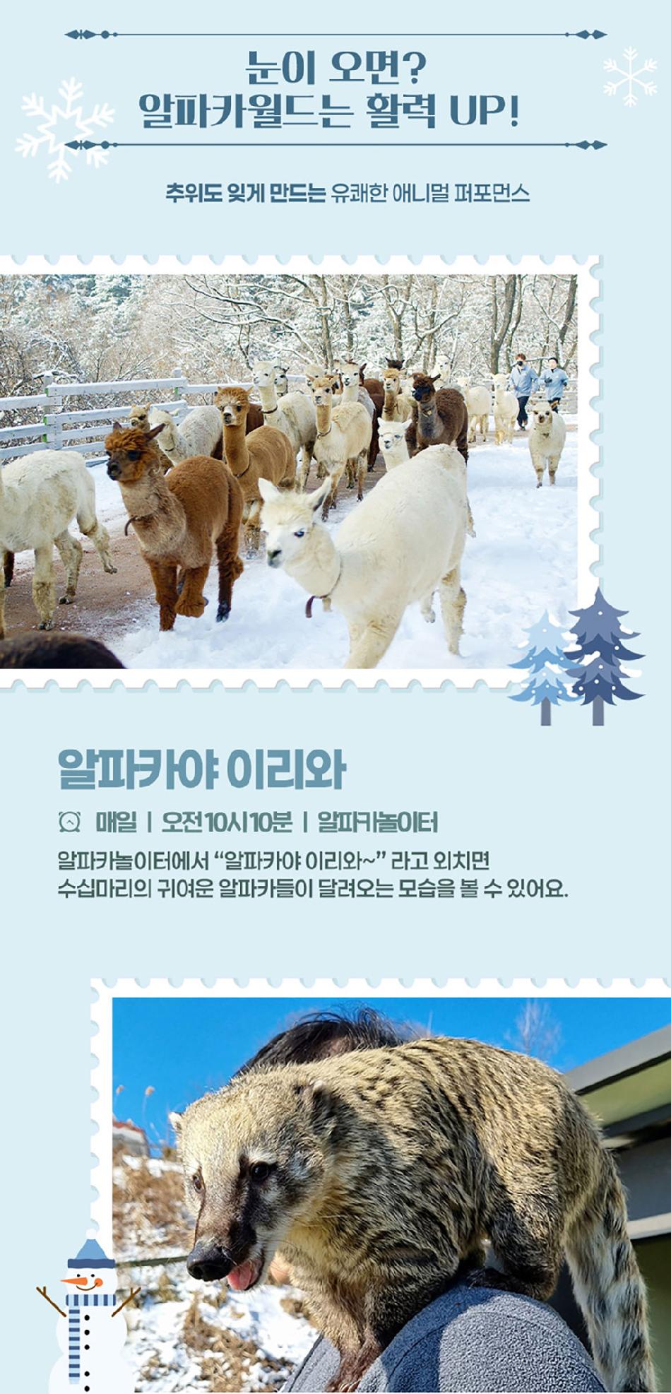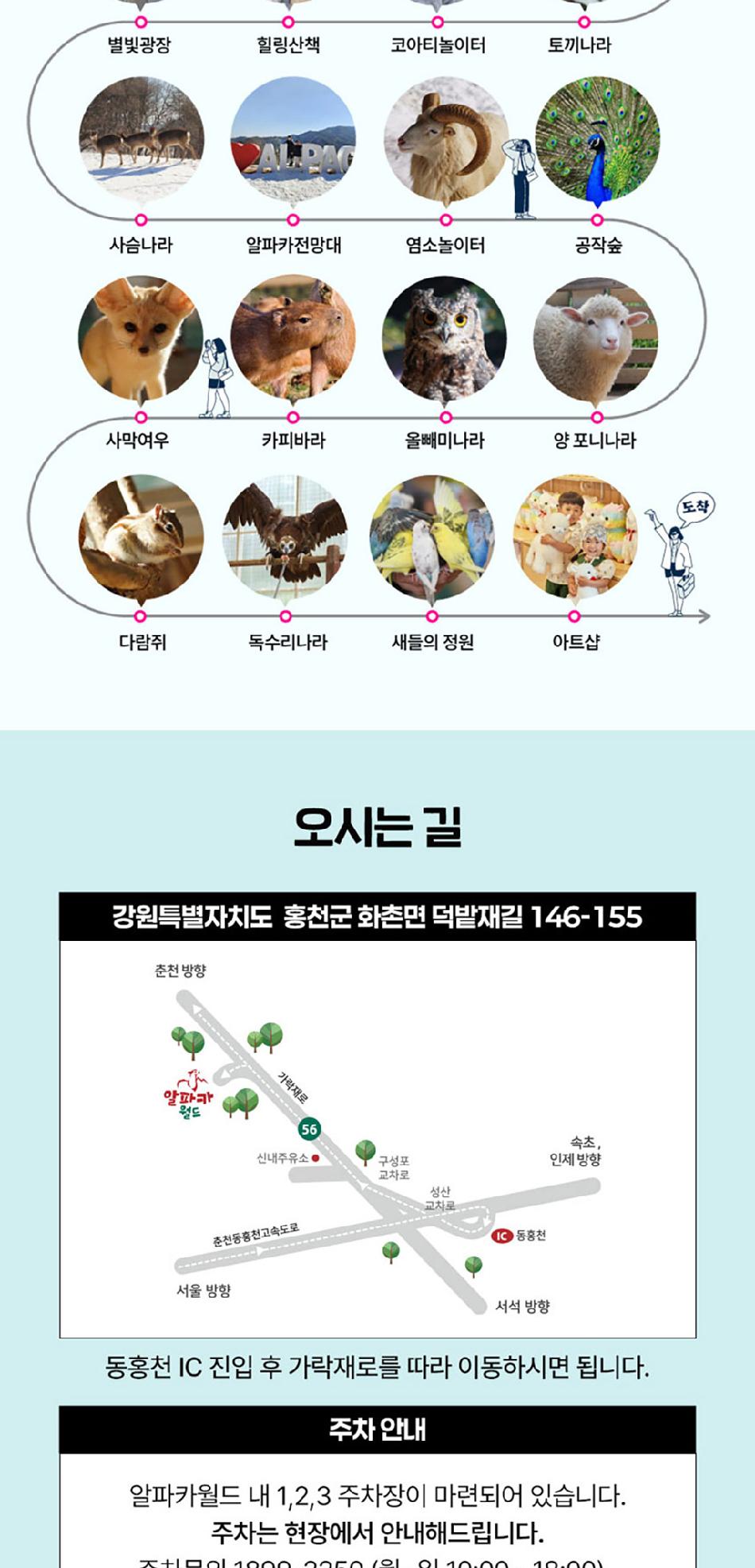 알파카월드 안내사항 * 알파카야 이리와 이벤트는 매일 오전 10시 10분에 시작이며, 10시까지 입장해주셔야 참여 가능합니다. * 동물들의 안전을 위해 음식물 및 반려동물의 출입이 제한됩니다.(맹인 안내견 제외) * 분실물 문의는 1899-2250으로 연락 주시면 신속하게 처리해 드리겠습니다. * 동물 알레르기가 있으신 분들은 체험 보다는 관람 하시는 것을 권유드립니다. * 주차공간이 충분히 마련되어 있으며 주차비는 무료입니다. * 알파카와 힐링산책은 현장에서 별도 구매가 필요합니다. * 먹이체험시, 필요한 먹이는 파카코인 구매 후 코인을 이용해 구매부탁드립니다. - (파카코인 1개당 먹이주기 체험 1회분) * 파카코인은 매표소(카드,현금 가능)/체험존파카코인교환기(현금만가능) 통해 구매 가능 - (1,000원당 파카코인1개 지급) * 경로우대 및 복지카드 소지자는 현장에서 입장권을 구매해주시기 바랍니다.