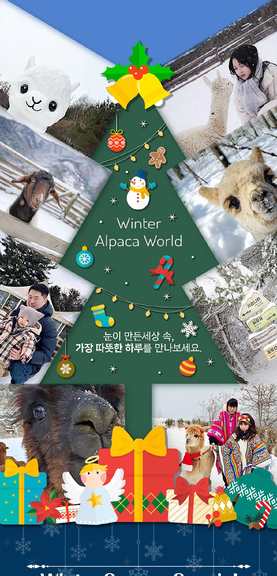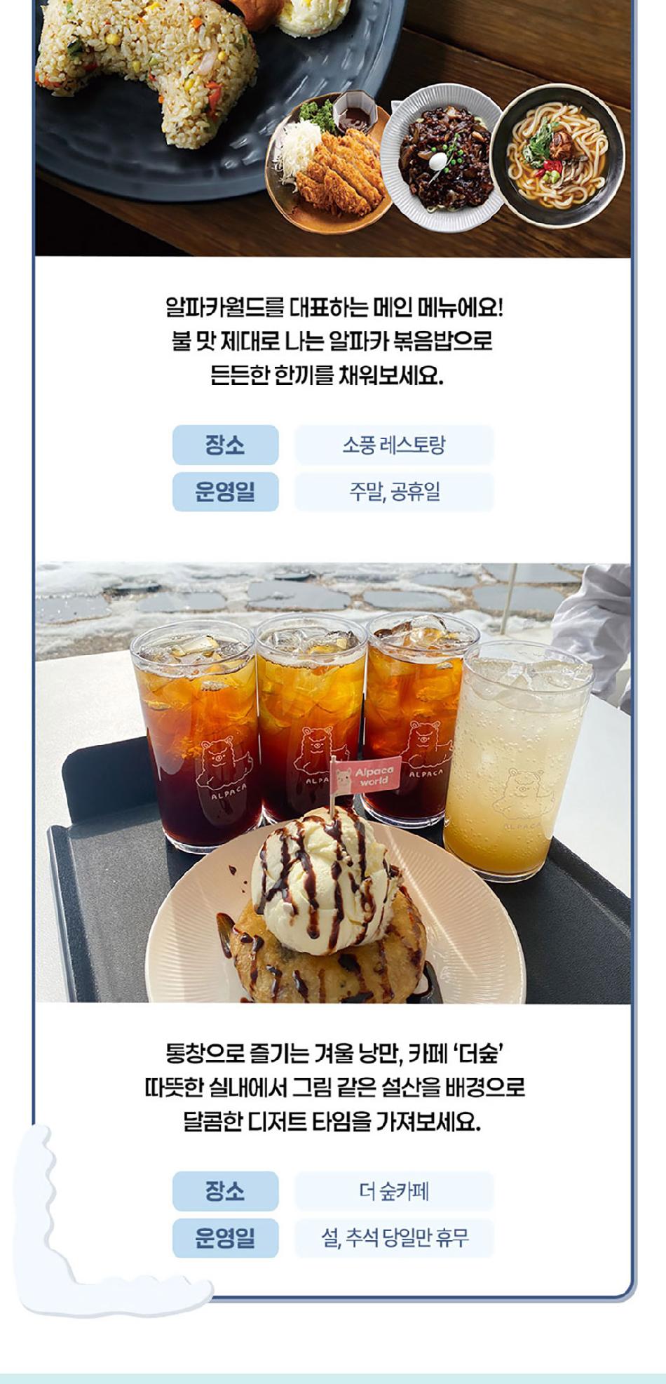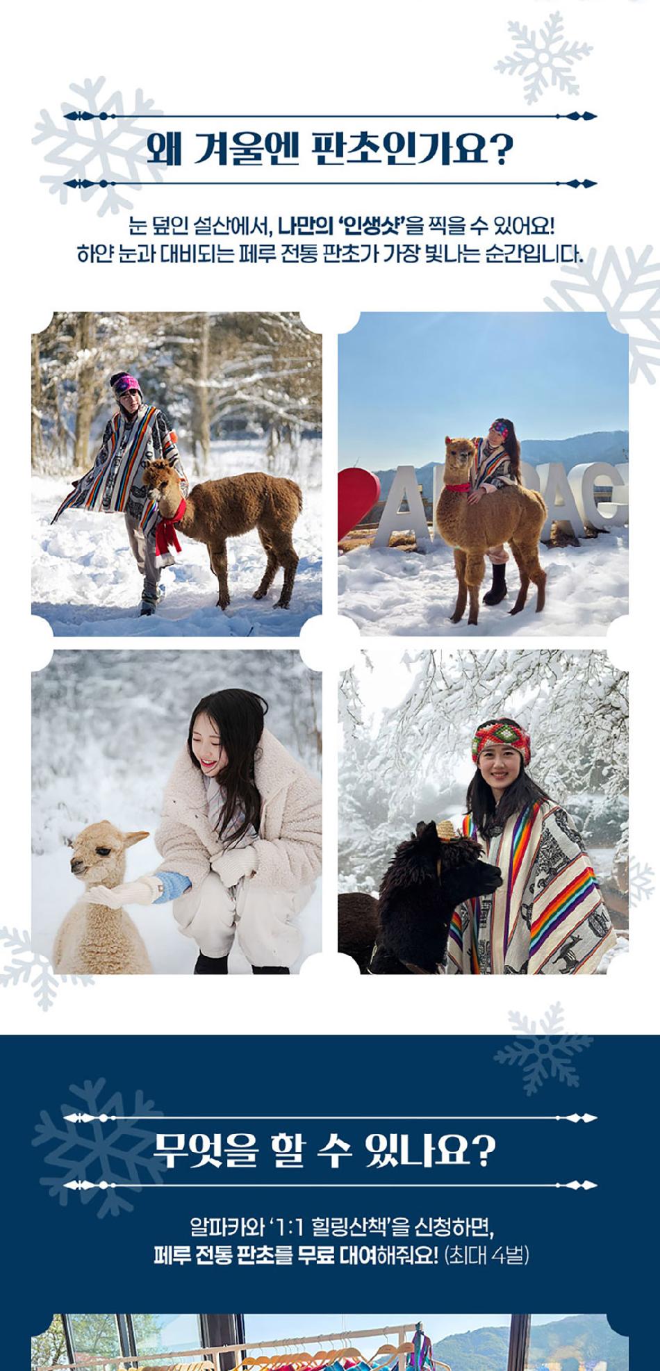 알파카월드 안내사항 * 알파카야 이리와 이벤트는 매일 오전 10시 10분에 시작이며, 10시까지 입장해주셔야 참여 가능합니다. * 동물들의 안전을 위해 음식물 및 반려동물의 출입이 제한됩니다.(맹인 안내견 제외) * 분실물 문의는 1899-2250으로 연락 주시면 신속하게 처리해 드리겠습니다. * 동물 알레르기가 있으신 분들은 체험 보다는 관람 하시는 것을 권유드립니다. * 주차공간이 충분히 마련되어 있으며 주차비는 무료입니다. * 알파카와 힐링산책은 현장에서 별도 구매가 필요합니다. * 먹이체험시, 필요한 먹이는 파카코인 구매 후 코인을 이용해 구매부탁드립니다. - (파카코인 1개당 먹이주기 체험 1회분) * 파카코인은 매표소(카드,현금 가능)/체험존파카코인교환기(현금만가능) 통해 구매 가능 - (1,000원당 파카코인1개 지급) * 경로우대 및 복지카드 소지자는 현장에서 입장권을 구매해주시기 바랍니다.