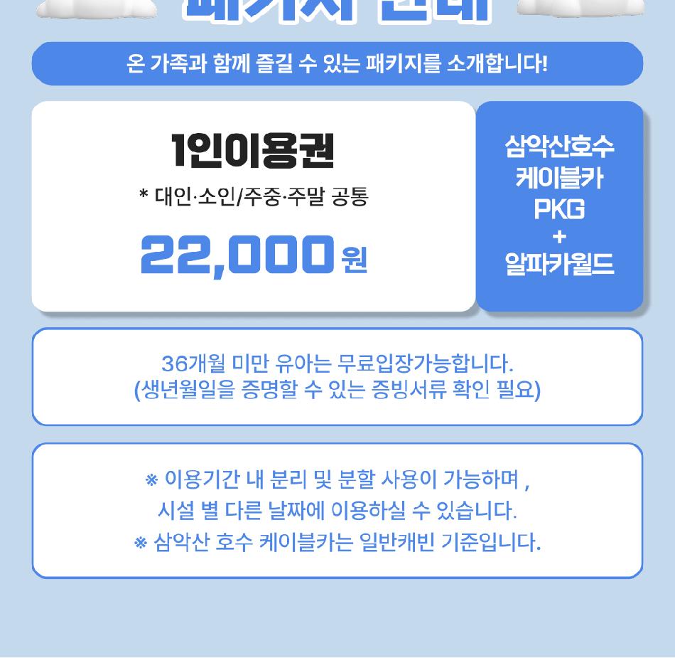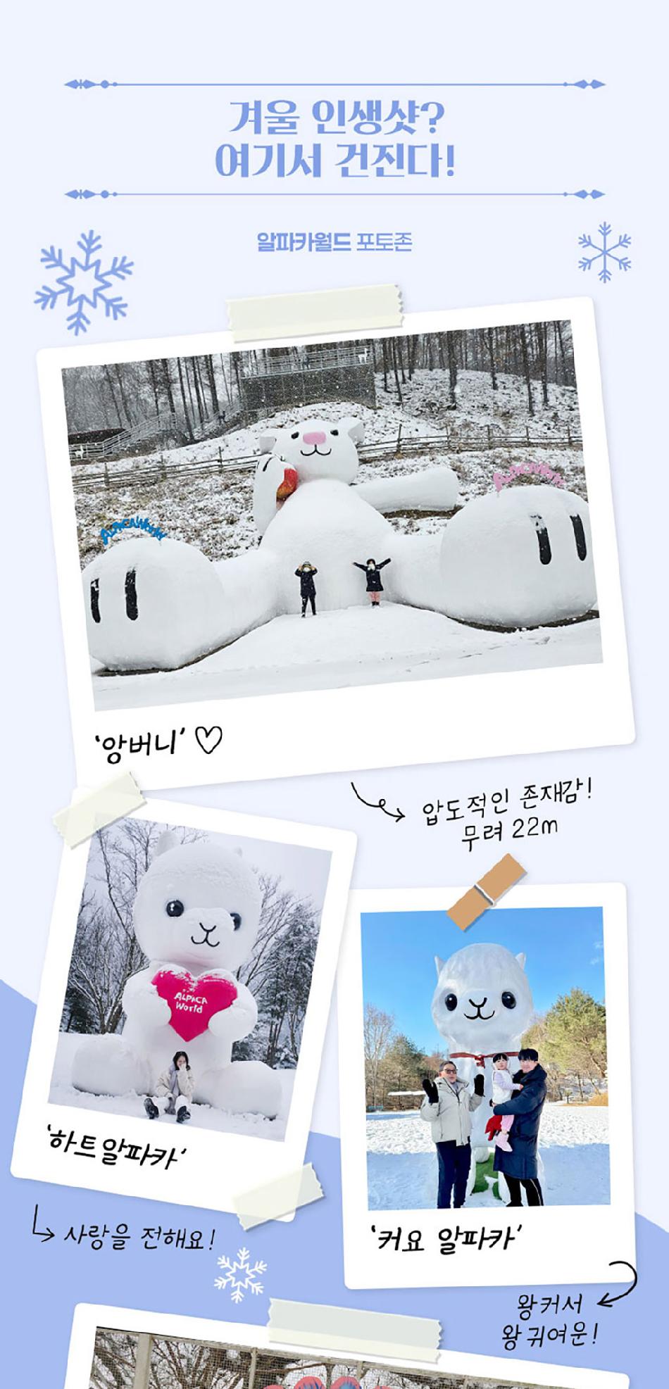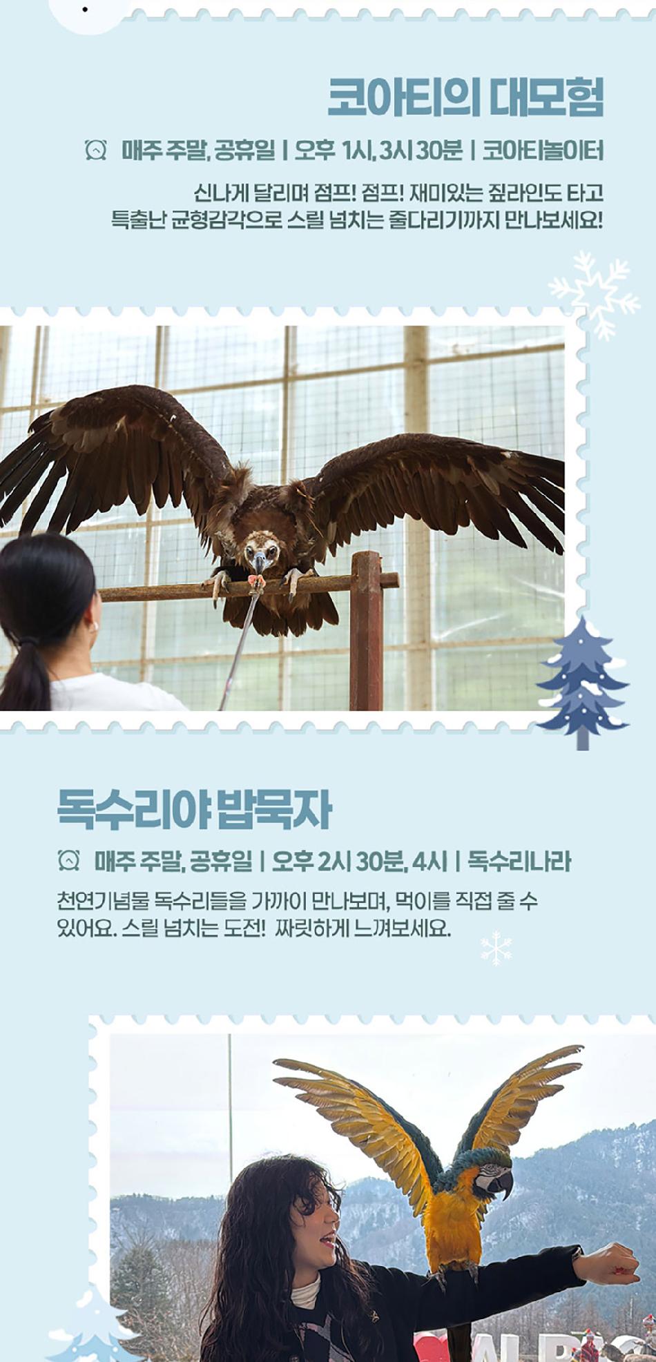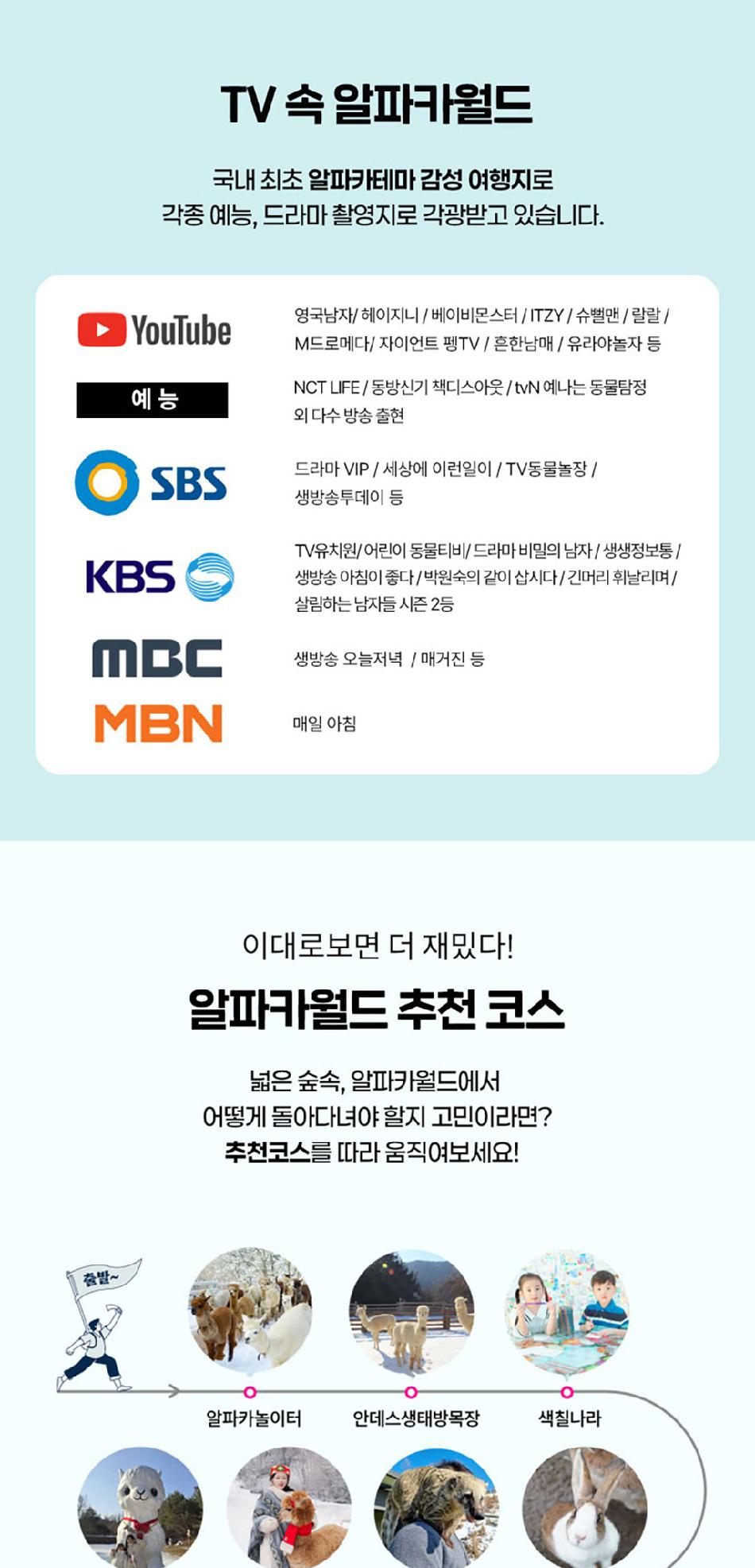 알파카월드 안내사항 * 알파카야 이리와 이벤트는 매일 오전 10시 10분에 시작이며, 10시까지 입장해주셔야 참여 가능합니다. * 동물들의 안전을 위해 음식물 및 반려동물의 출입이 제한됩니다.(맹인 안내견 제외) * 분실물 문의는 1899-2250으로 연락 주시면 신속하게 처리해 드리겠습니다. * 동물 알레르기가 있으신 분들은 체험 보다는 관람 하시는 것을 권유드립니다. * 주차공간이 충분히 마련되어 있으며 주차비는 무료입니다. * 알파카와 힐링산책은 현장에서 별도 구매가 필요합니다. * 먹이체험시, 필요한 먹이는 파카코인 구매 후 코인을 이용해 구매부탁드립니다. - (파카코인 1개당 먹이주기 체험 1회분) * 파카코인은 매표소(카드,현금 가능)/체험존파카코인교환기(현금만가능) 통해 구매 가능 - (1,000원당 파카코인1개 지급) * 경로우대 및 복지카드 소지자는 현장에서 입장권을 구매해주시기 바랍니다.