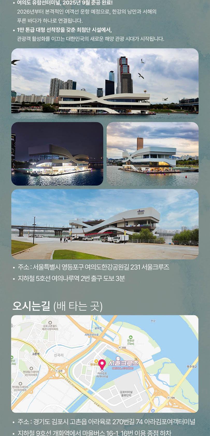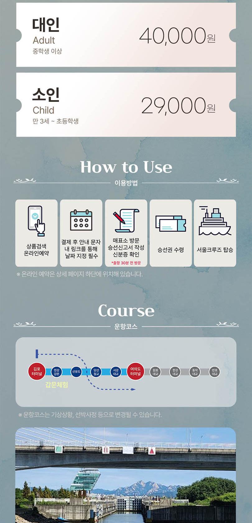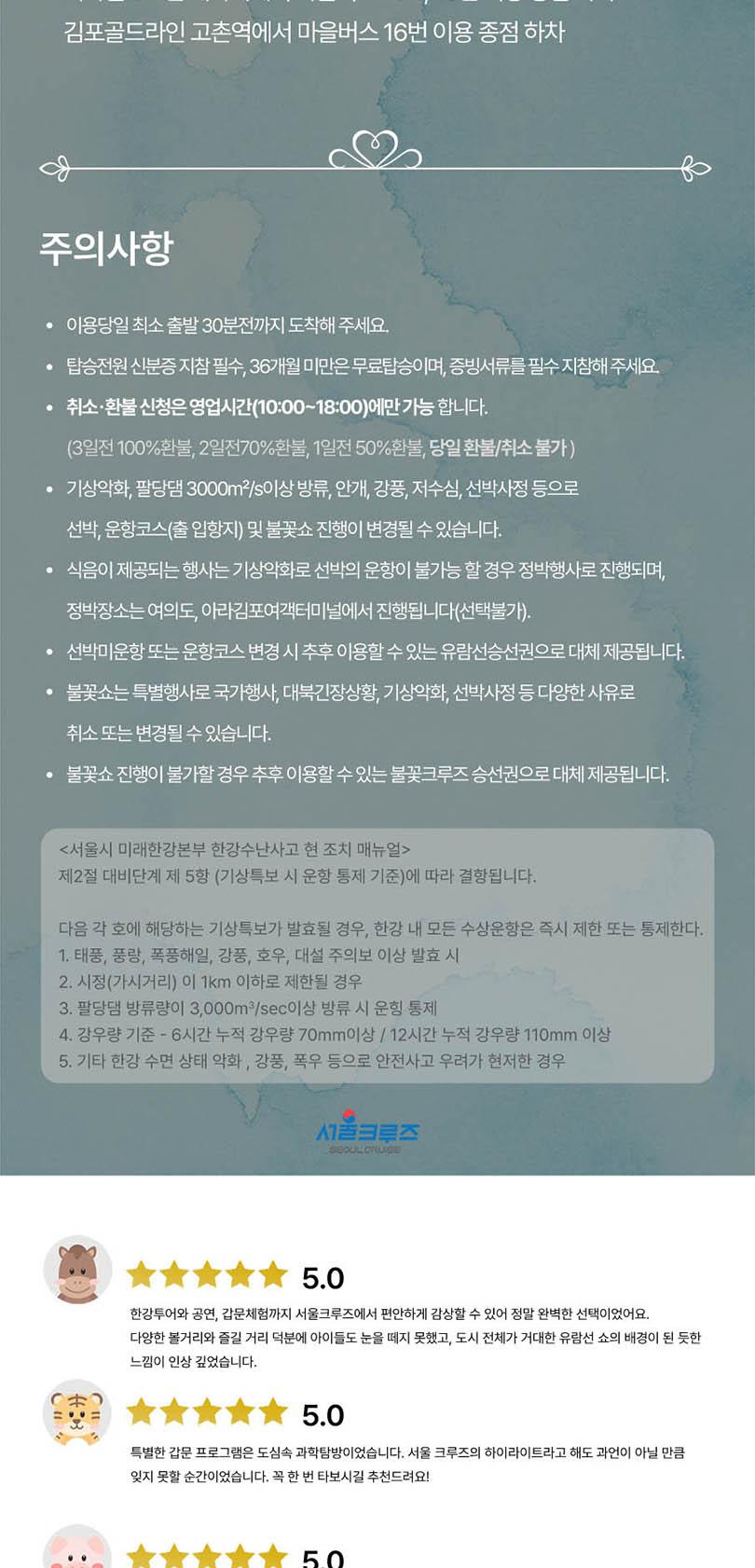 * 한강방류, 기상악화, 선박사정 등으로 한강 운항이 불가능할 경우 아라뱃길 코스로 진행되며, 이로 인한 환불 및 요금 인하는 없습니다.