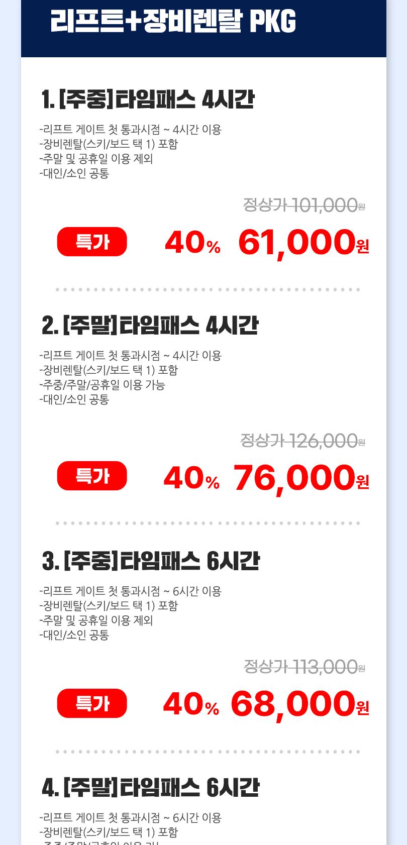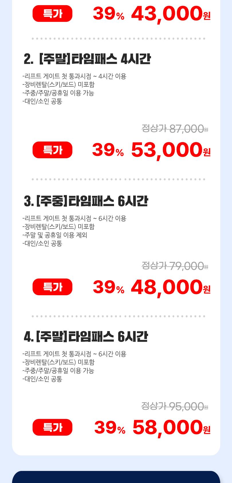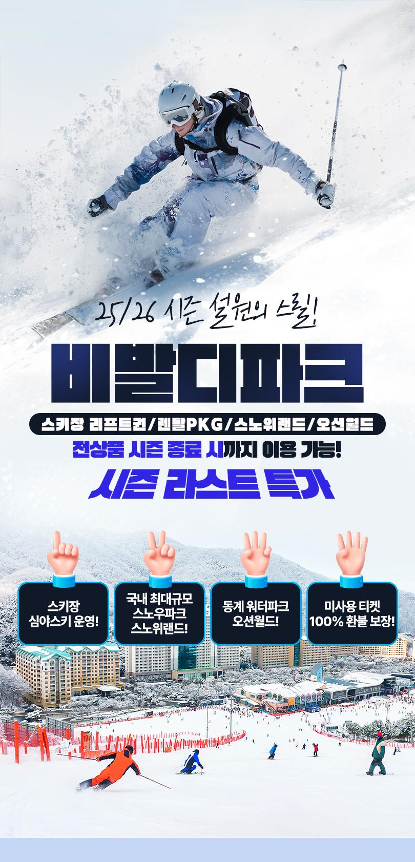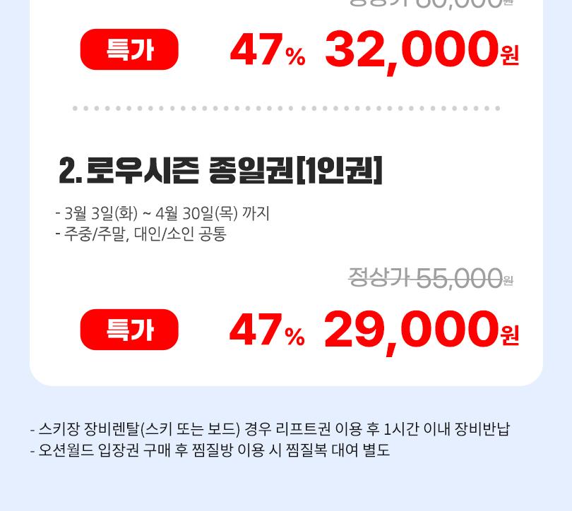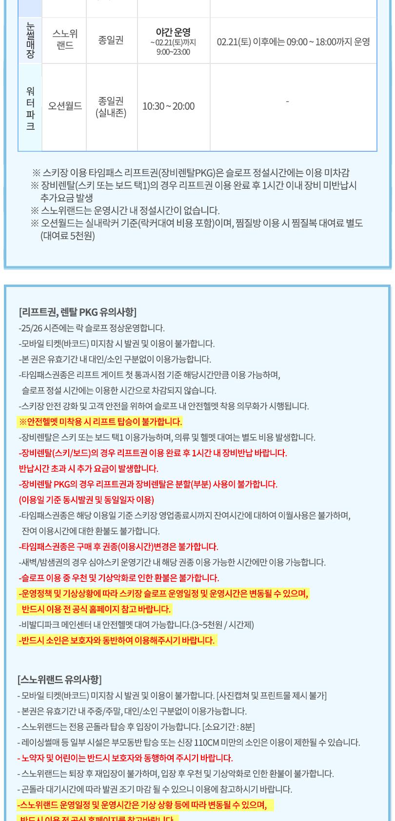 * 판매기간 : ~ 2026.03.02 * 유효기간 : 리프트,렌탈 PKG,스노위랜드 : 구매 후 익일 ~ 시즌 종료일까지 / 오션월드: 구매 후 익일 ~ 26년 03월 02일까지
