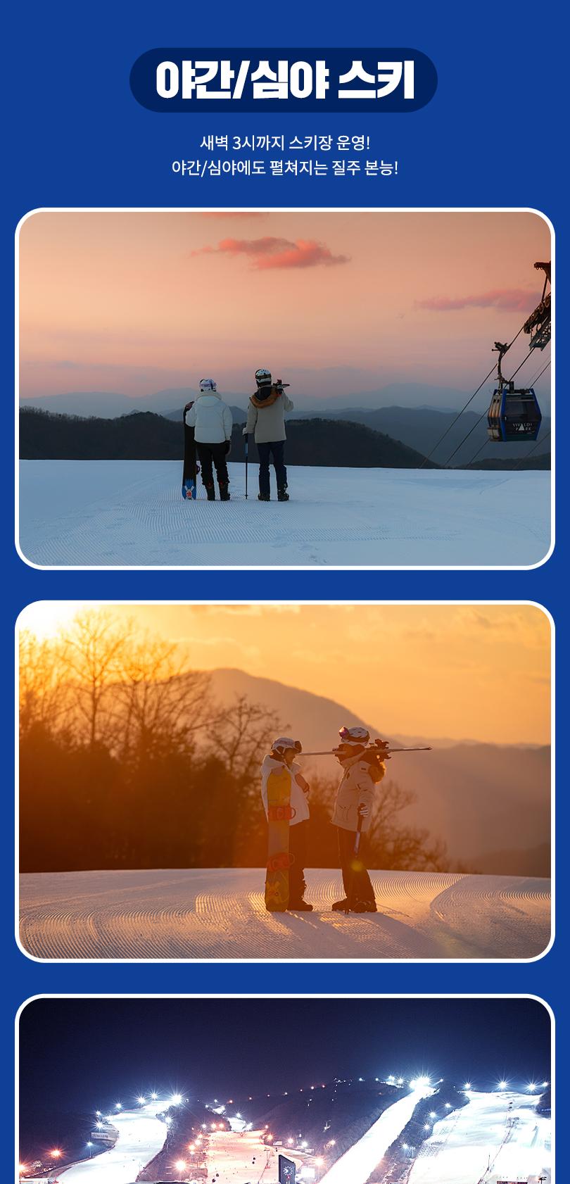 운영시간 * ■심야스키 운영 : ~2026.02.22(일)까지 - 오전 9시 ~ 새벽 3시(슬로프 정설 17:30 ~ 19:00) - 단, 2026.02.21(토)→02.22(일) 넘어가는 새벽 정상 운영 * ■야간스키 운영 : ~ 2026.03.01(일) - 오전 9시 ~ 오후 23시 * ■스노위랜드 야간운영 : ~2026.02.21(토)까지 - 오전 9시 ~ 오후 23시 * ※ 운영일정 및 운영시간은 운영정책, 제설상황 및 기상상황 등에 따라 변동될 수 있으며, 이용 전 반드시 공식 홈페이지 운영상황 사전 참고 바랍니다.