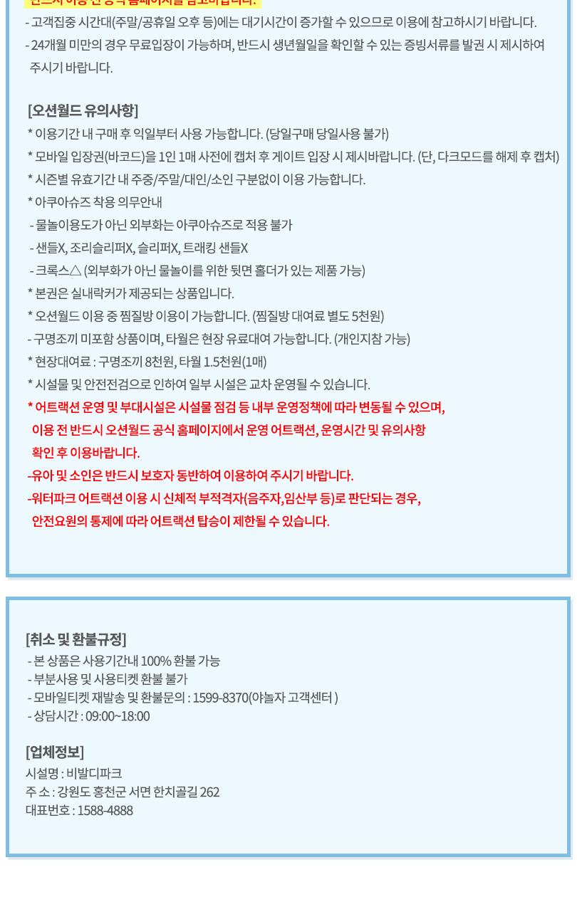 - 미사용티켓은 변경 및 취소환불처리가 불가합니다. - 상품유효기간과는 무관하게 지정날짜에만 이용하셔야하며 지정날짜외 입장시에는 별도 문의부탁드립니다.