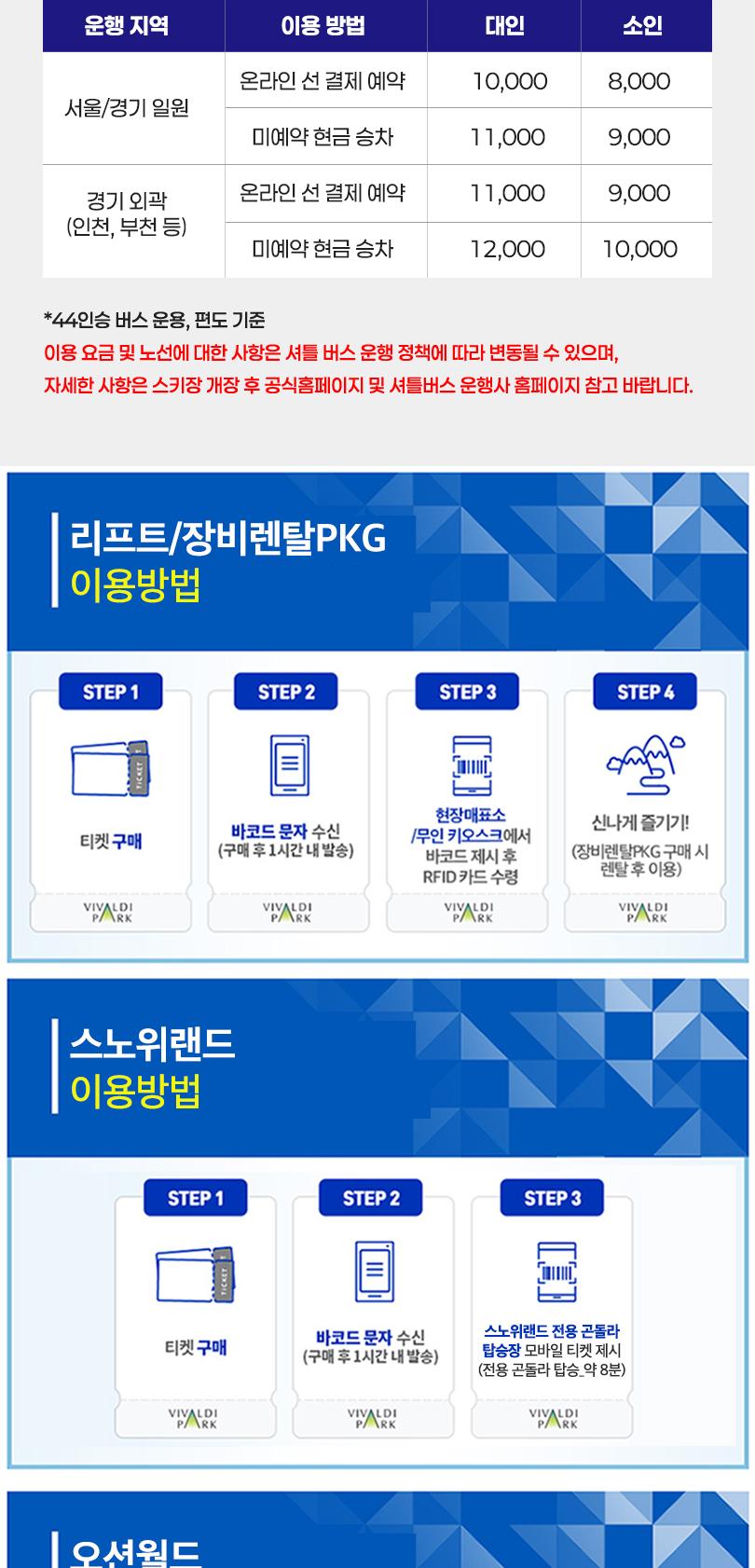 리프트, 렌탈 PKG 이용방법 * ① 스키장 개장 후 메인센터 현장 매표소/무인키오스크 매표소 방문 (모바일티켓 필수지참) * ② 모바일 티켓(바코드) 매표소 제시 및 리프트권(RFID), 렌탈권 수령 후 이용