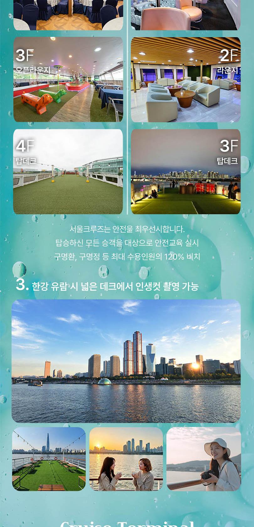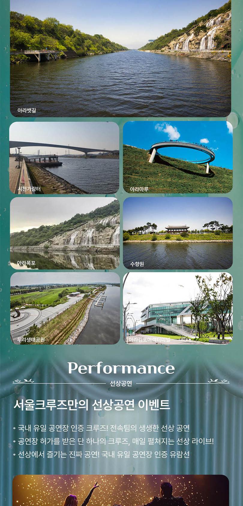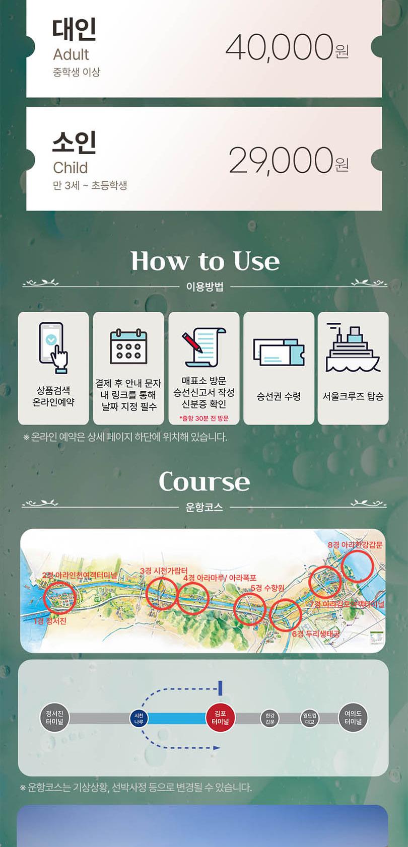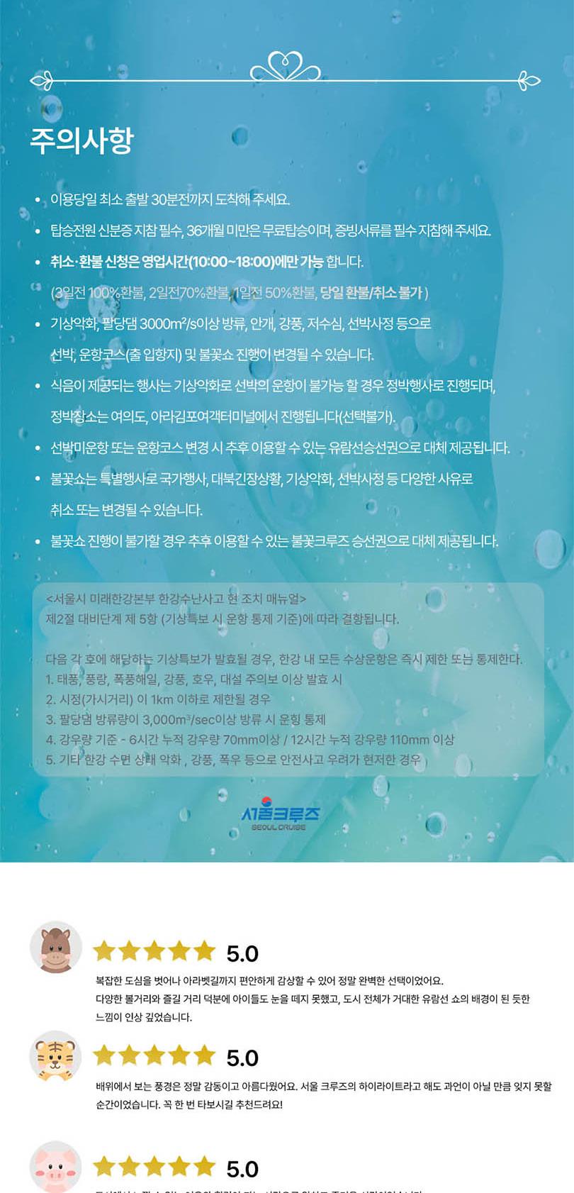 * 한강방류, 기상악화, 선박사정 등으로 한강 운항이 불가능할 경우 아라뱃길 코스로 진행되며, 이로 인한 환불 및 요금 인하는 없습니다.