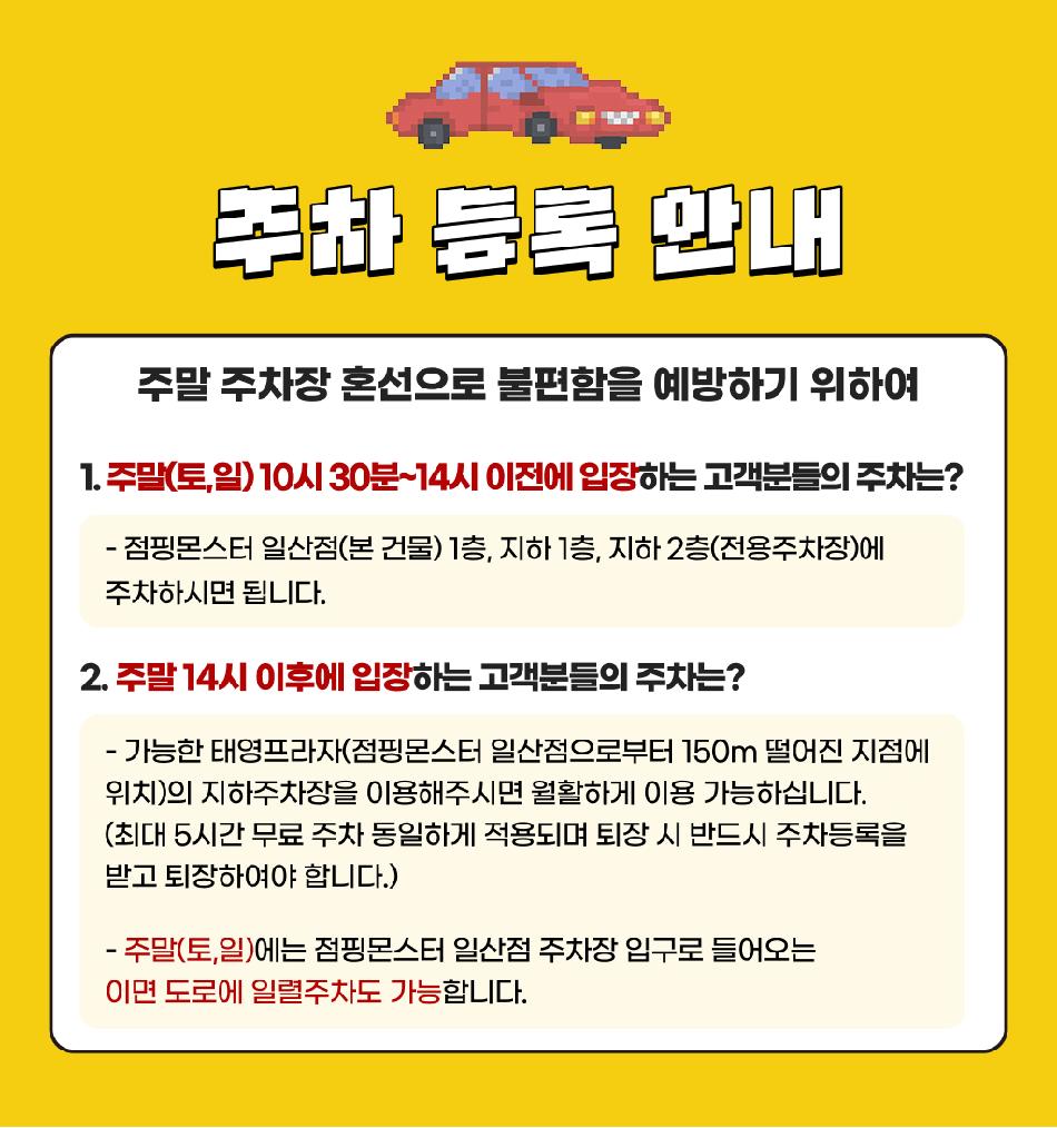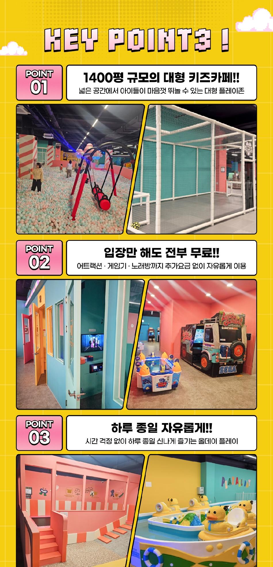 * 어린이는 필히 보호자(만 19세 이상)와 함께 입장하셔야 합니다. * 외부 음식 반입 불가합니다. * 키즈카페에서는 아이들의 안전을 위해 보호자께서는 양말을 신고 입장 부탁드립니다. * 보호자는 시간 관계없이 1회 입장요금이 있습니다. 어린이는 14세(초등학생)까지 기준입니다. * 파티룸 및 패밀리룸 대관은 현장문의 바랍니다. * 미열이나 전염성이 있는 질병을 앓고 있는 아이는 입장이 불가합니다. * 12개월~24개월 미만 유아는 10,000원에 종일 이용 가능합니다.(현장 결제) * 주차는 최대 5시간이며, 상가 내 다른 업장을 이용할 경우 시간이 차감됩니다. 자세한 사항은 판매페이지 참고 부탁드립니다.