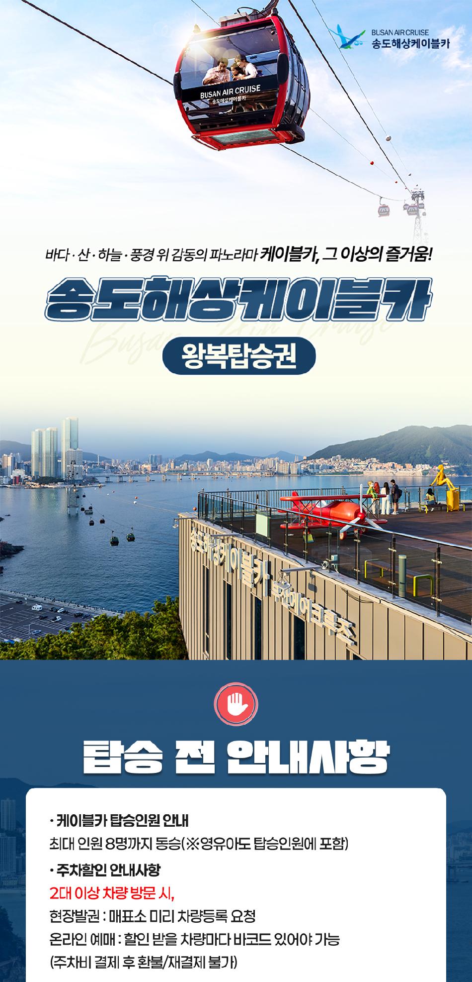 * ※ 송도 케이블카 이용 시 최소 1일 전 티켓 구매 필수입니다. * ※ 자세한 내용은 구매 후 바코드 내 시설별 상세 정보 참조 바랍니다. * ※ 운영정보는 현장 상황에 따라 변동될 수 있습니다.