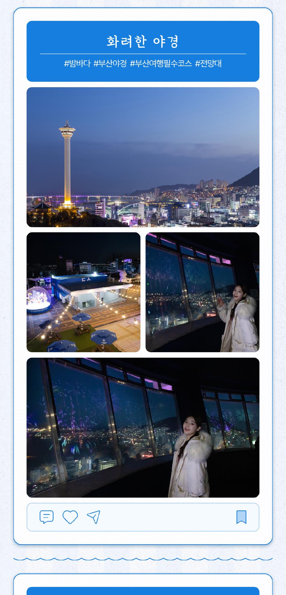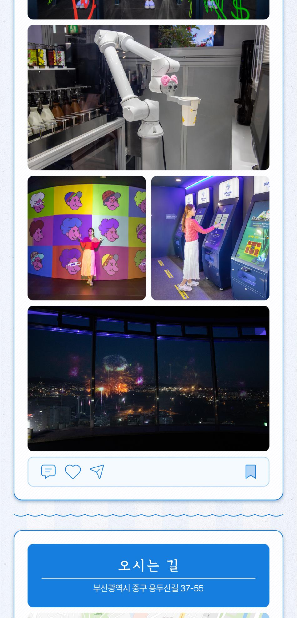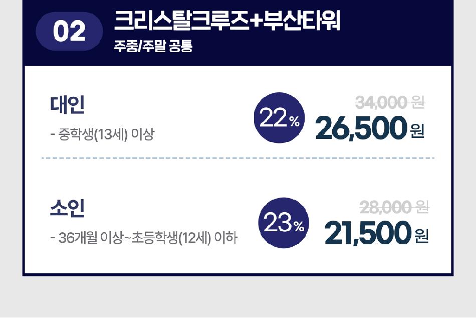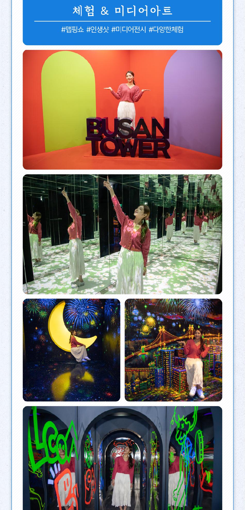 부산타워 유의사항 * 1. 불꽃맵핑쇼는 하절기(20:00~21:50), 동절기(19:30~21:50) 10분 간격으로 운영됩니다. * 2. 본 티켓은 개인 소비자 전용 상품입니다. 여행사 및 단체 등의 사전 협의 없이 상업적으로 사용할 경우, 티켓 회수 및 법적 책임이 따를 수 있습니다. * 3. 반려동물 입장 및 외부 음식물 반입은 제한됩니다. * 4. 시설 점검으로 인한 일부 시설 이용에 제한이 있을 수 있습니다.