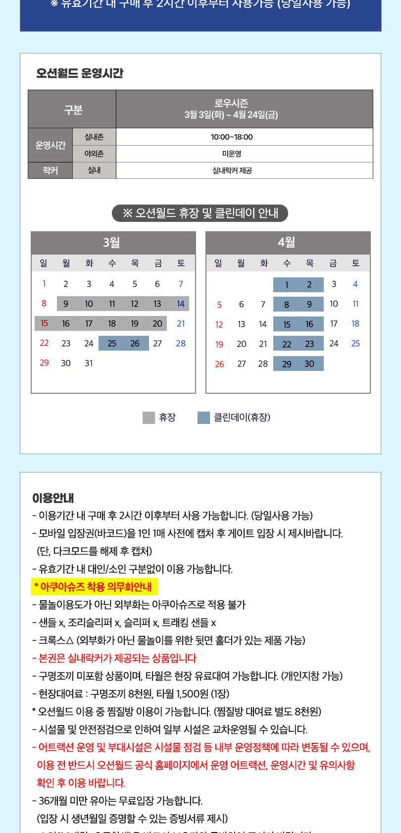 * ※ 3/9~3/20 기간 오션월드 휴장 (시설물 보수) * ※ 3/25~4/30 기간 내 매주 수요일,목요일 휴장 (클린데이)