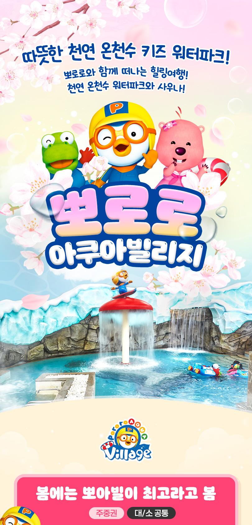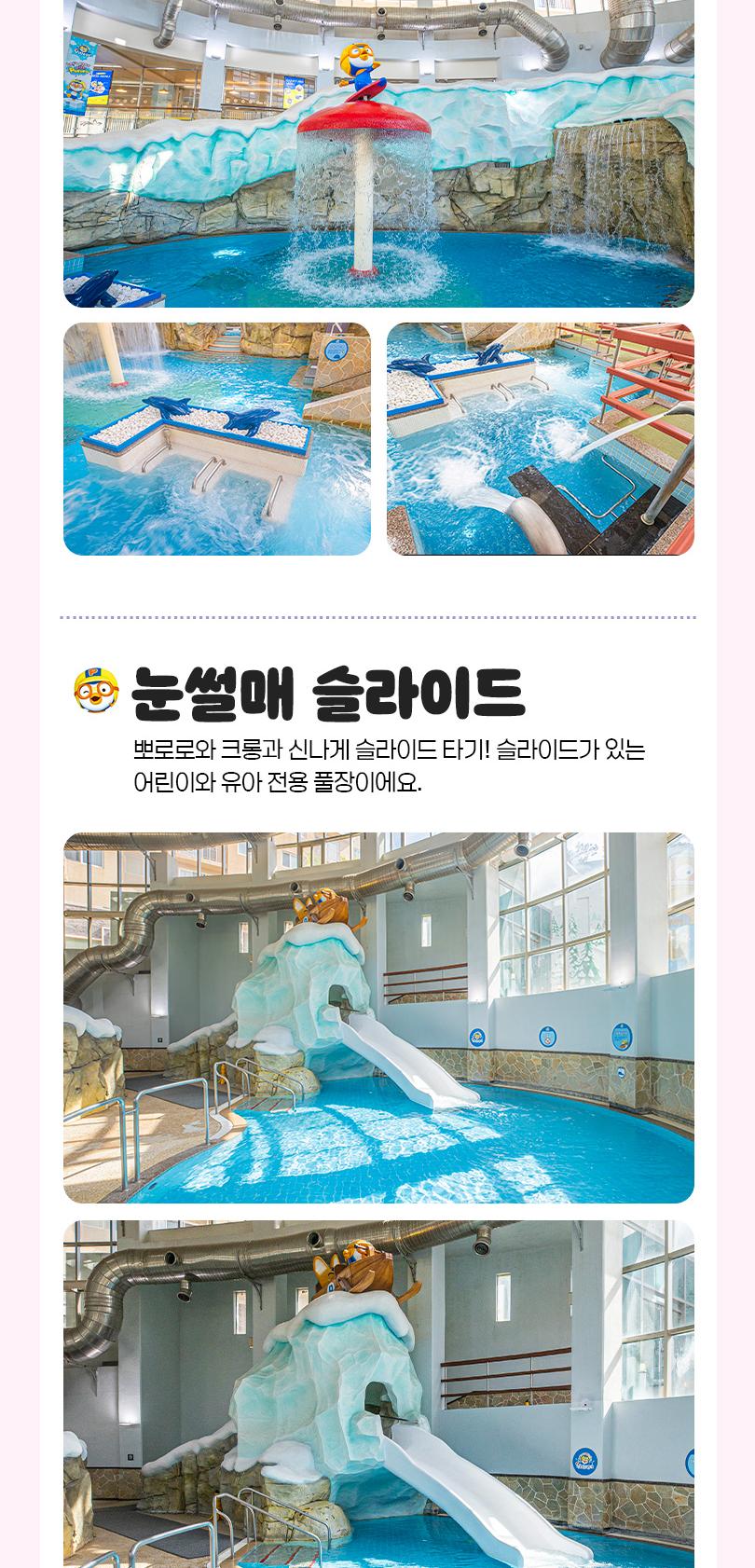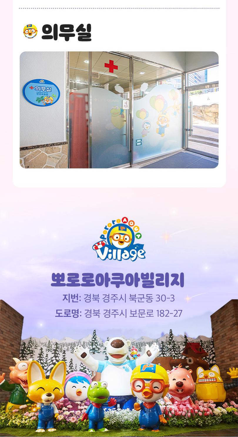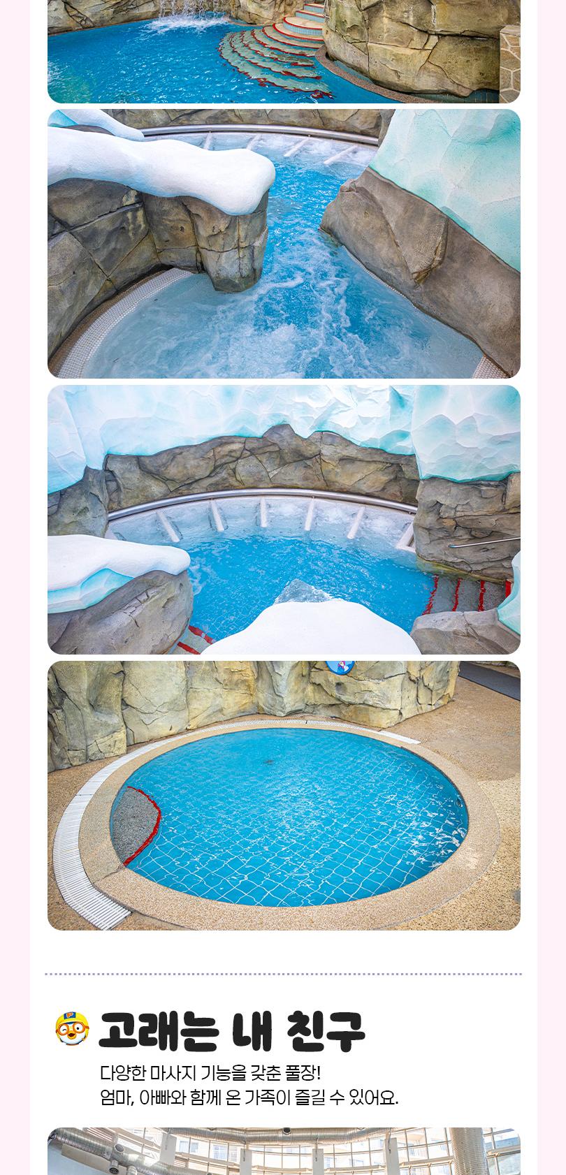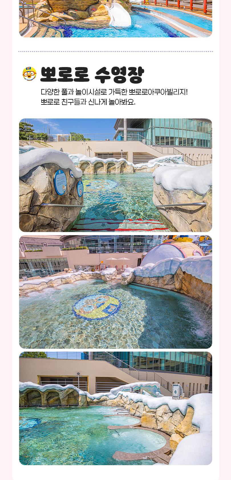 * 홈페이지 : https://www.hanwharesort.co.kr/irsweb/resort3/tpark/tp_intro.do?tp_cd=0300 * 운영시간 - 매일 : 10:00~18:00 * 휴무일 : 연중무휴 * 주차 : 무료 * 운영시간 및 이용 가능 시설은 변동될 수 있으니, 방문 전 뽀로로아쿠아빌리지 홈페이지 확인 부탁드립니다.