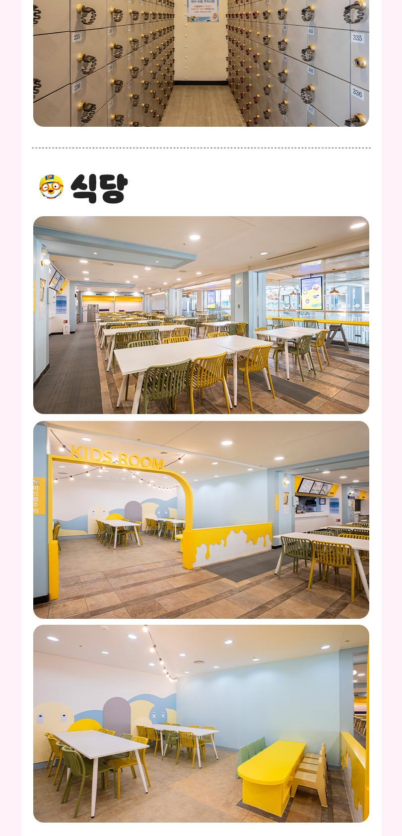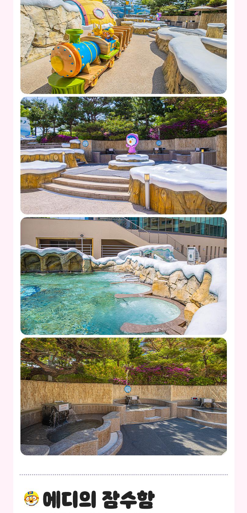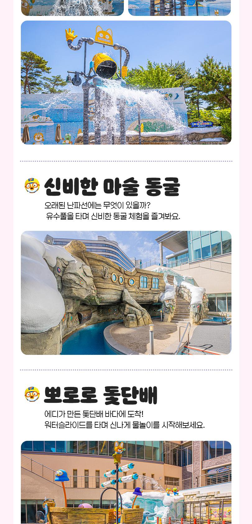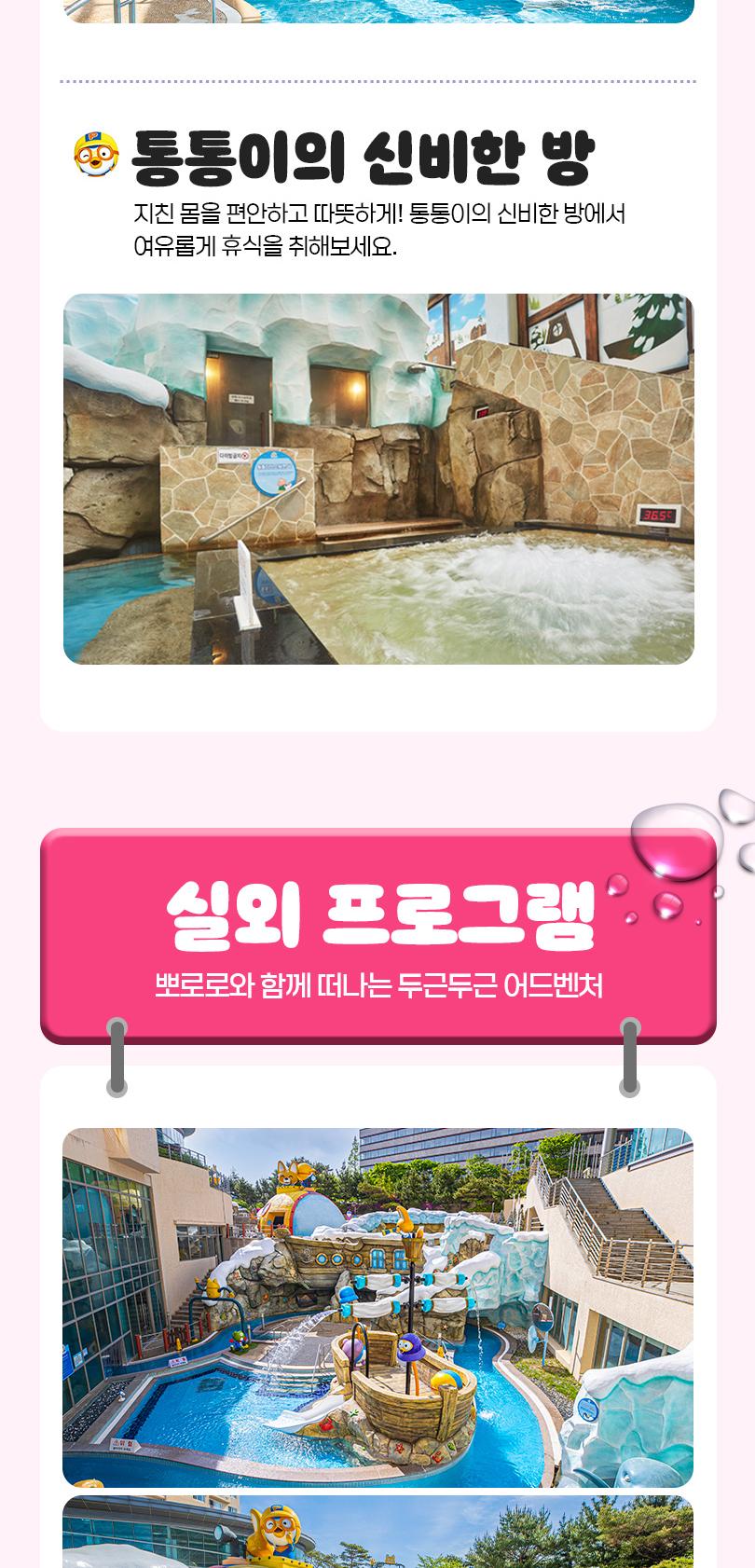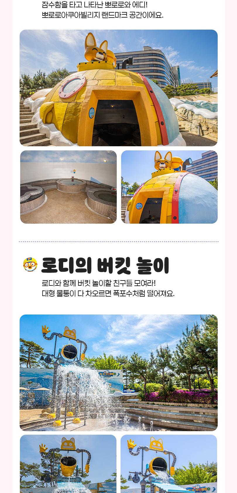 * 홈페이지 : https://www.hanwharesort.co.kr/irsweb/resort3/tpark/tp_intro.do?tp_cd=0300 * 운영시간 - 매일 : 10:00~18:00 * 휴무일 : 연중무휴 * 주차 : 무료 * 운영시간 및 이용 가능 시설은 변동될 수 있으니, 방문 전 뽀로로아쿠아빌리지 홈페이지 확인 부탁드립니다.