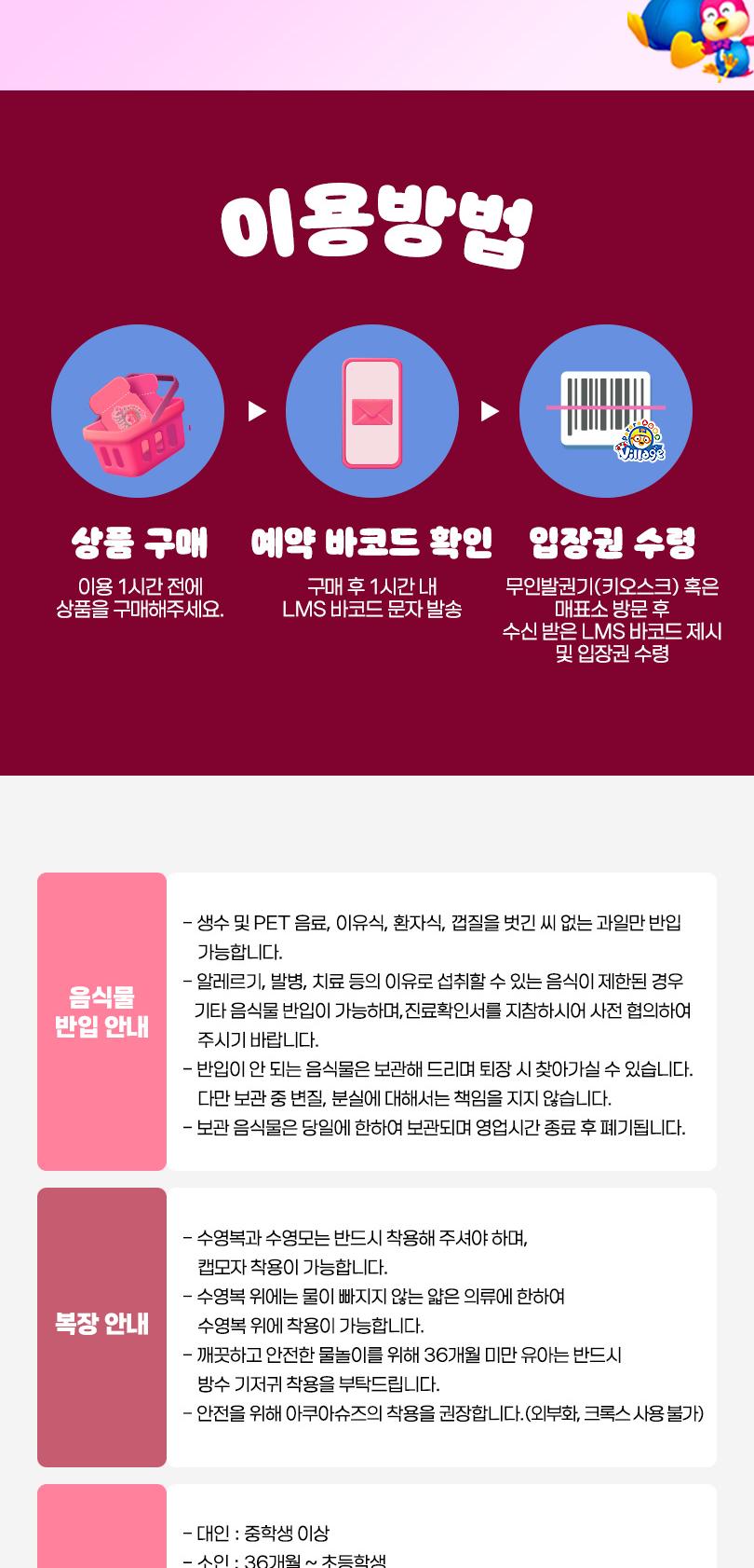 * 1. 이용 1시간전 상품구매 * 2. 예약 바코드 확인(구매 후 1시간 내 LMS 바코드 문자 발송) * 3. 무인발권기(키오스크) 혹은 매표소 방문 후 수신 받은 LMS 바코드 제시 및 입장권 수령 * 4. 뽀로로아쿠아빌리지 즐기기!