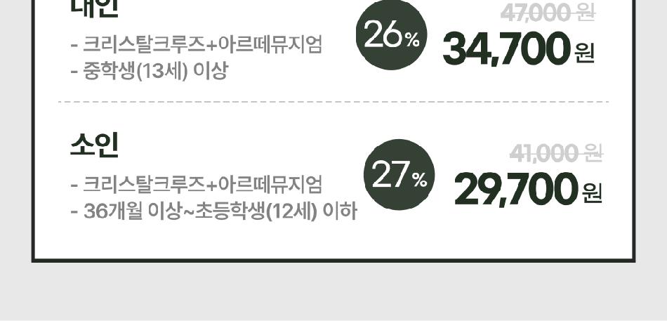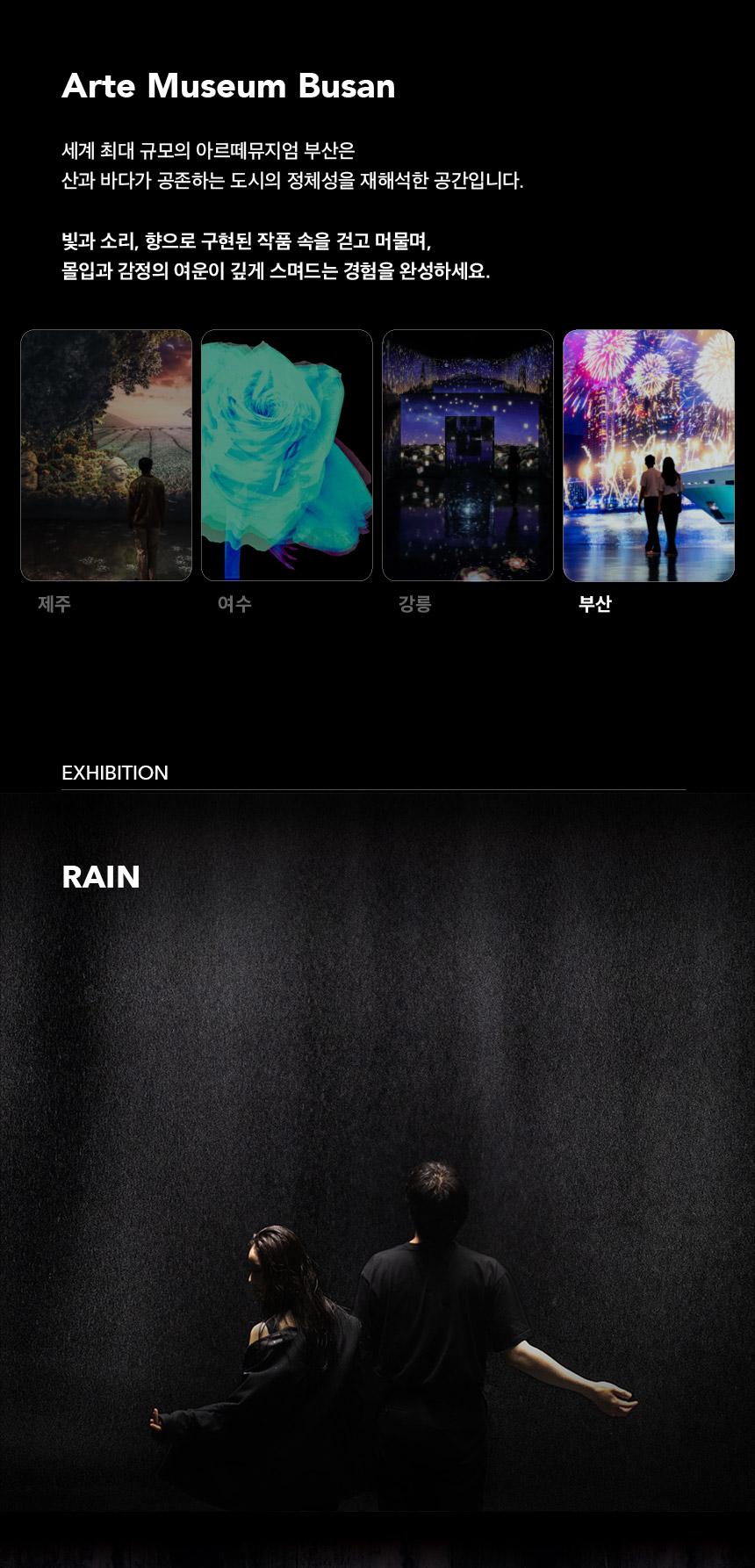 아르떼뮤지엄부산 유의사항 * 퇴장 후 재입장 불가 * 현장에서 별도의 티켓으로 교환 후 입장 * 전시관 운영 상황에 따라 일부 전시 작품이 변경될 수 있습니다.? * 20인 이상 단체 방문은 현장(1899-5008)으로 유선 문의 부탁드립니다. * 현장 상황에 따라 입장 대기가 발생할 수 있습니다. * 휠체어 이용 시, 바닥면이 거울로 되어 있는 일부 전시관 관람이 제한됩니다. - (좁은 바퀴 폭으로 인한 하중 집중으로 거울 파손 및 사고 방지를 위하여 제한되는 점 양해 부탁드립니다.)