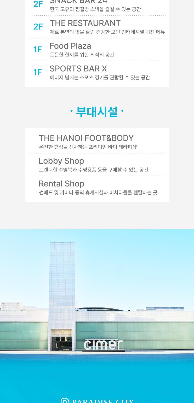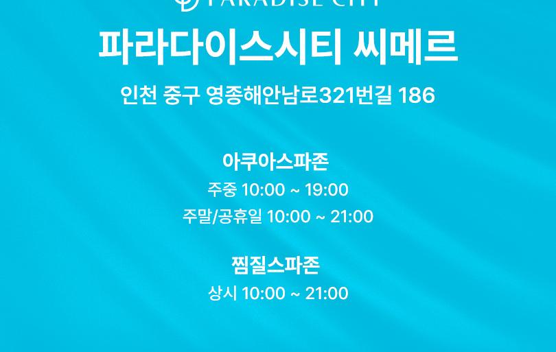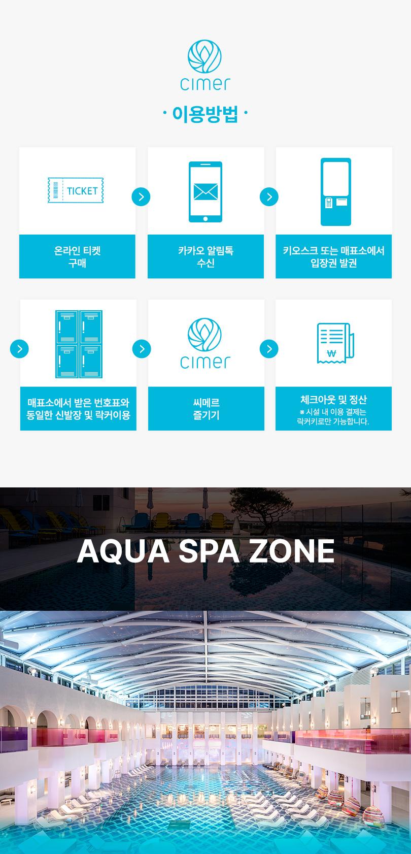 * 이용 시간은 아쿠아스파(+찜질스파 포함) 최대 6시간이며, 이용 시간 초과 시에는 시간당 10,000원의 추가요금이 발생합니다. (24년 3월 1일부터 적용) * 매표소에서 입장권 발권 후 10분 이내에 신발장 이용 필수입니다 (시간 초과 시 신발장은 자동 잠김 처리됩니다.) * 아쿠아스파존은 수영복 이외 복장으로 풀 이용 금지이며, 찜질스파존은 대여 찜질복 및 운동복 외 이용 금지입니다. * 입장료 외 모든 결제는 락커키로 결제 가능하며, 퇴장 전 1층 정산소에서 조회 후 후불결제해주시기 바랍니다. * 아쿠아스파존의 경우 현장 상황에 따라 소인 이용 가능 시간이 변경될 수 있습니다. * 씨메르 슬라이드는 신장 1.3M 이상의 고객만 이용 가능합니다. * 락커 수량이 한정되어 있어 특정일(성수기 시즌 및 연휴, 주말, 공휴일)의 경우 입장 지연 및 입장 제한이 있을 수 있습니다. (입장 제한 시 순차적으로 입장이 가능합니다.) * 대관 행사 진행 시 시설 이용이 제한 될 수 있으니 공지사항을 확인해주시기 바랍니다. * 휴대전화를 포함한 촬영 장비로 락커 내에서의 촬영은 불가하며, 상업적 목적의 촬영은 이용이 제한 될 수 있습니다.